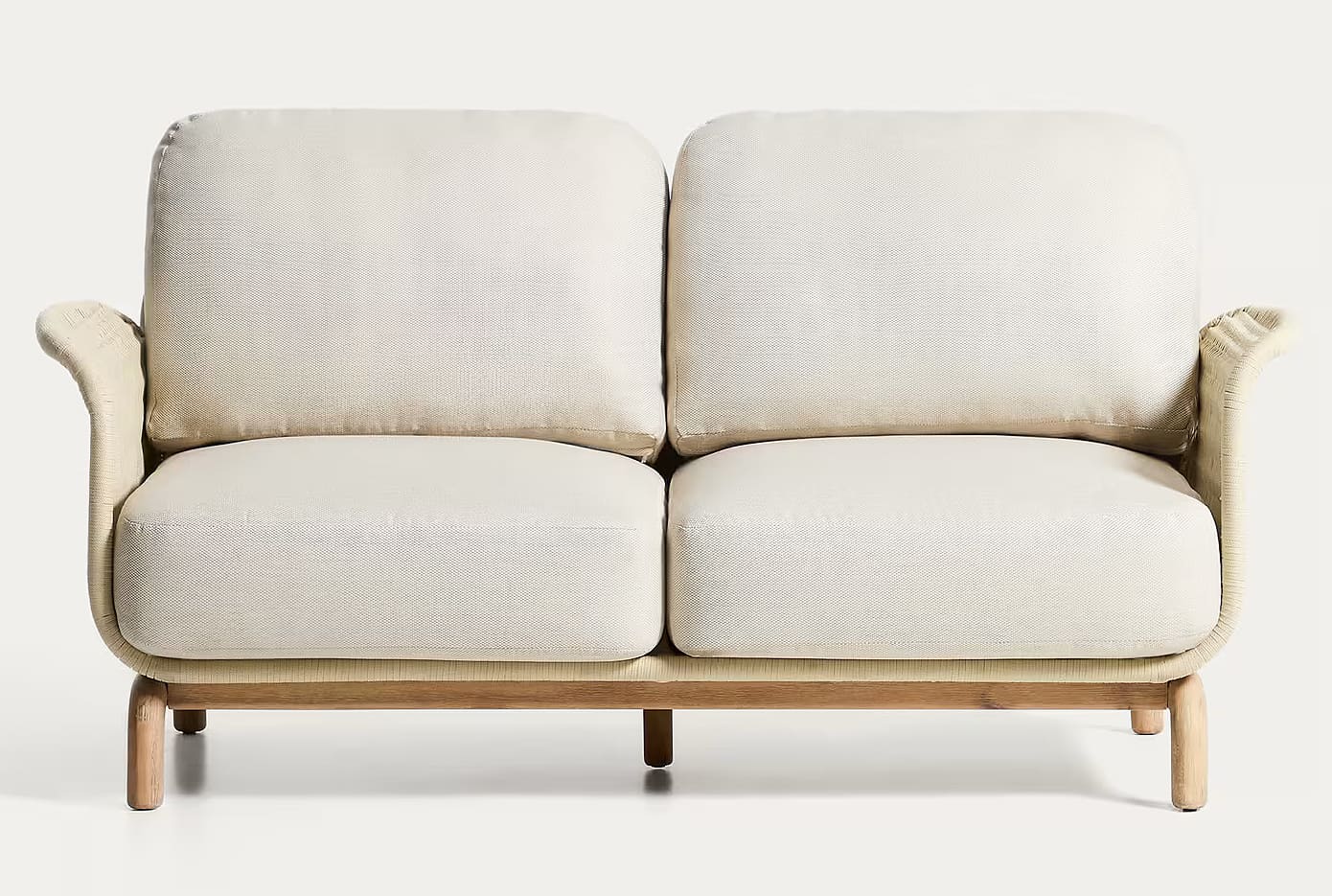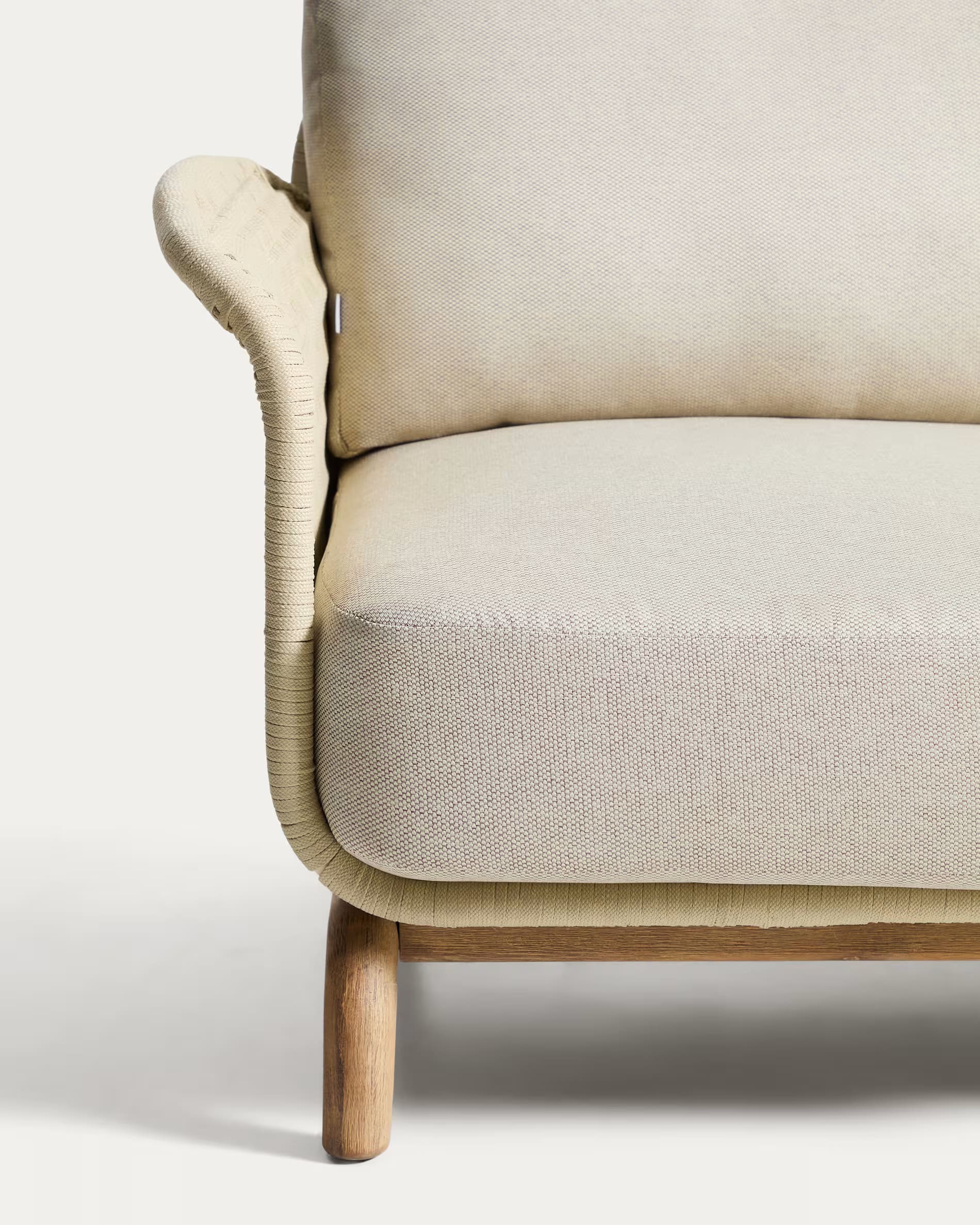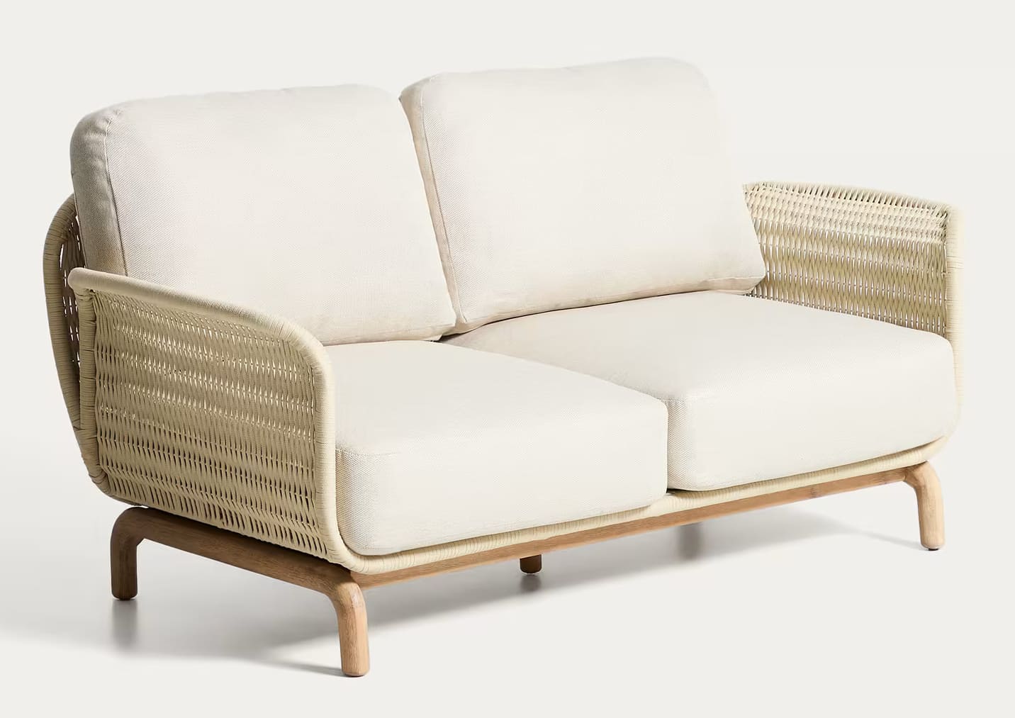 Уличный 2-местный диван Kave Home Alipa массив акации / плетеный шнур экрю 165 см (FSC 100%) — элегантное дизайнерское решение, которое сочетает природные материалы, комфорт и современную эстетику, гармонично дополняя пространство террасы, сада или стильного интерьера дома.