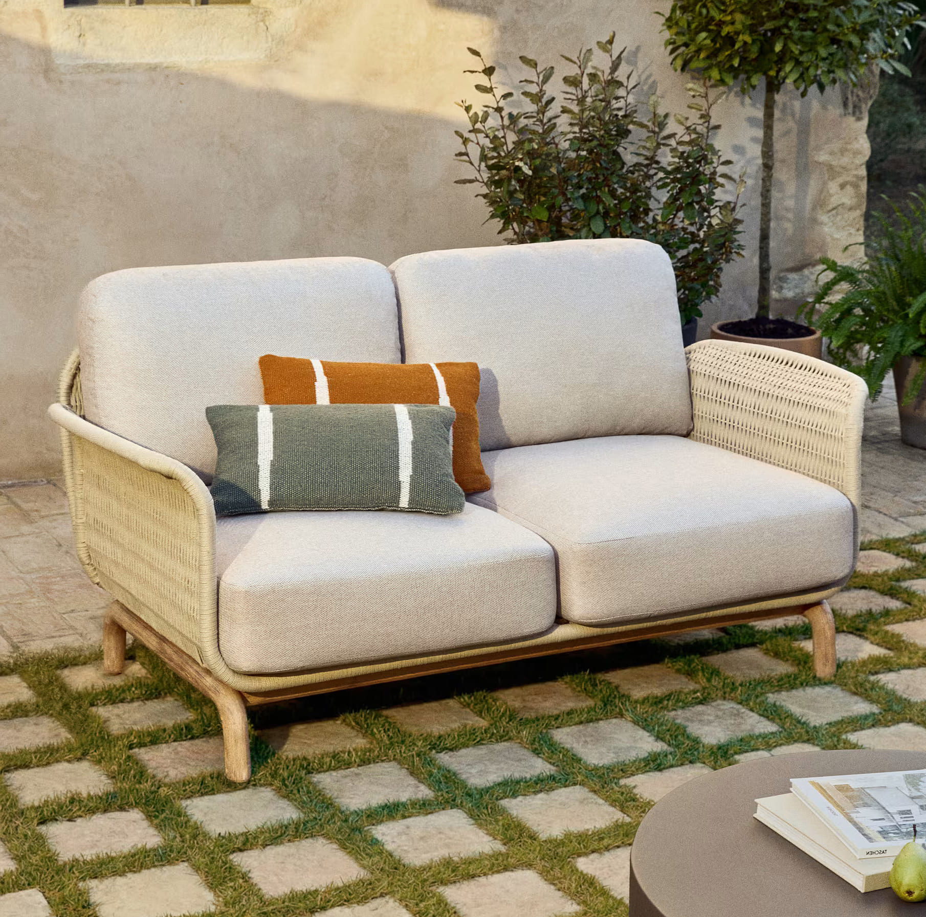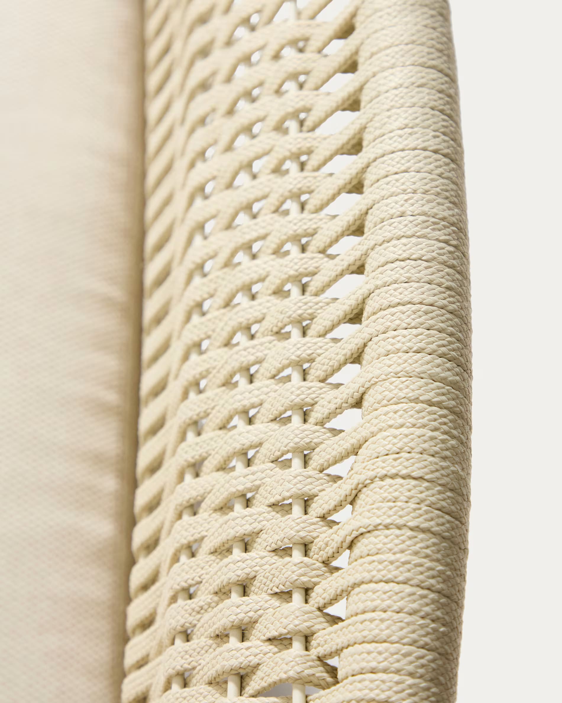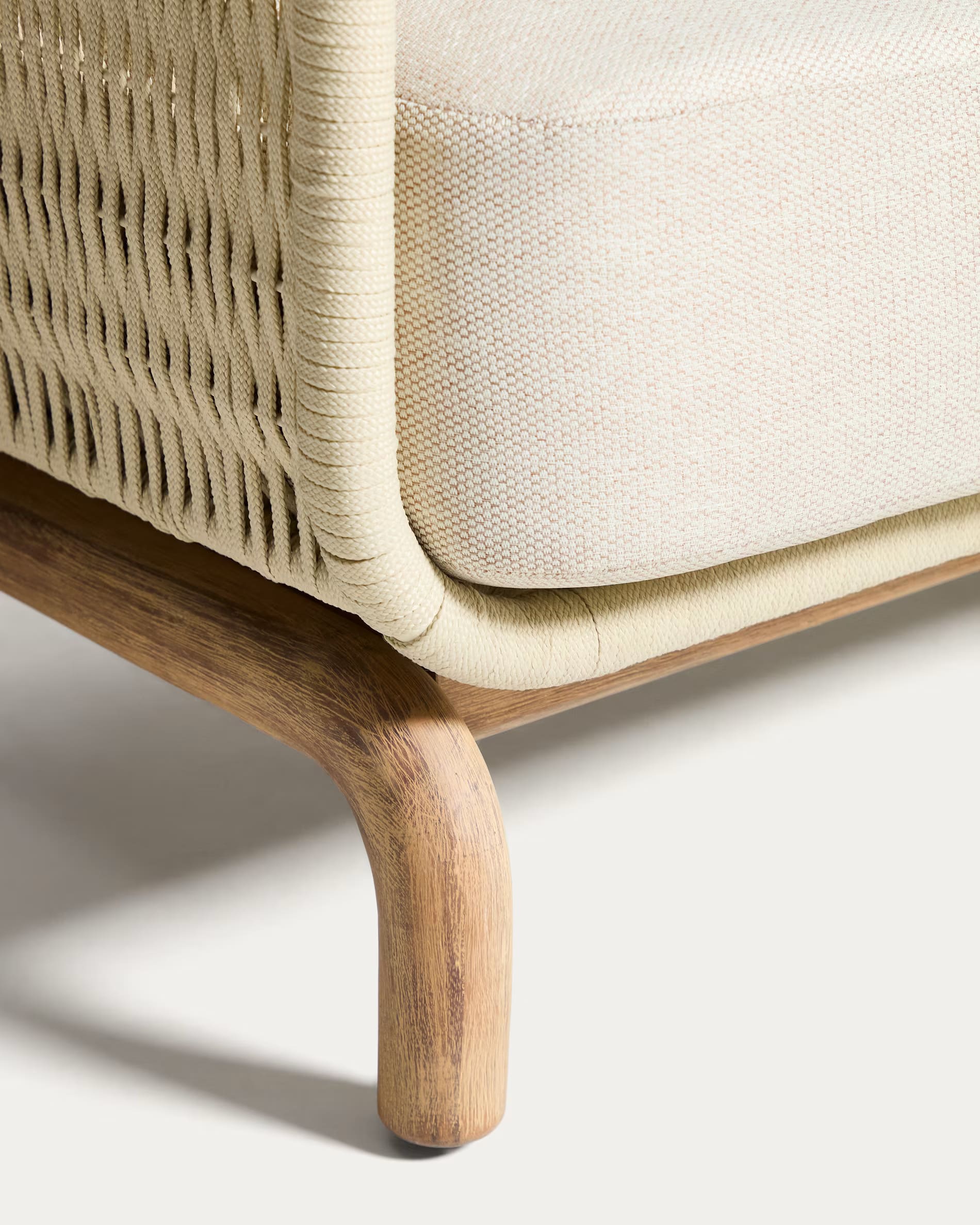 Уличный 2-местный диван Kave Home Alipa массив акации / плетеный шнур экрю 165 см (FSC 100%) — элегантное дизайнерское решение, которое сочетает природные материалы, комфорт и современную эстетику, гармонично дополняя пространство террасы, сада или стильного интерьера дома.