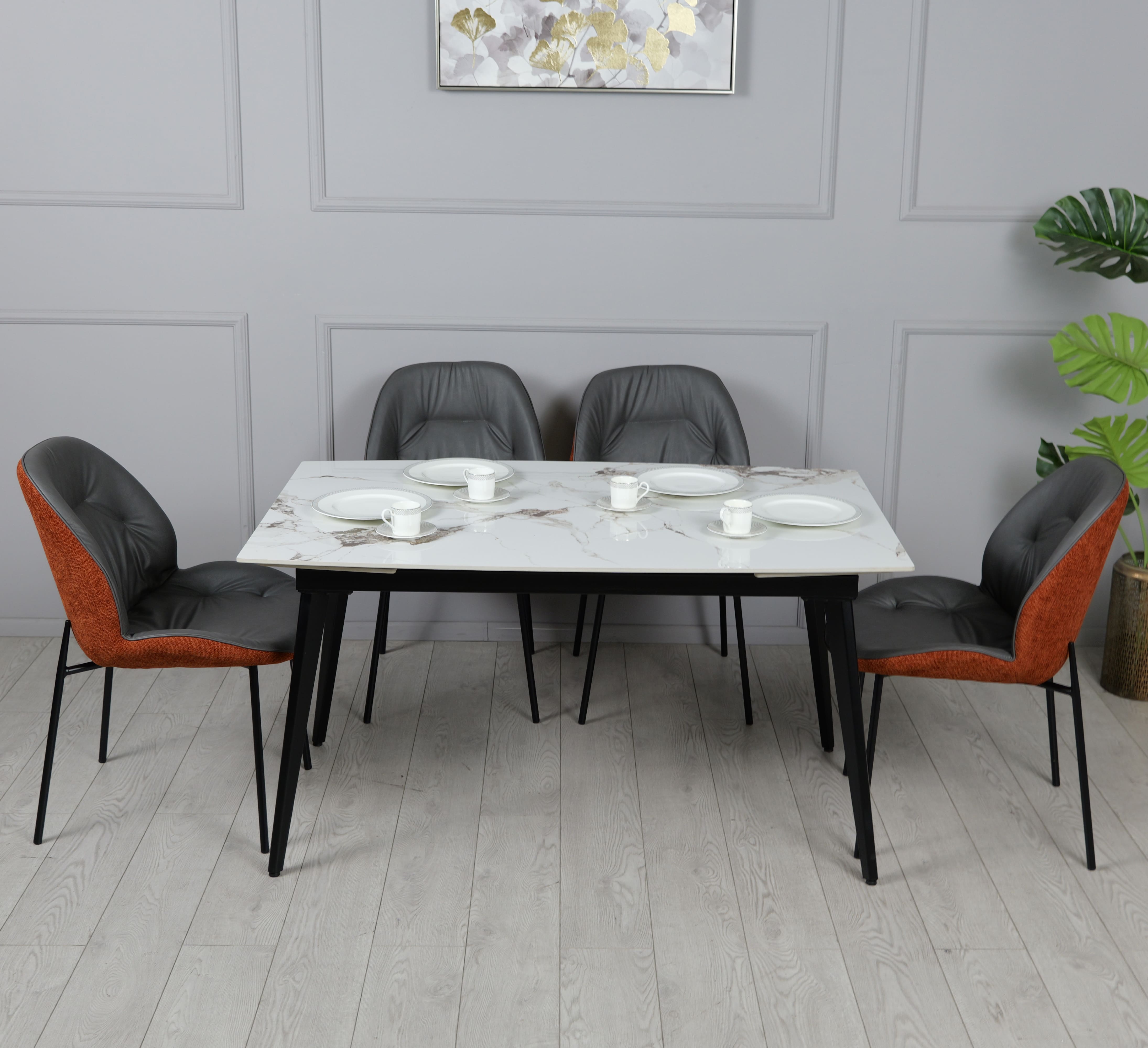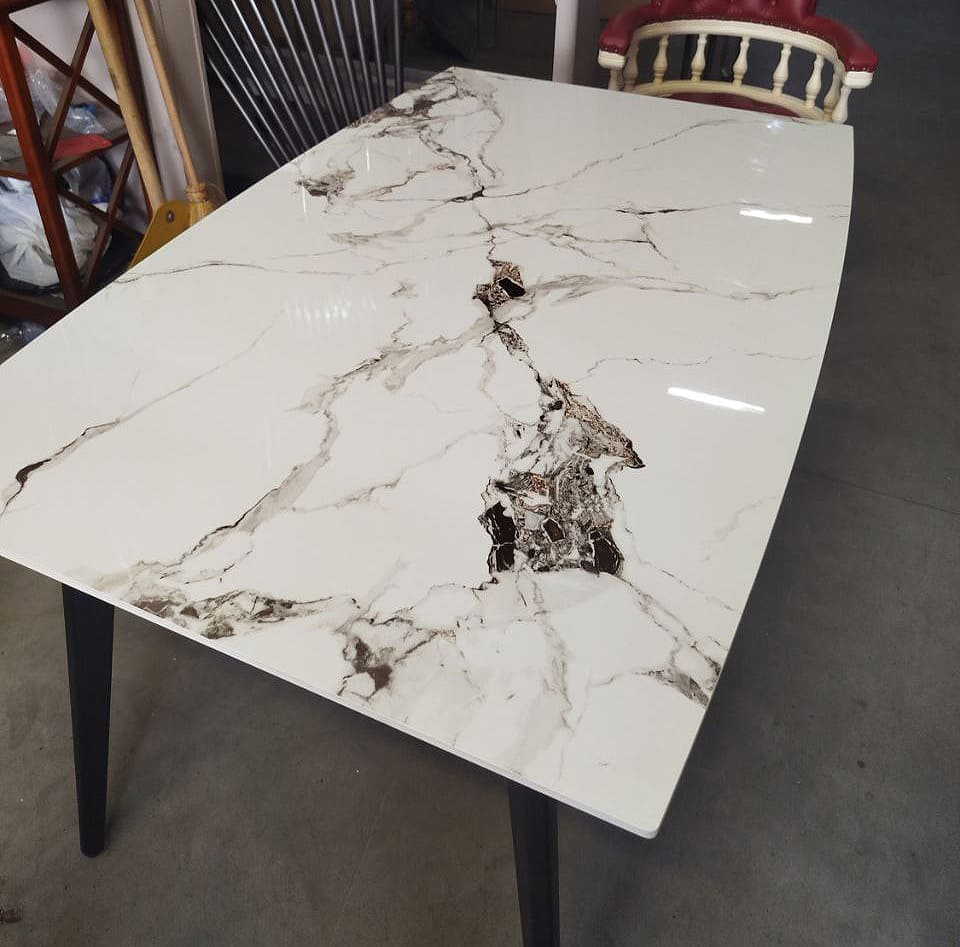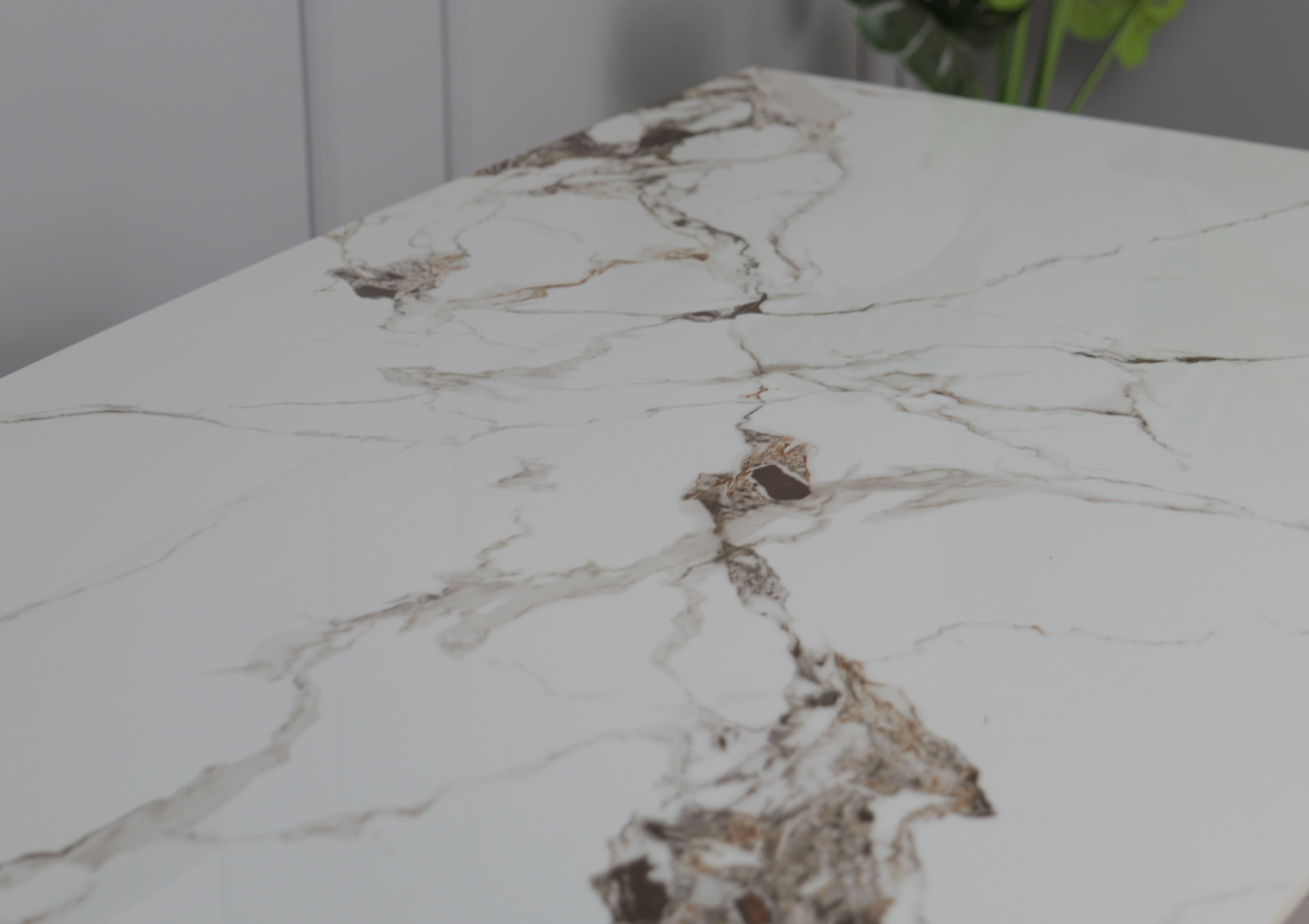 - Изысканная керамическая столешница с глянцевым белым покрытием и мраморным эффектом.