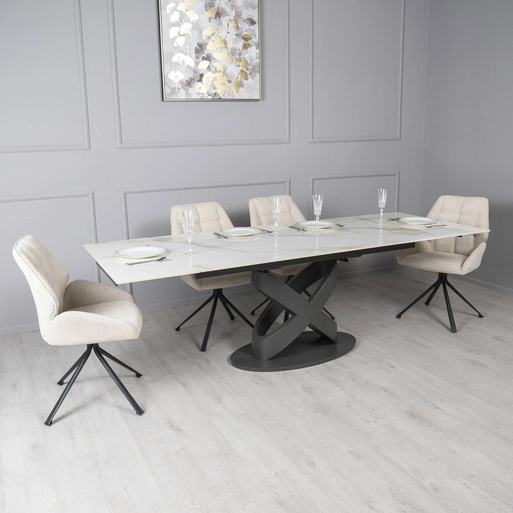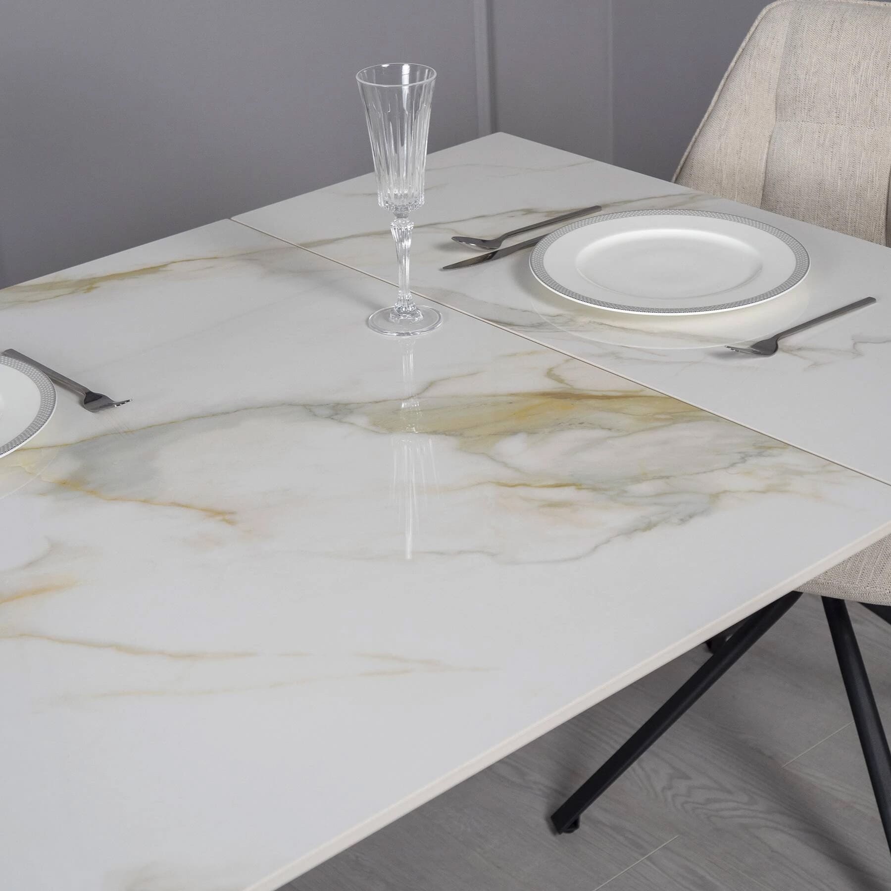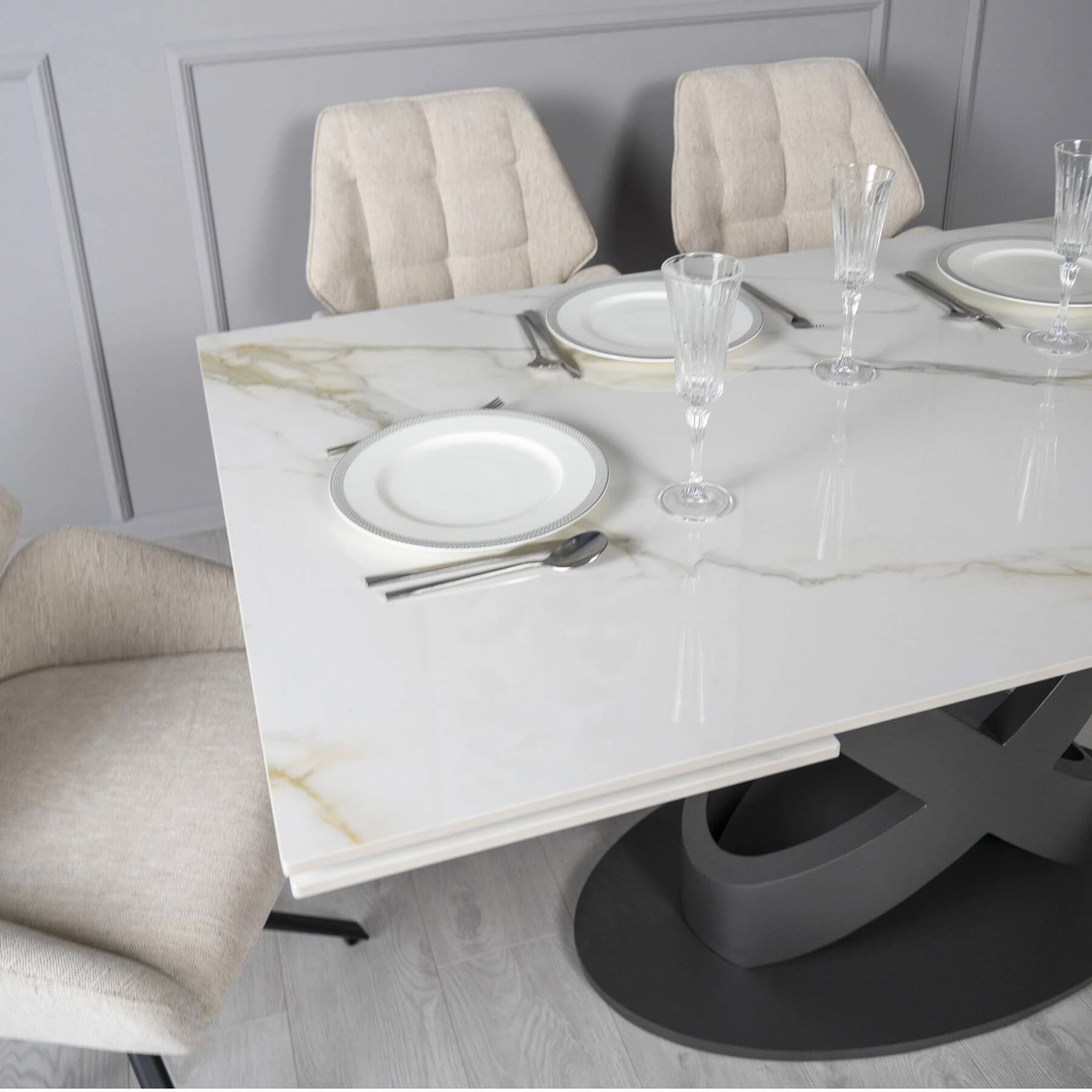 Столешница изготовлена из керамики с глянцевой текстурой, что придает интерьеру элегантную современную привлекательность. Она проста в уходе и идеально подходит для ежедневного использования. Ричмонд имеет раскладку по бокам и может быть увеличен по мере необходимости.