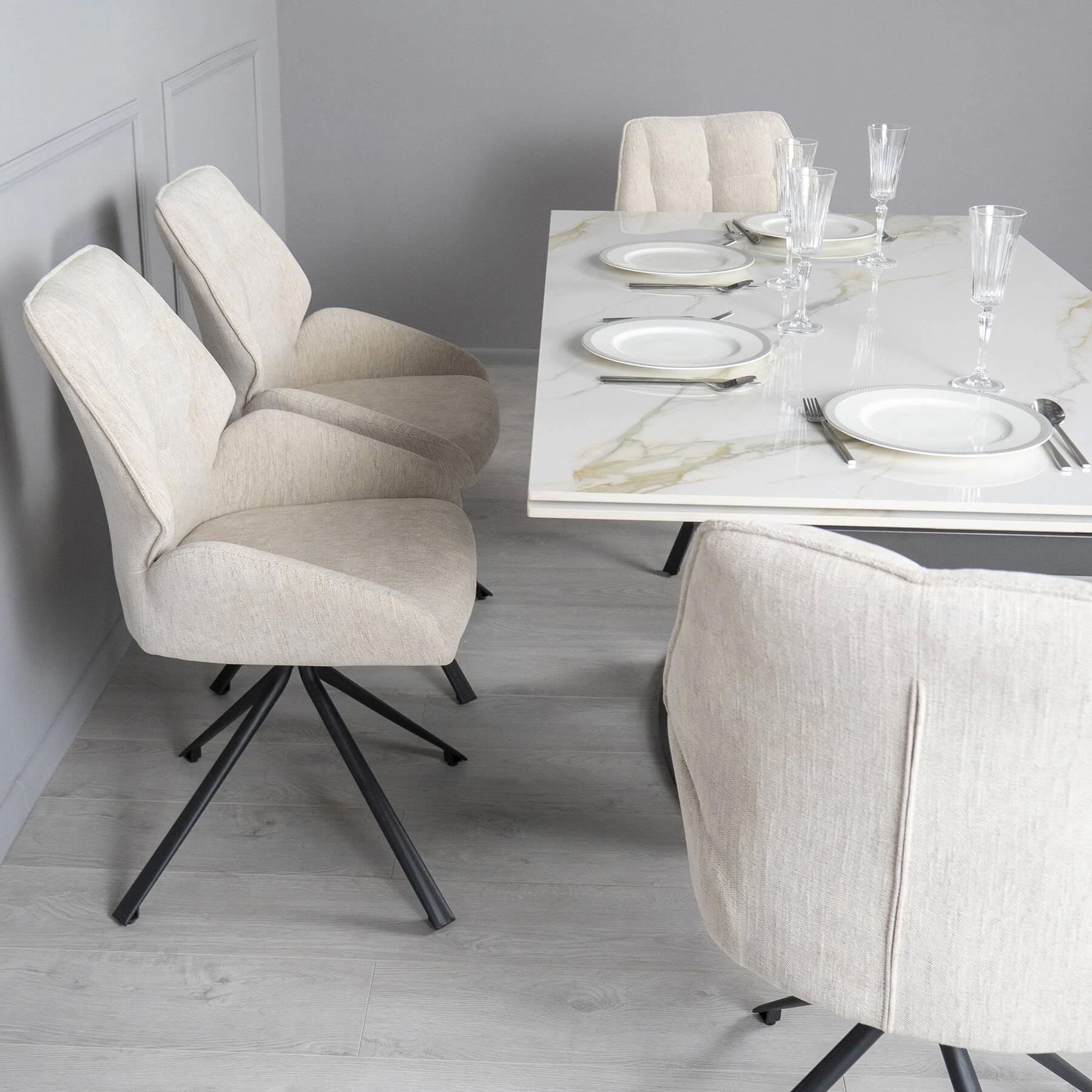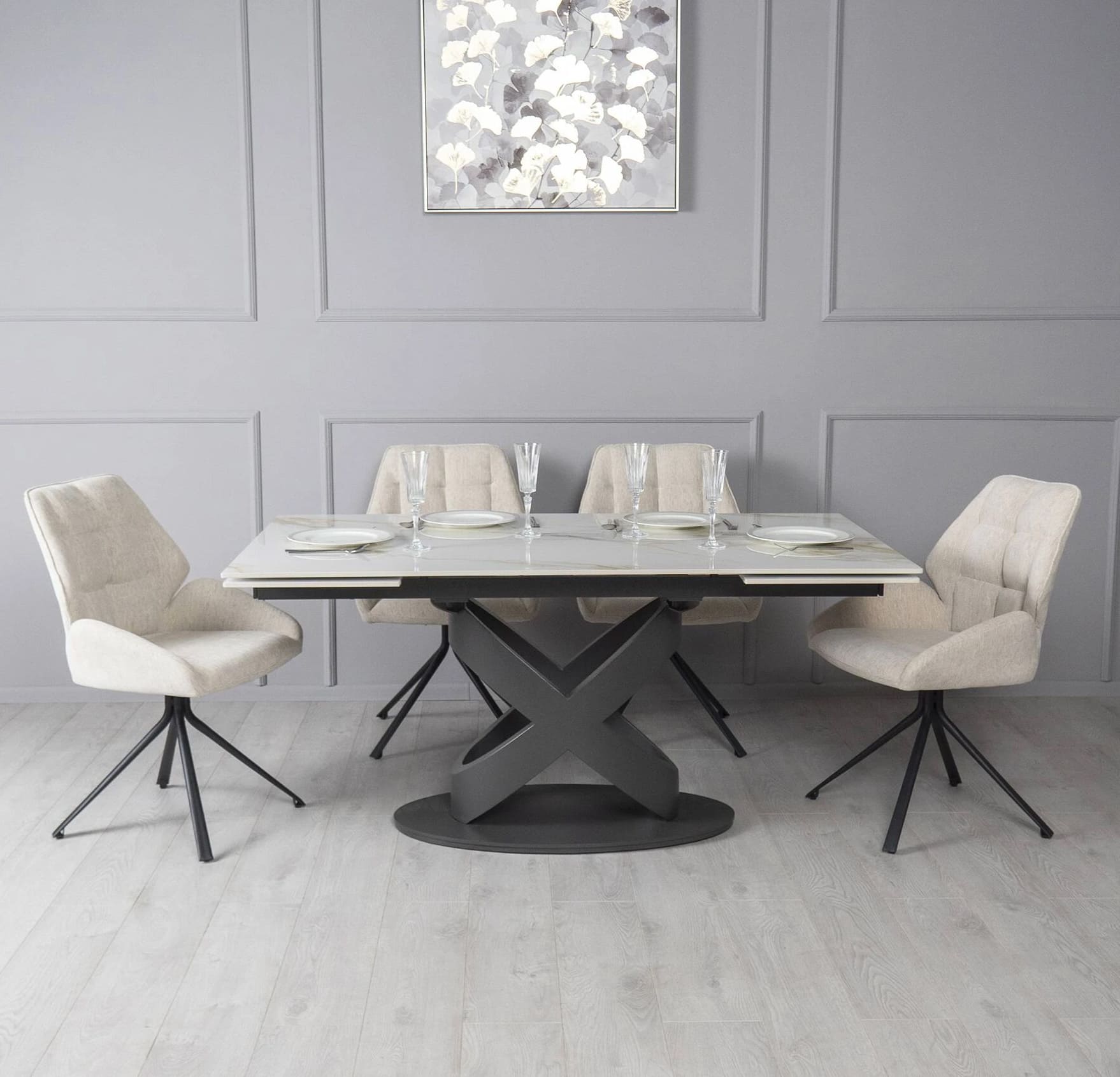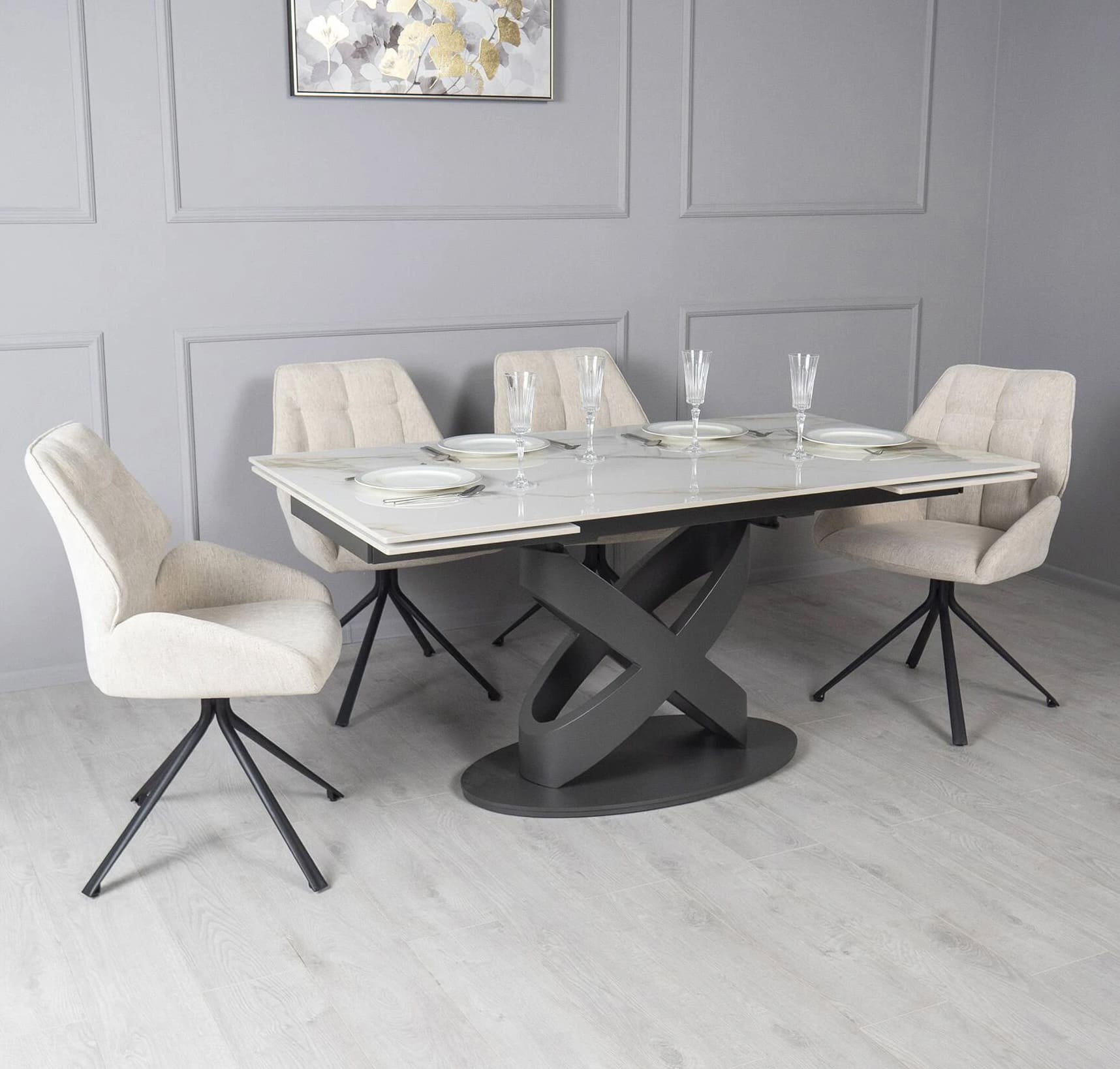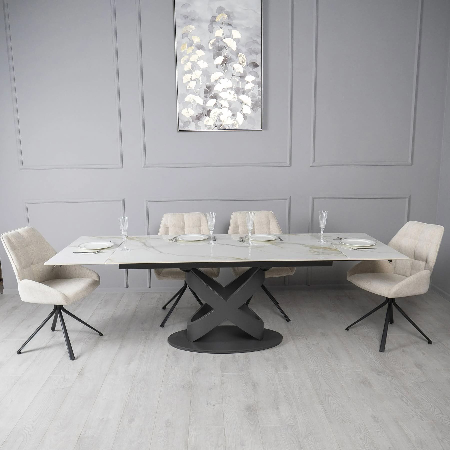 Столешница изготовлена из керамики с глянцевой текстурой, что придает интерьеру элегантную современную привлекательность. Она проста в уходе и идеально подходит для ежедневного использования. Ричмонд имеет раскладку по бокам и может быть увеличен по мере необходимости.