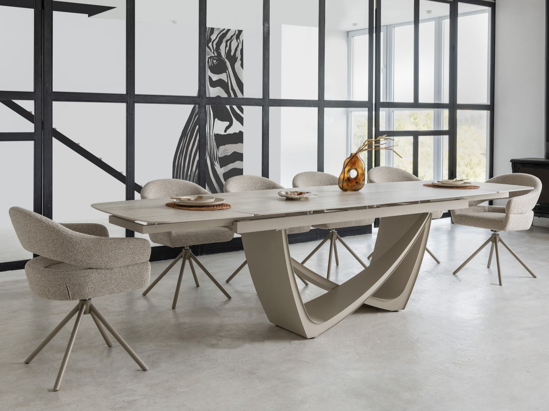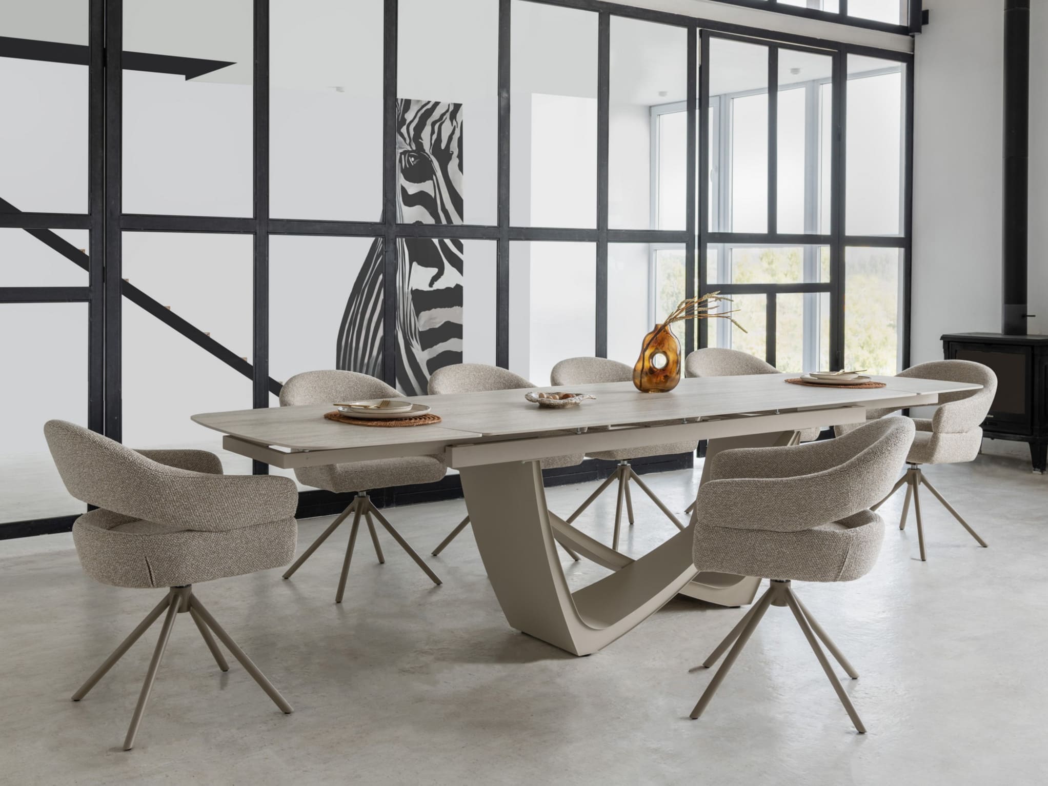 Стол оснащён раскладной конструкцией с боковым механизмом, который позволяет легко увеличить длину столешницы с 200 см до впечатляющих 300 см. Это делает модель идеальным выбором для больших семей или приёма гостей — за столом комфортно разместятся до 12 человек.