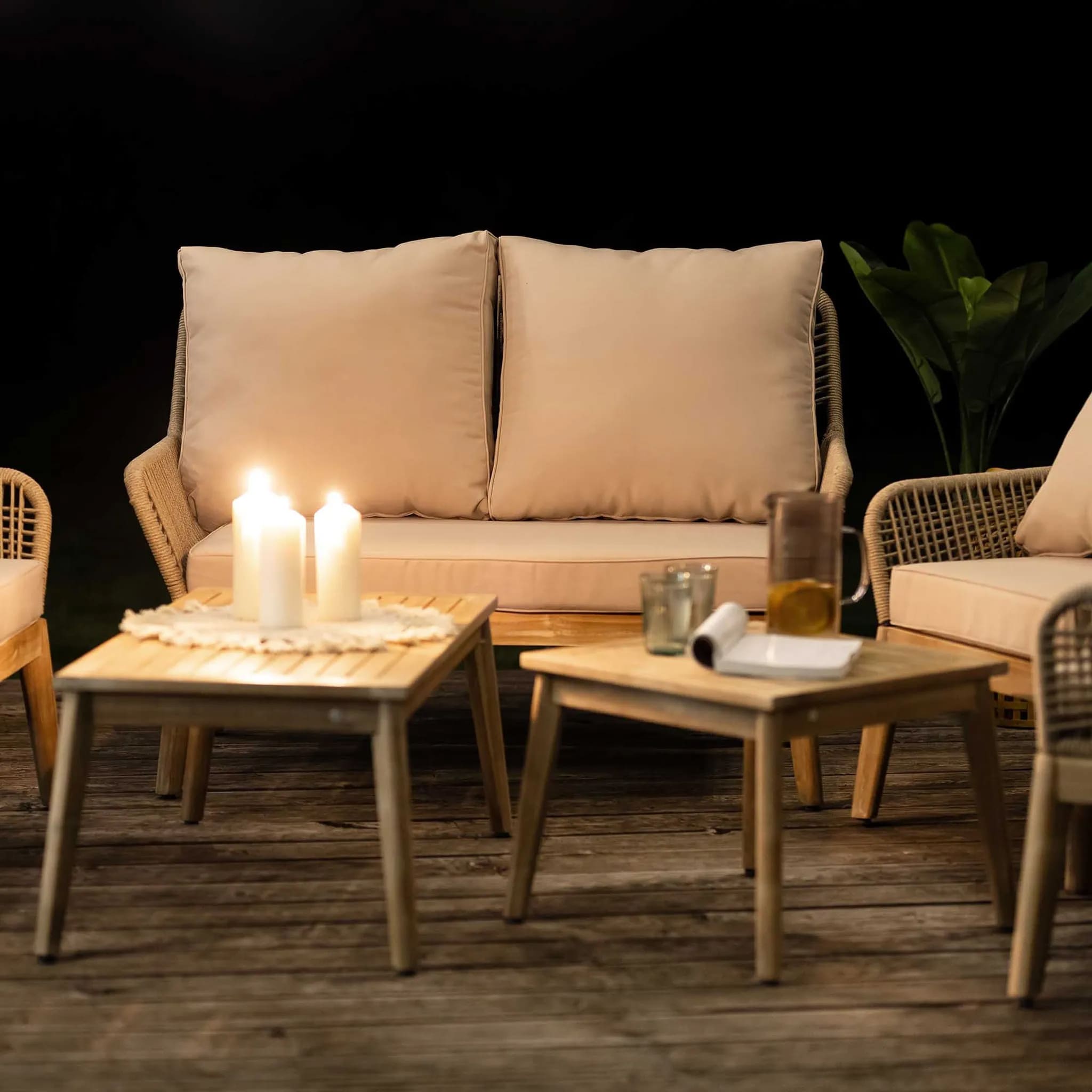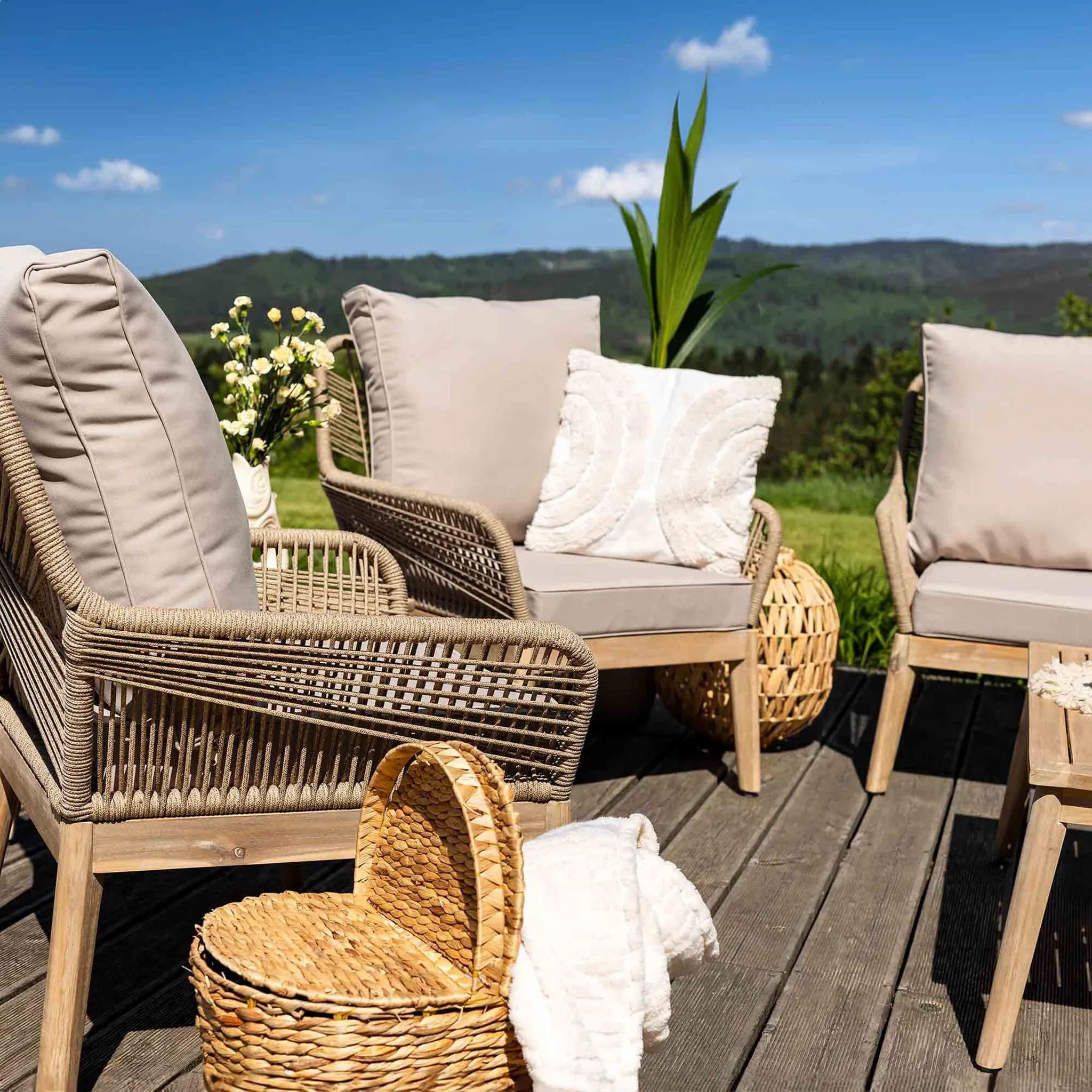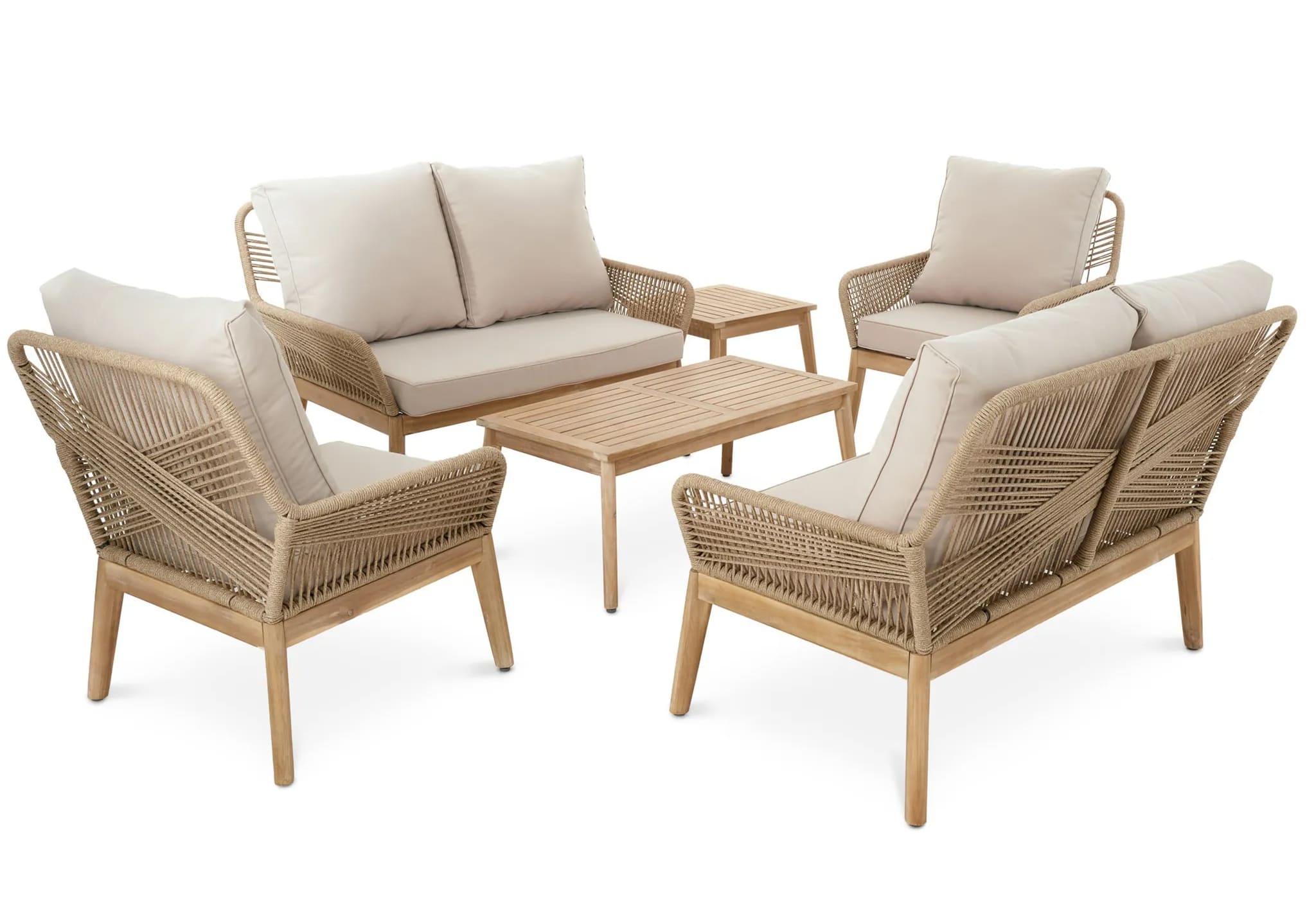 Мягкие подушки в бежевом цвете добавляют удобства, а их чехлы легко снимаются для стирки. Комплект станет элегантным украшением любого открытого пространства.