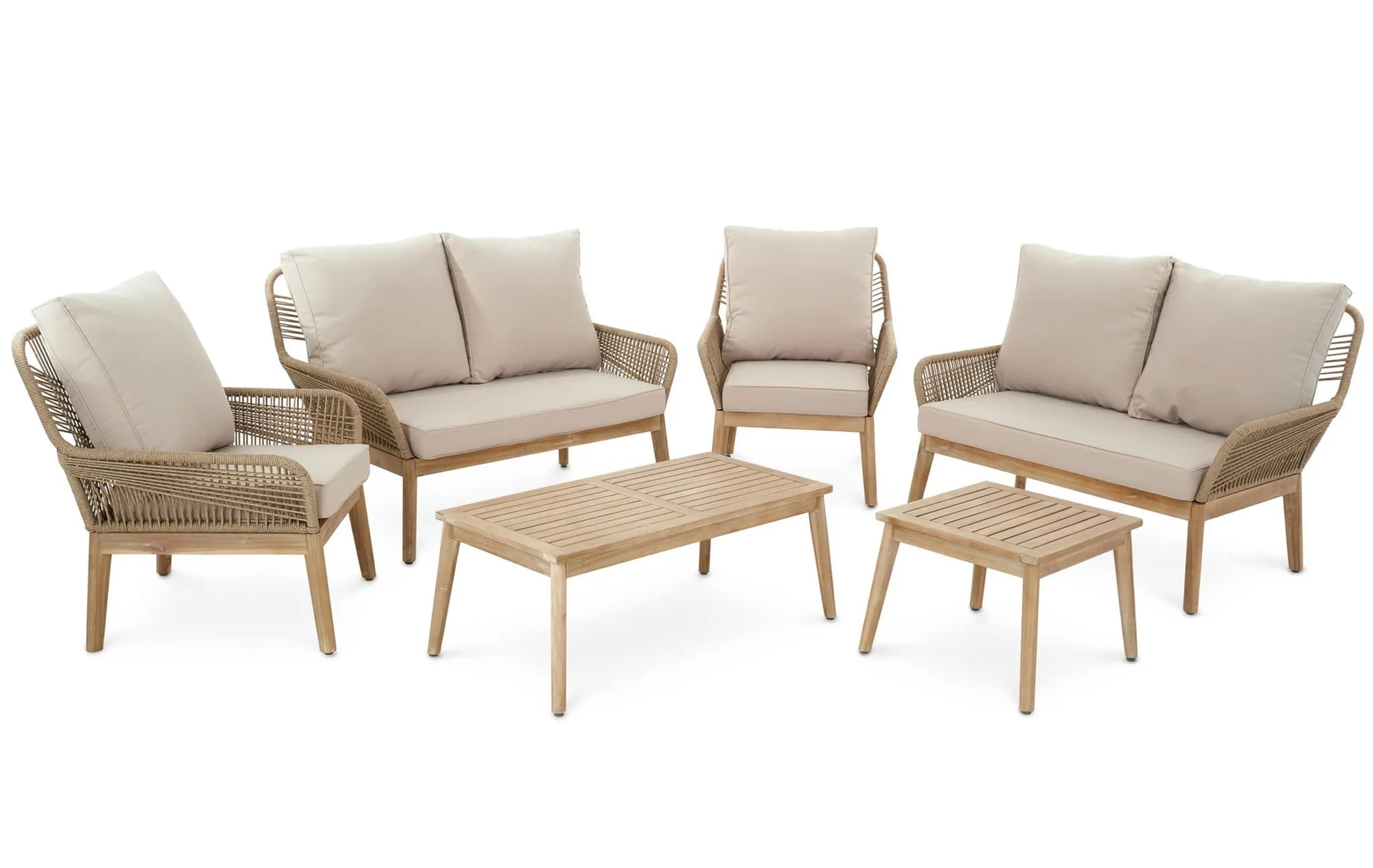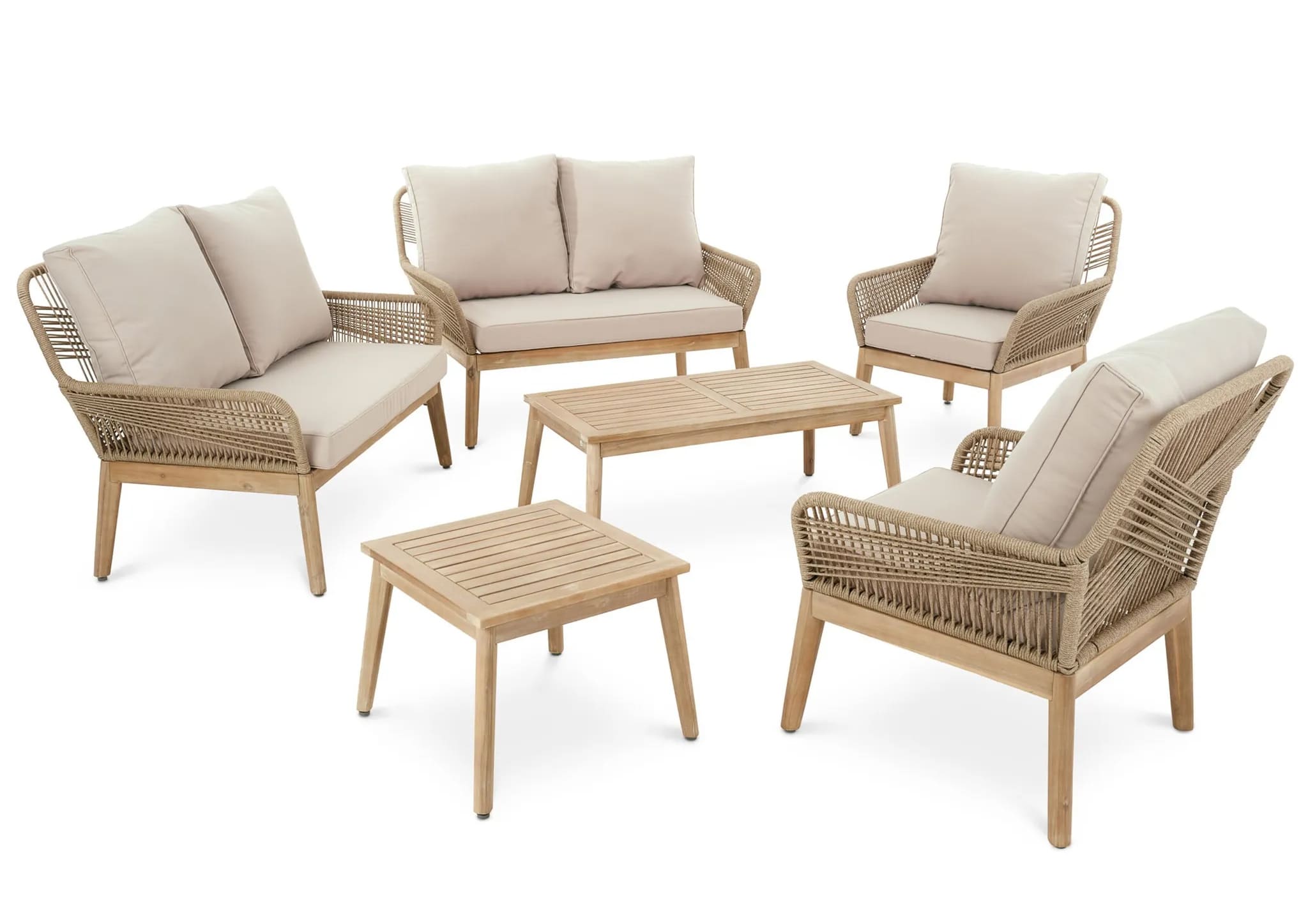 Набор включает два двухместных дивана, два кресла и два журнальных столика разных размеров, что обеспечивает достаточно места для семьи и гостей.