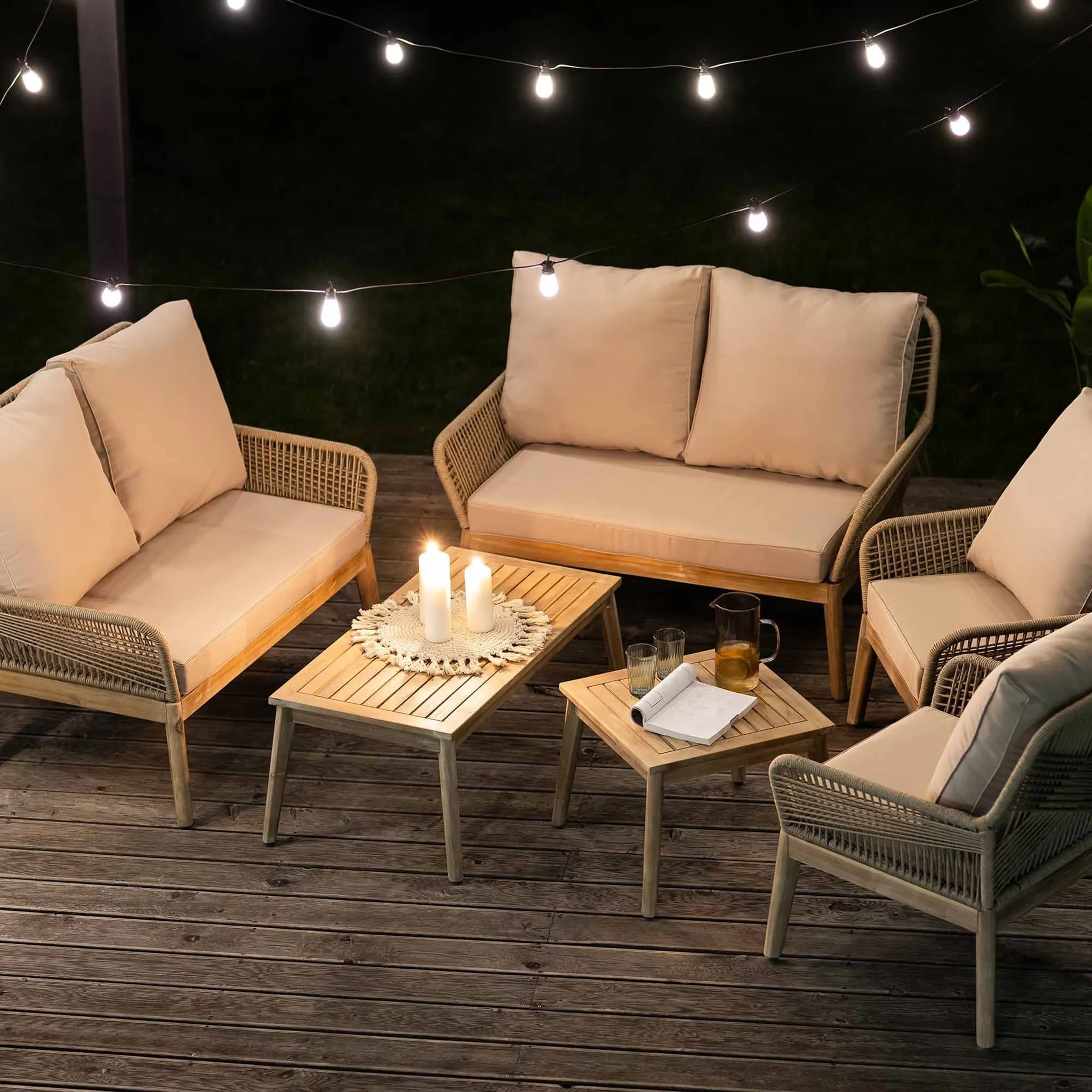 Каркас выполнен из прочной стали с порошковым покрытием, устойчивой к коррозии и погодным условиям, а столики имеют элементы из натурального акациевого дерева, обработанного маслом для защиты от влаги и солнечных лучей.