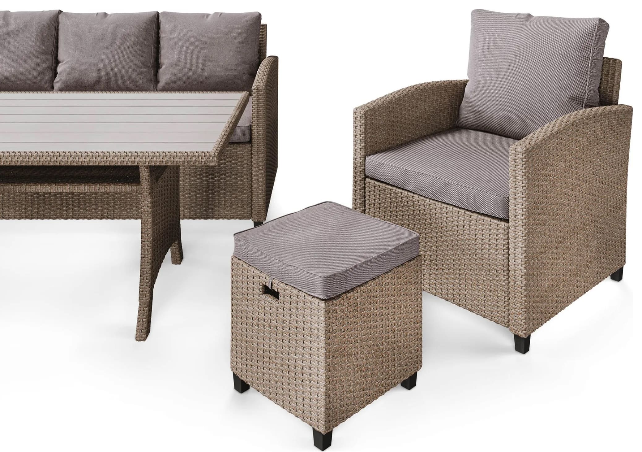 В набор входит комплект мягких подушек для сидений и спинок со специальными съемными чехлами. Чехлы изготовлены из прочной ткани, пропитанной особым раствором, который обеспечивает хороший уровень устойчивости к любым случайно пролитым напиткам.