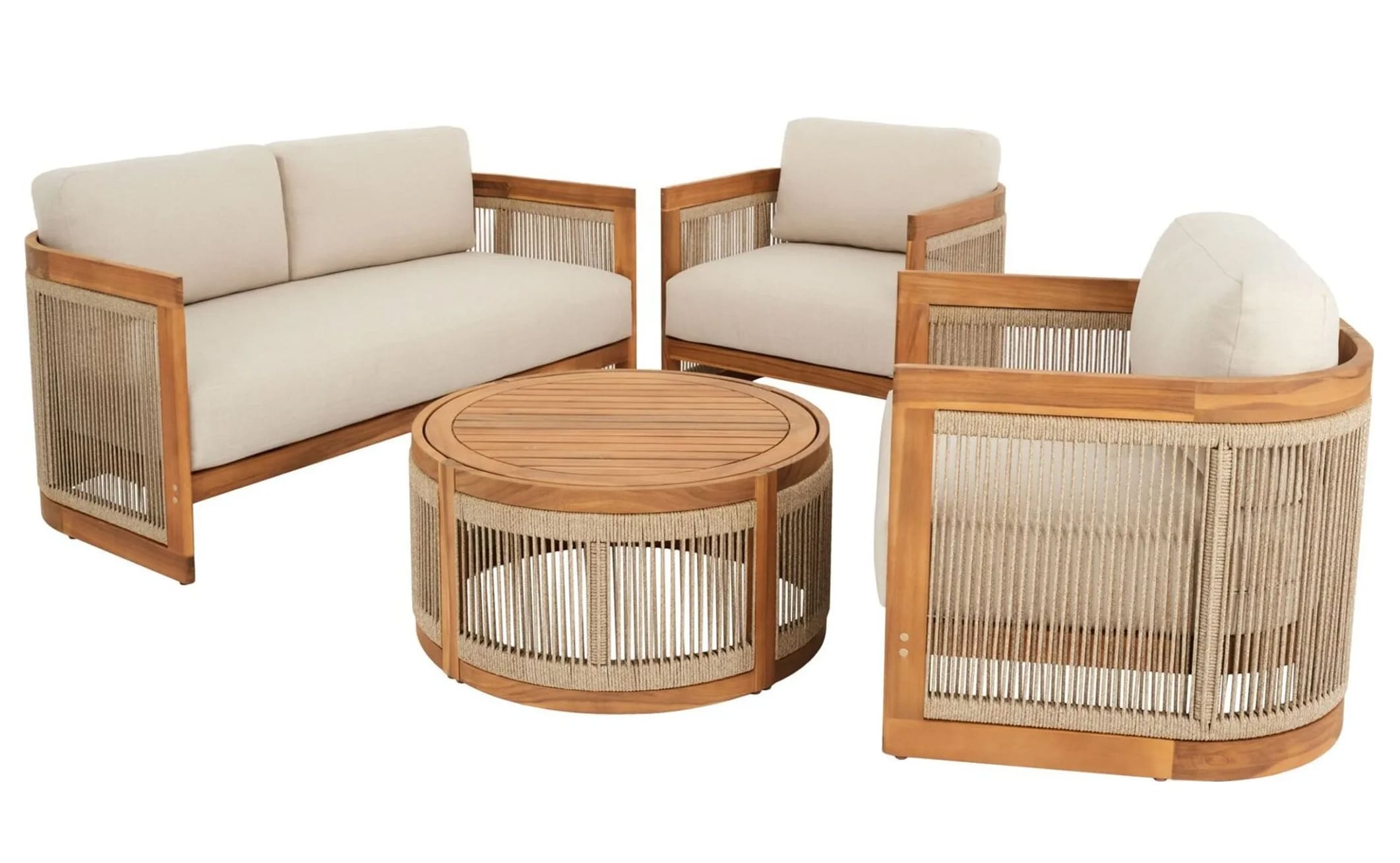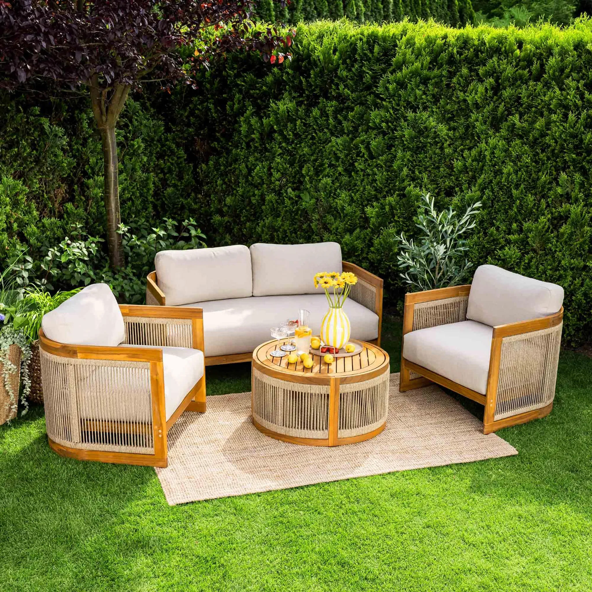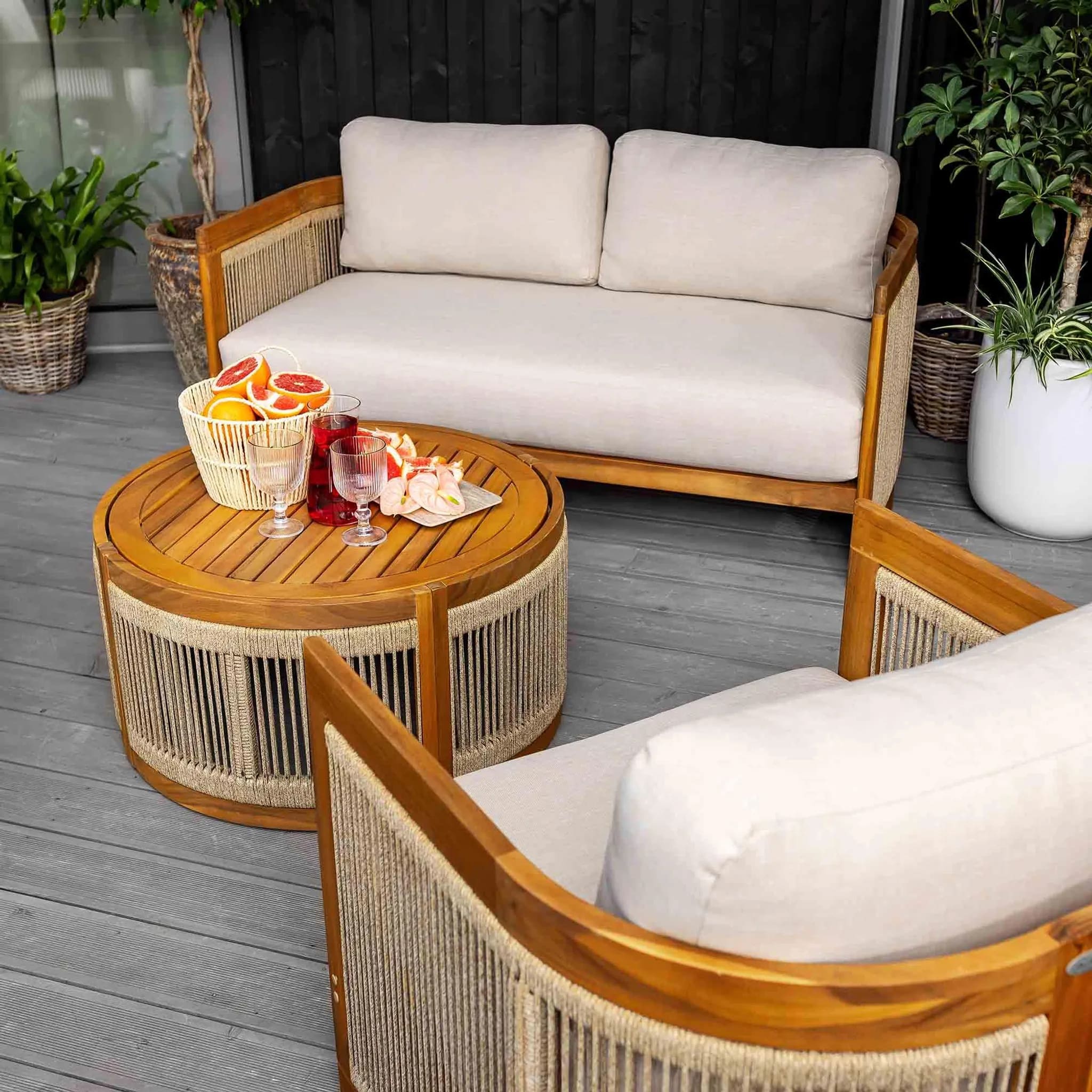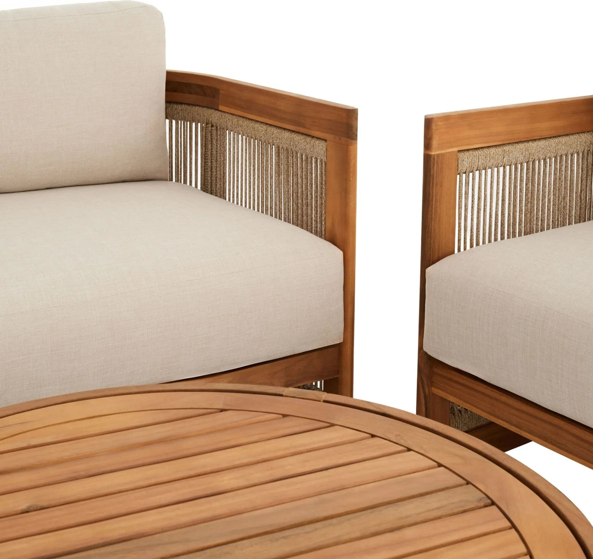 В комплект входят двухместный диван, два кресла и круглый журнальный столик, создавая уютное пространство для отдыха до 4 человек. Мебель изготовлена из натуральной акациевой древесины, устойчивой к влаге и солнечным лучам, а декоративное плетение из прочного полипропилена придает комплекту современный стиль.