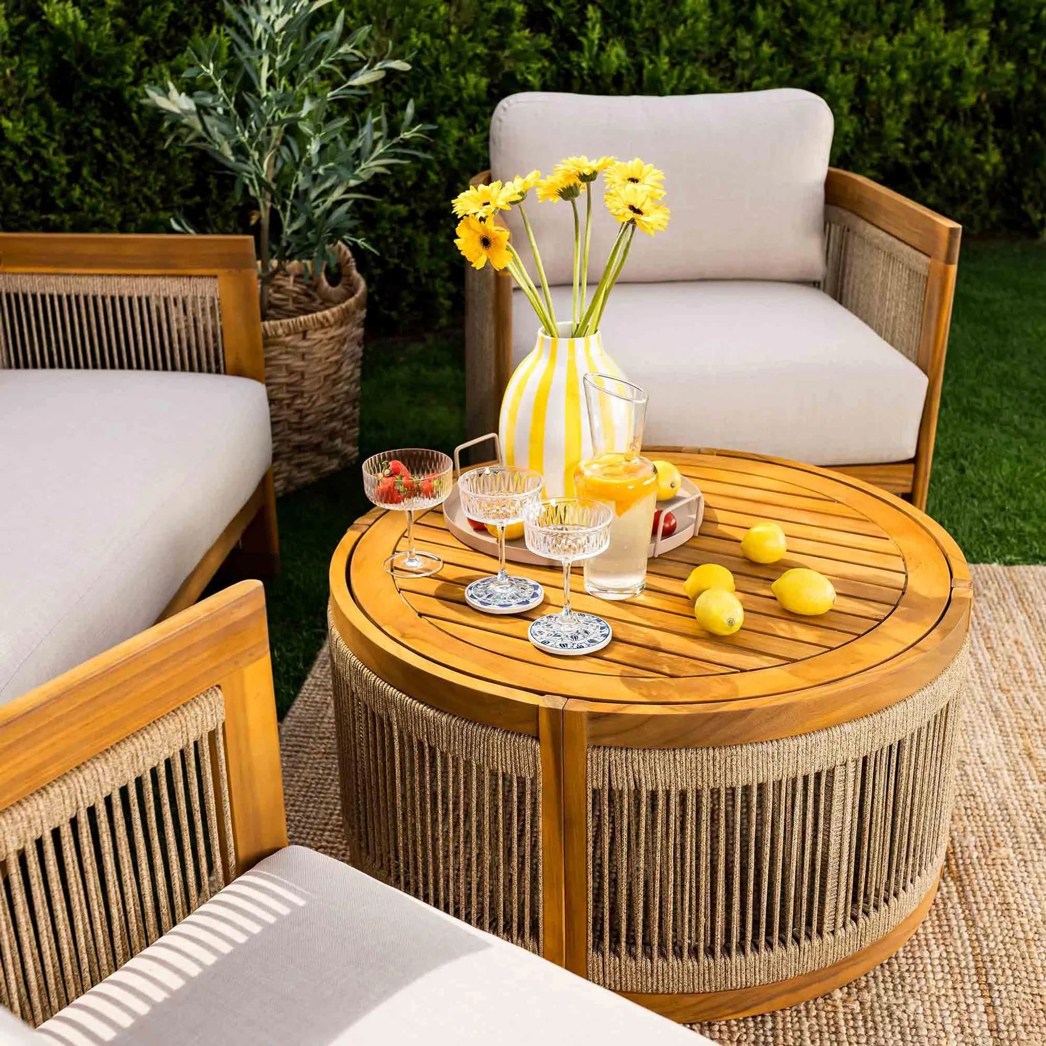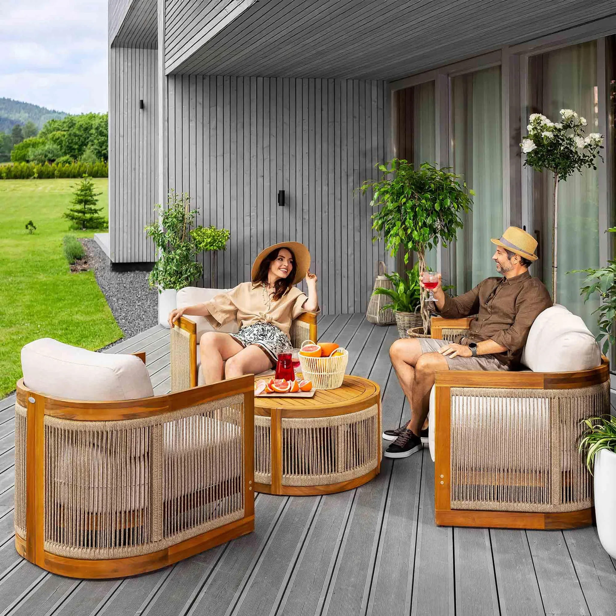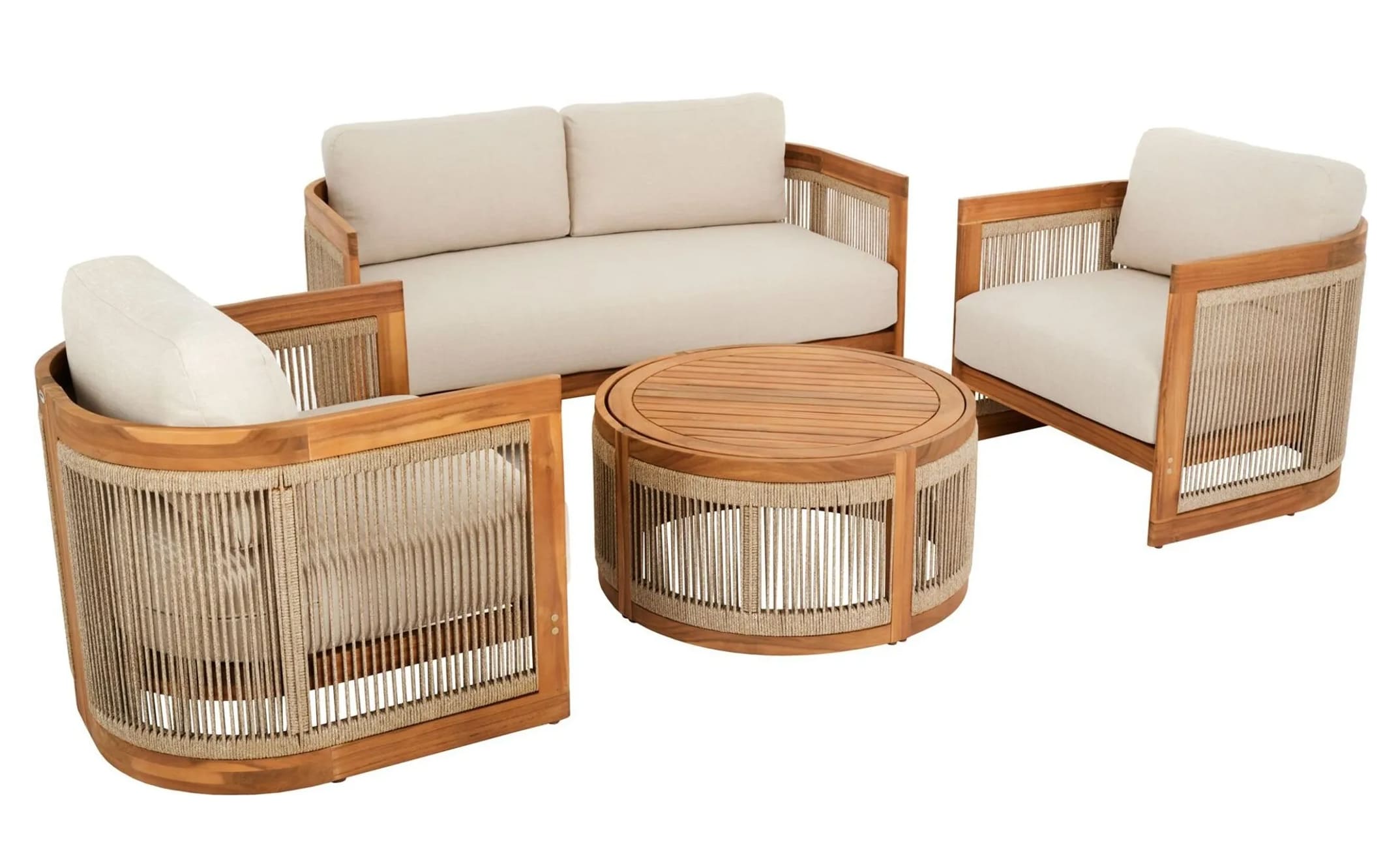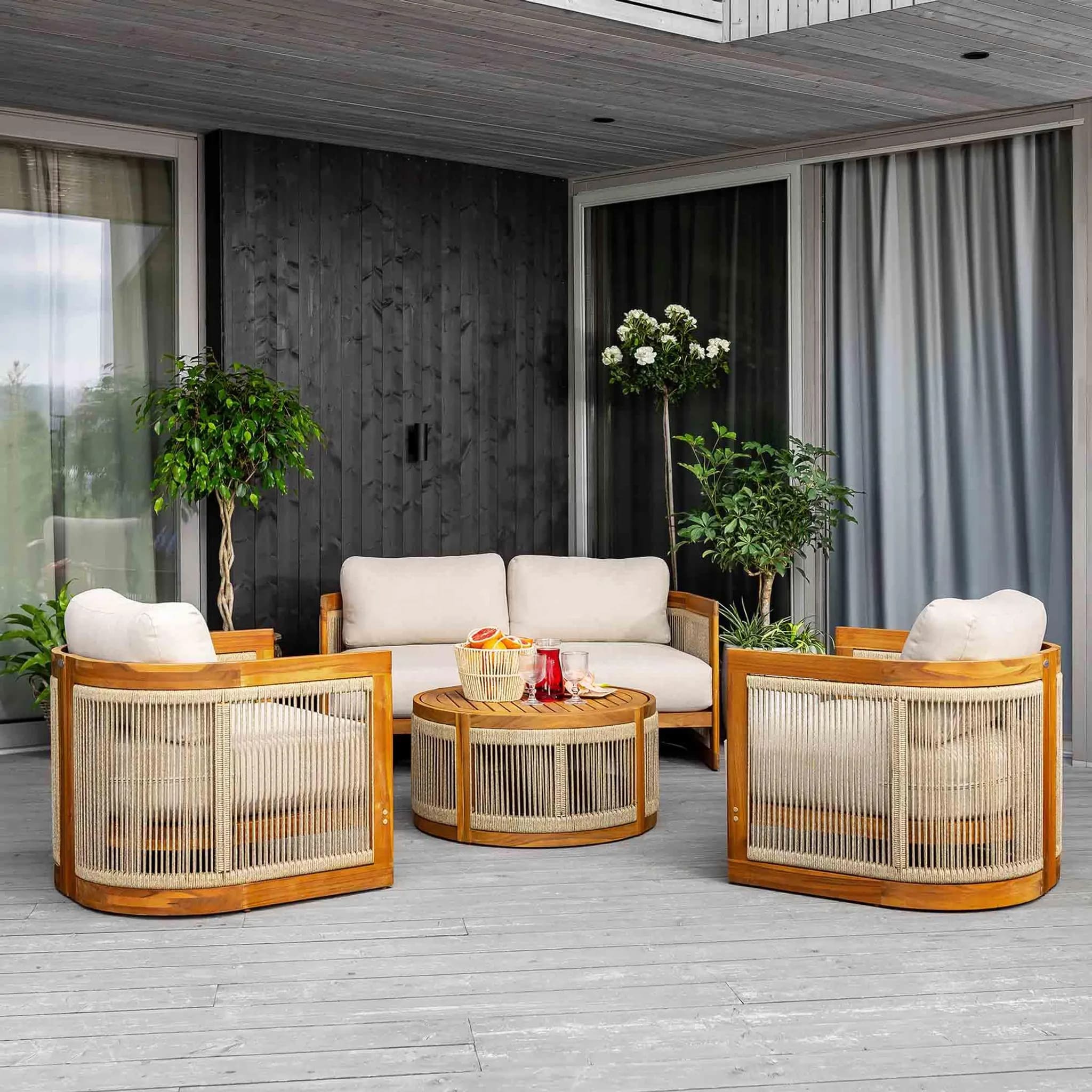 В комплект входят двухместный диван, два кресла и круглый журнальный столик, создавая уютное пространство для отдыха до 4 человек. Мебель изготовлена из натуральной акациевой древесины, устойчивой к влаге и солнечным лучам, а декоративное плетение из прочного полипропилена придает комплекту современный стиль.