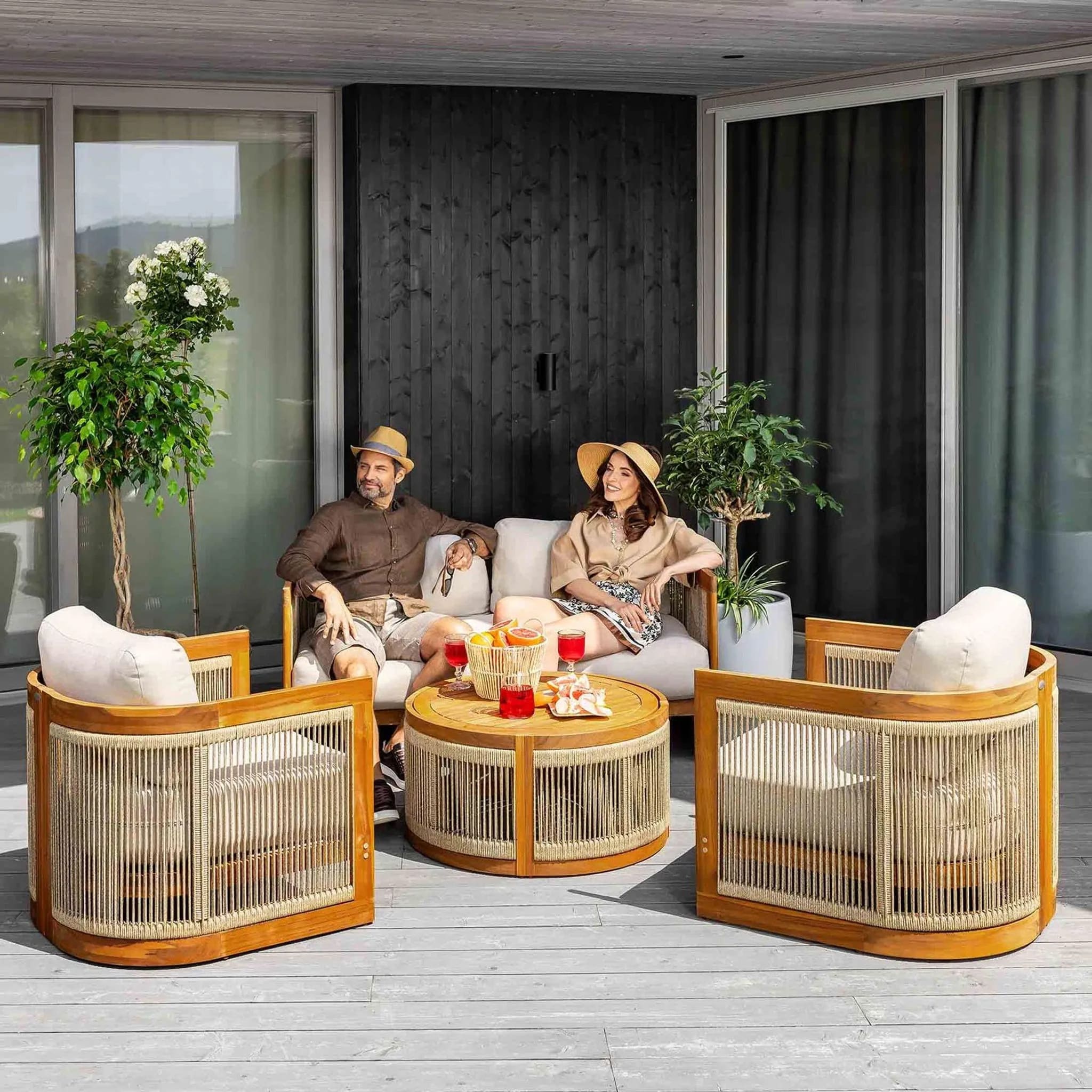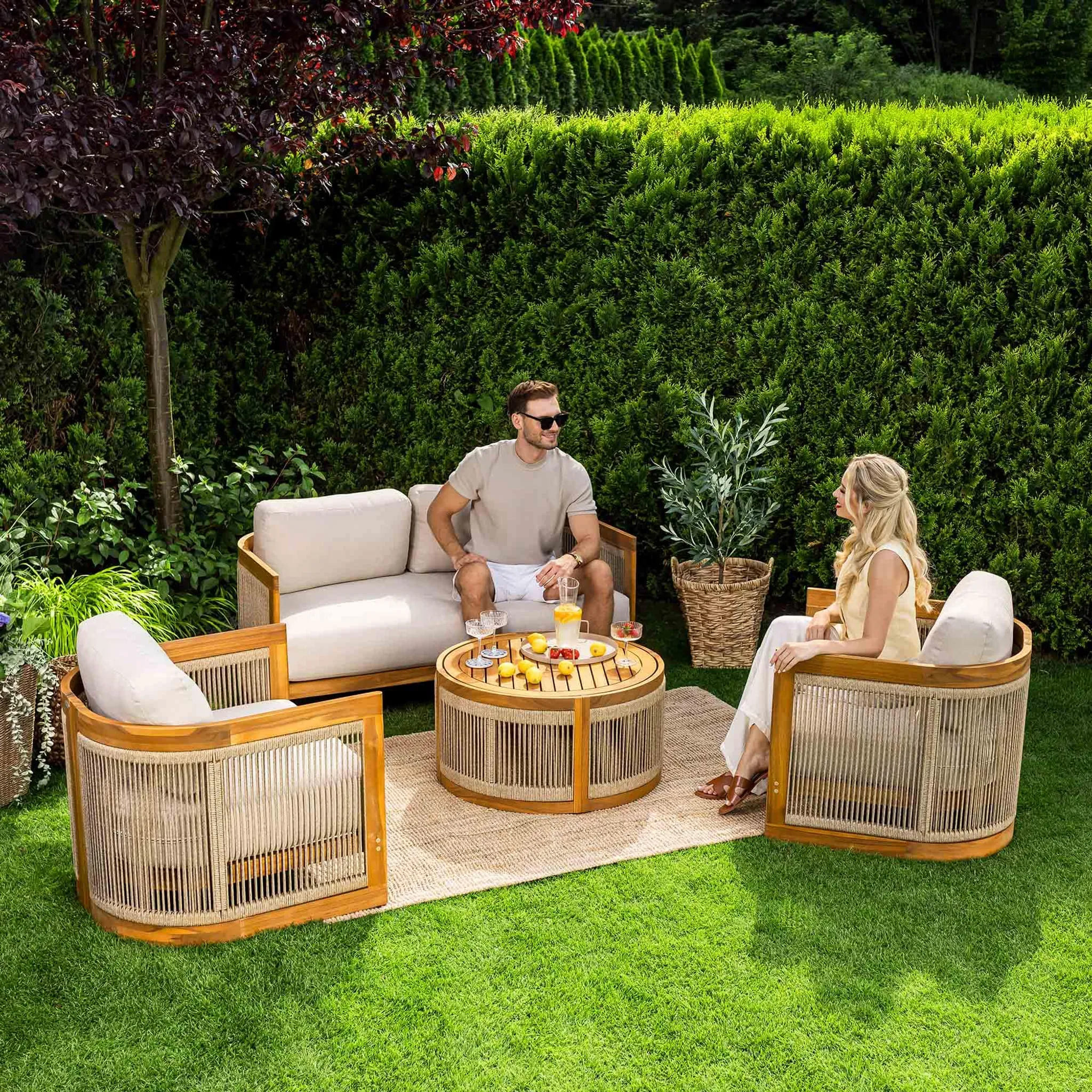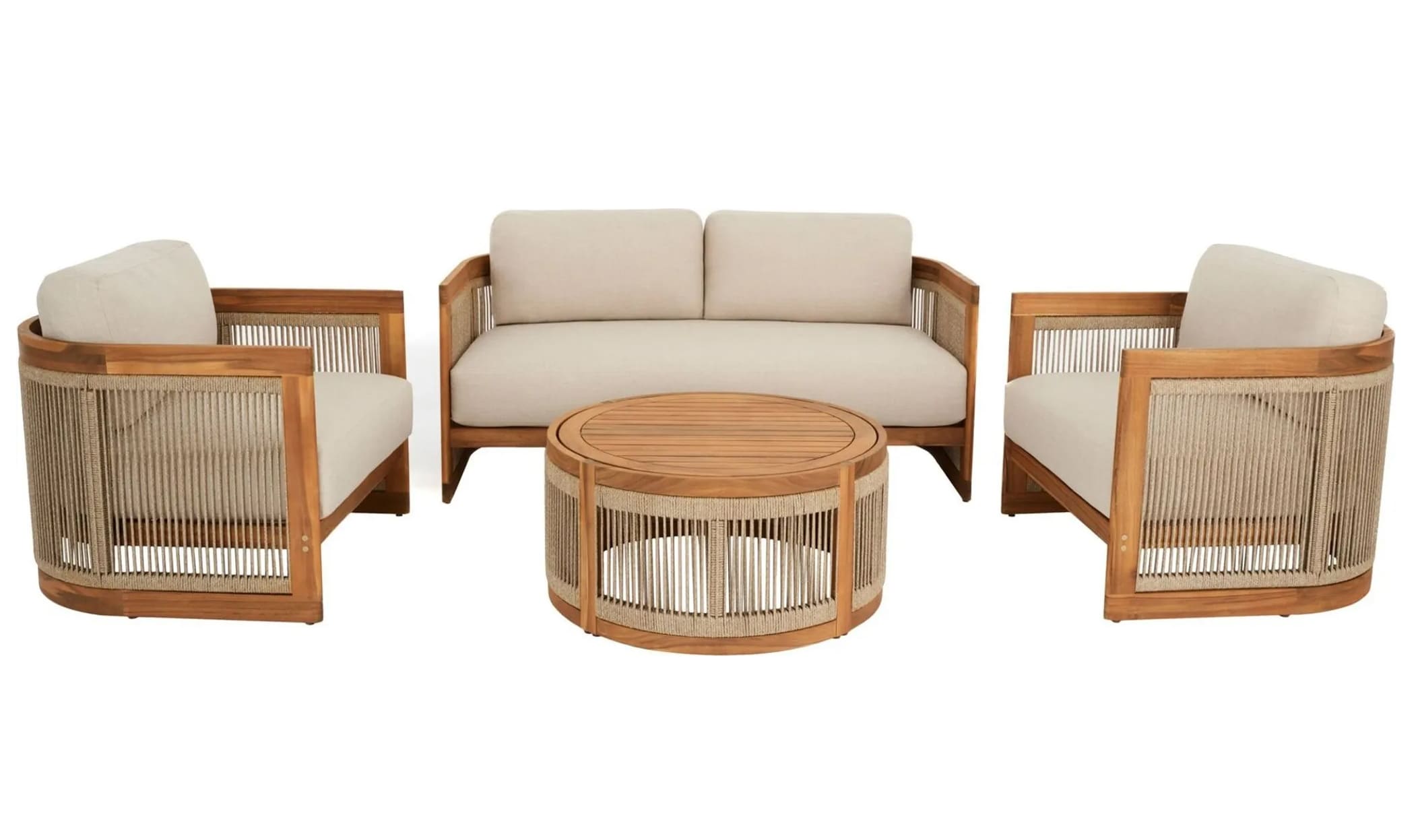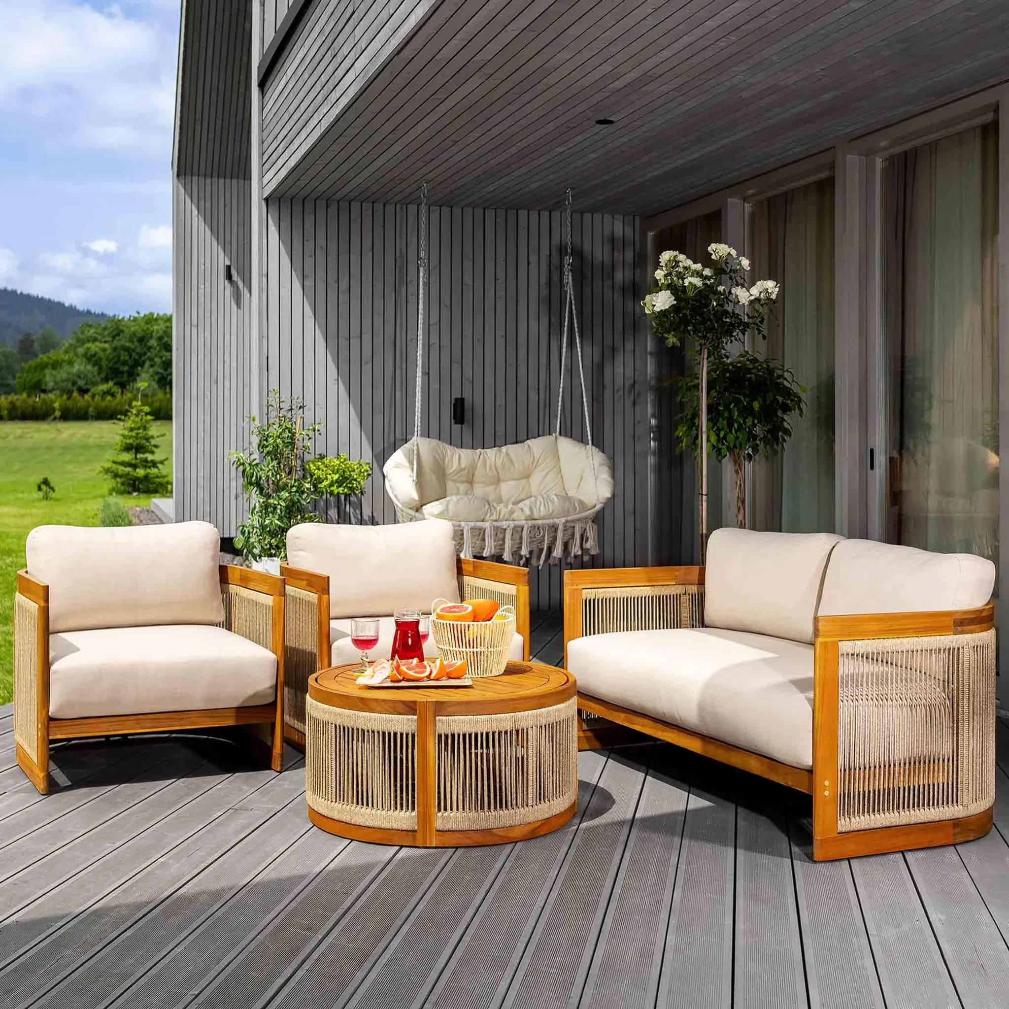 В комплект входят двухместный диван, два кресла и круглый журнальный столик, создавая уютное пространство для отдыха до 4 человек. Мебель изготовлена из натуральной акациевой древесины, устойчивой к влаге и солнечным лучам, а декоративное плетение из прочного полипропилена придает комплекту современный стиль.
