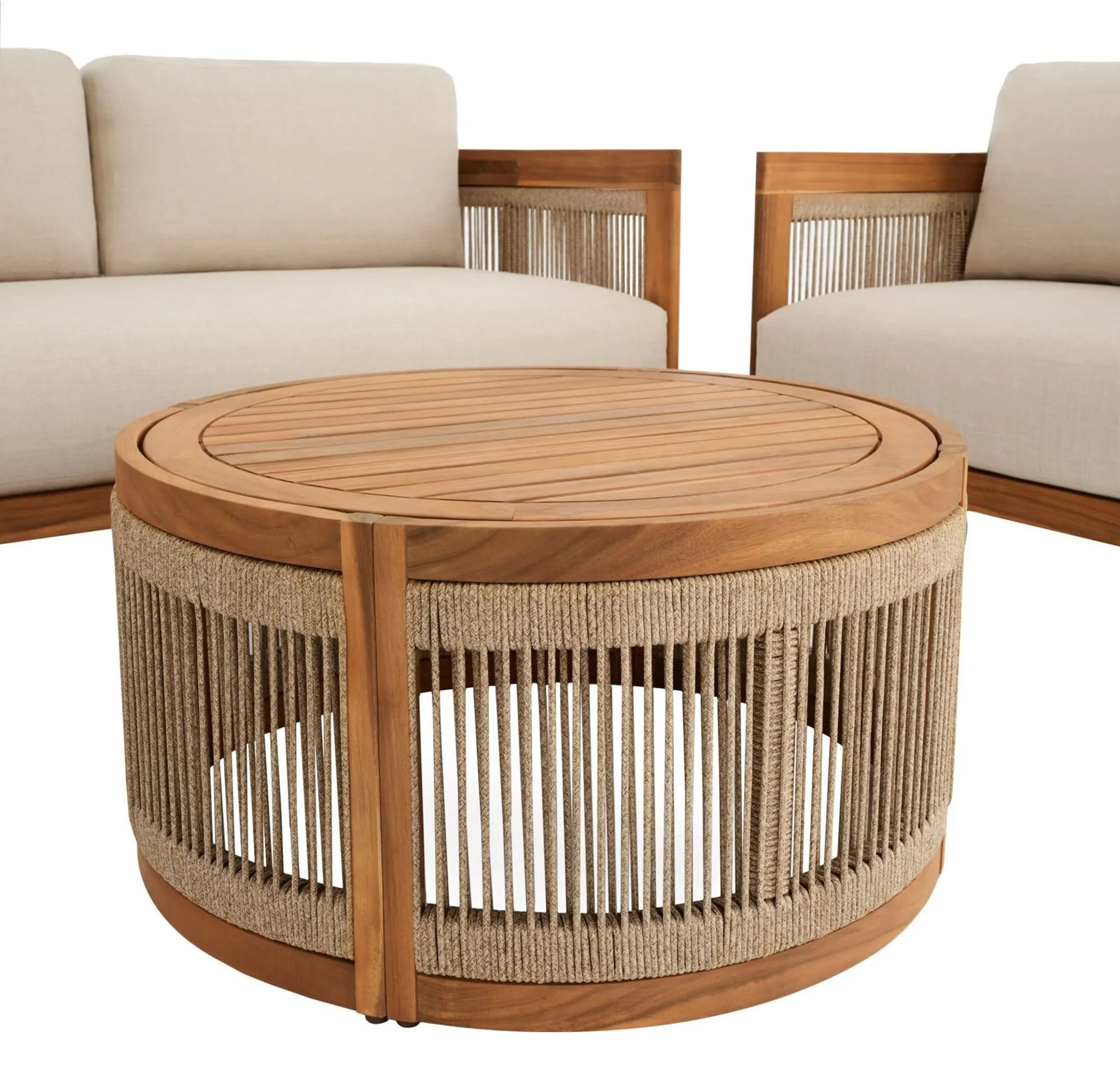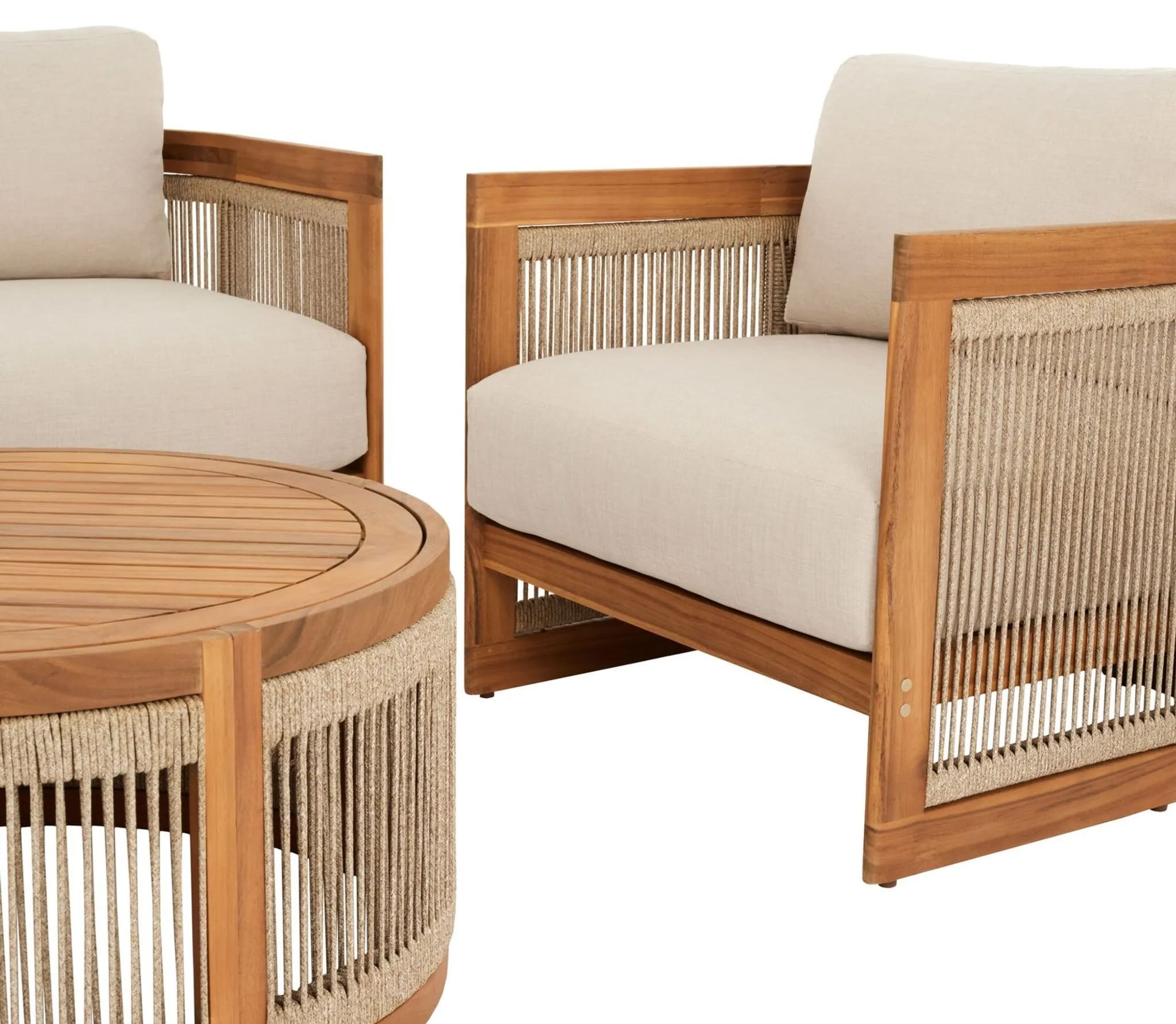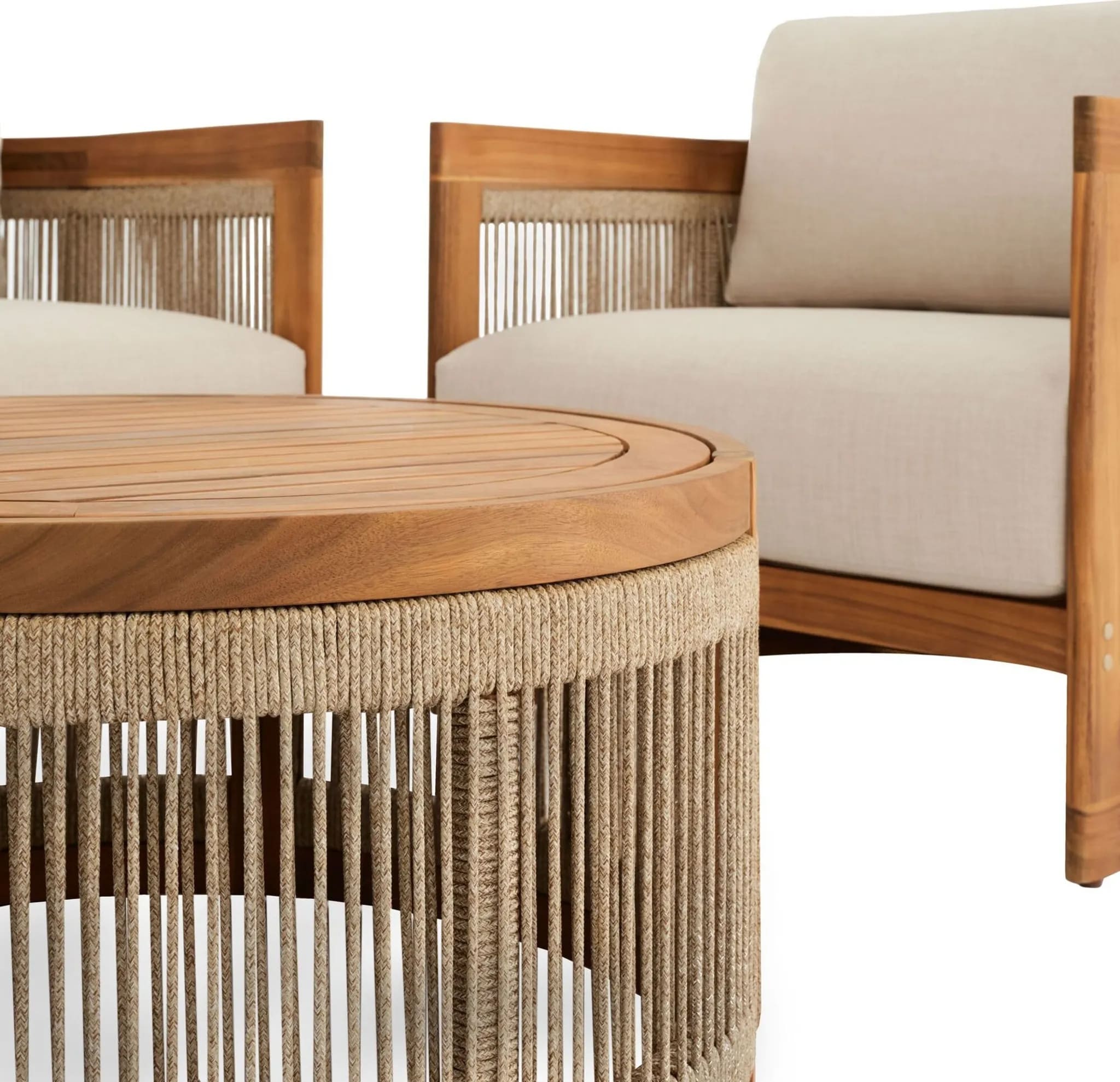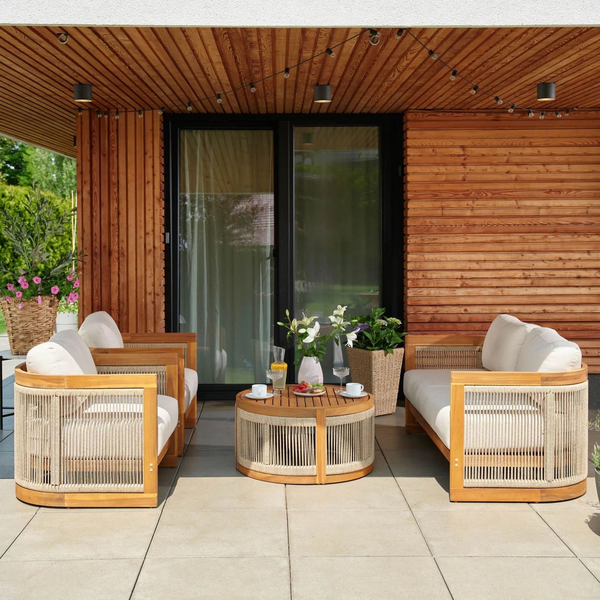 В комплект входят двухместный диван, два кресла и круглый журнальный столик, создавая уютное пространство для отдыха до 4 человек. Мебель изготовлена из натуральной акациевой древесины, устойчивой к влаге и солнечным лучам, а декоративное плетение из прочного полипропилена придает комплекту современный стиль.