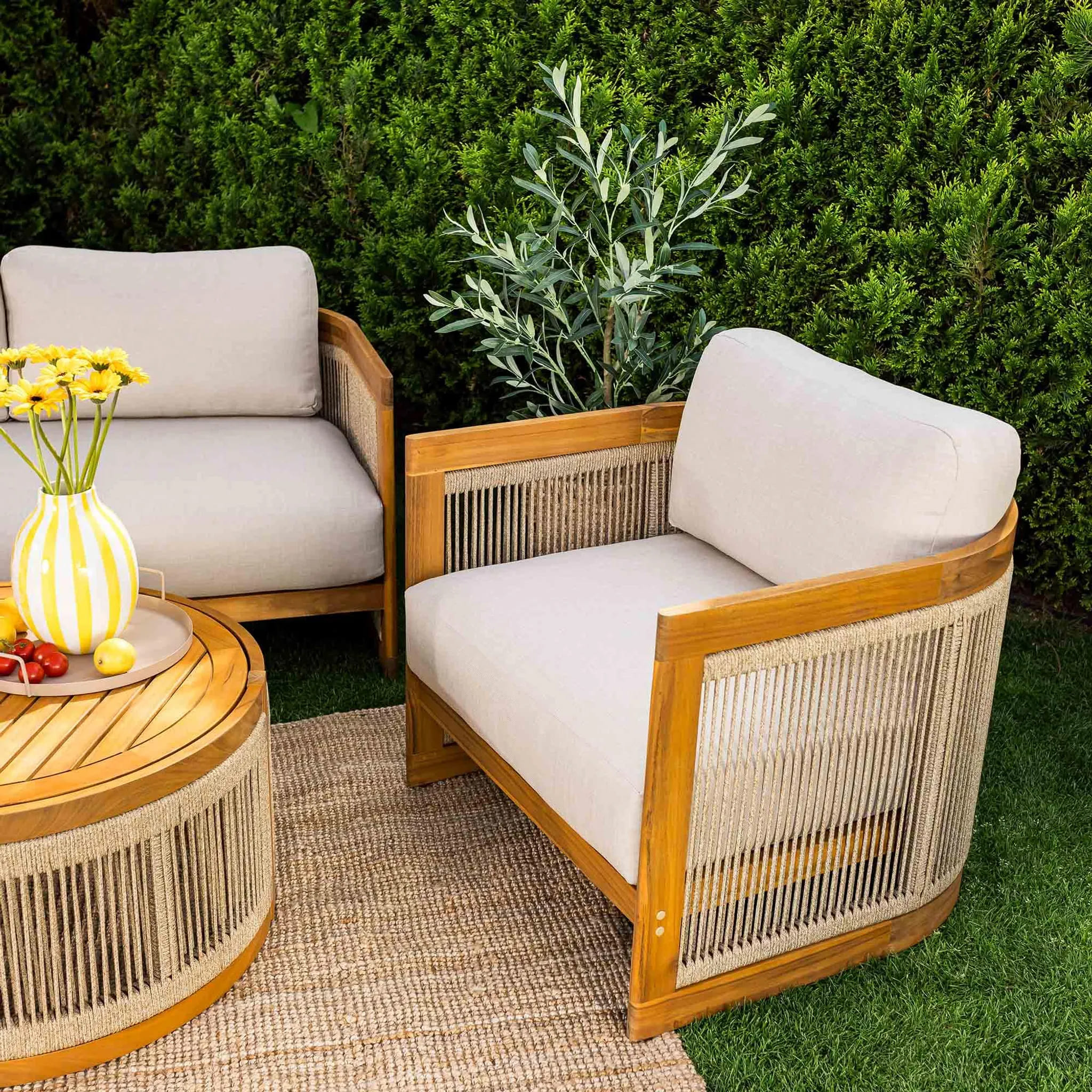 Мягкие подушки увеличенной толщины обеспечивают максимальный комфорт, а съемные чехлы облегчают уход. Комплект идеально подходит для ежедневного использования на открытом воздухе и станет стильным акцентом любого экстерьера.