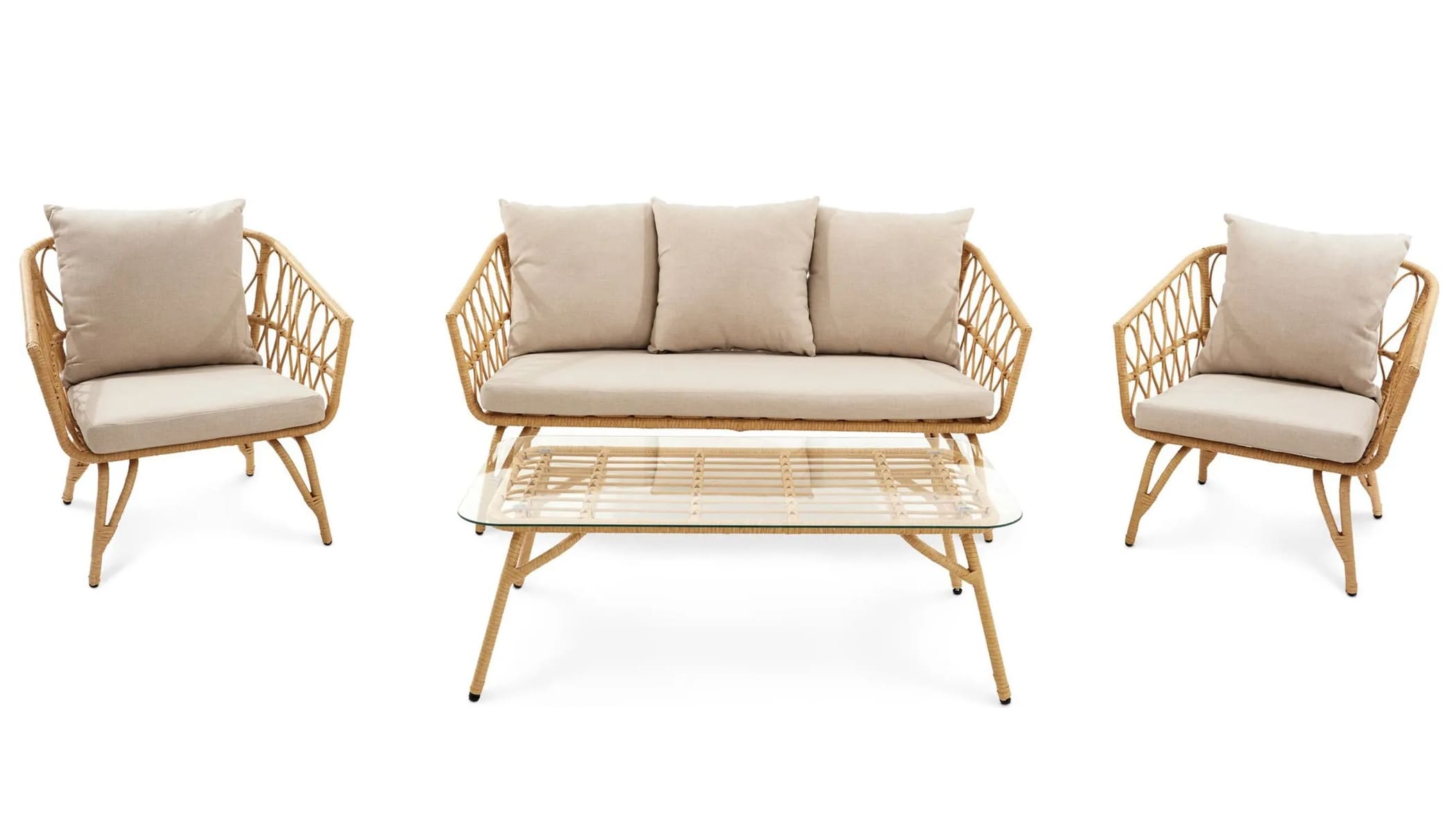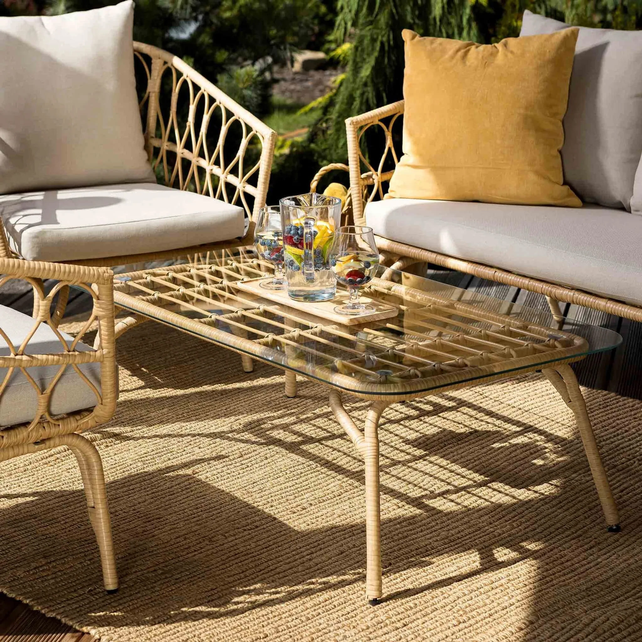 В комплект входят трехместный диван, два кресла и журнальный столик со стеклянной столешницей, создавая комфортное пространство для отдыха до 5 человек. Каркас выполнен из прочной стали с порошковым покрытием, а плетение из техноротанга устойчиво к влаге, ультрафиолету и перепадам температур.