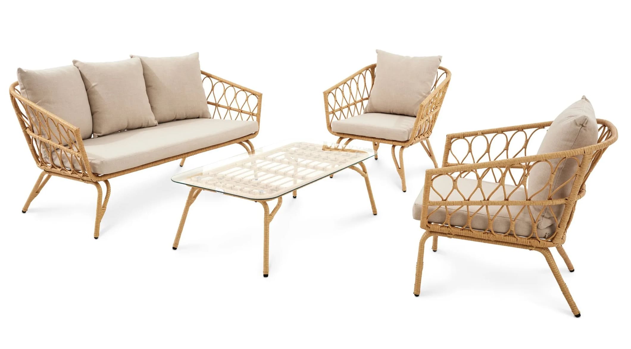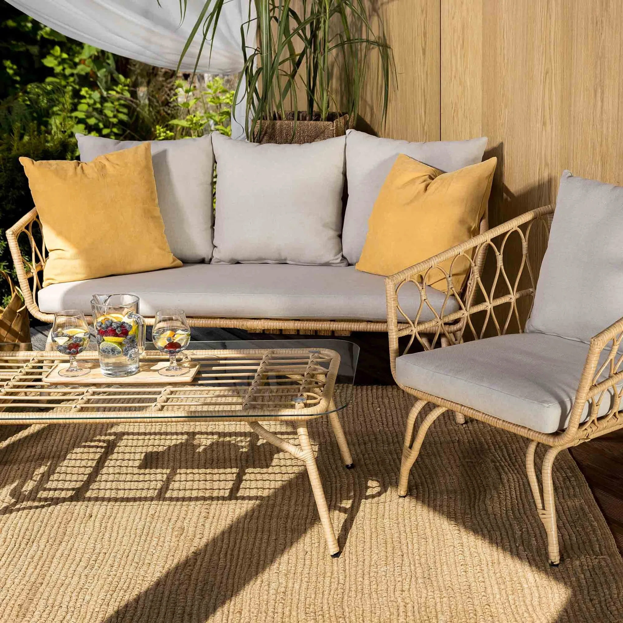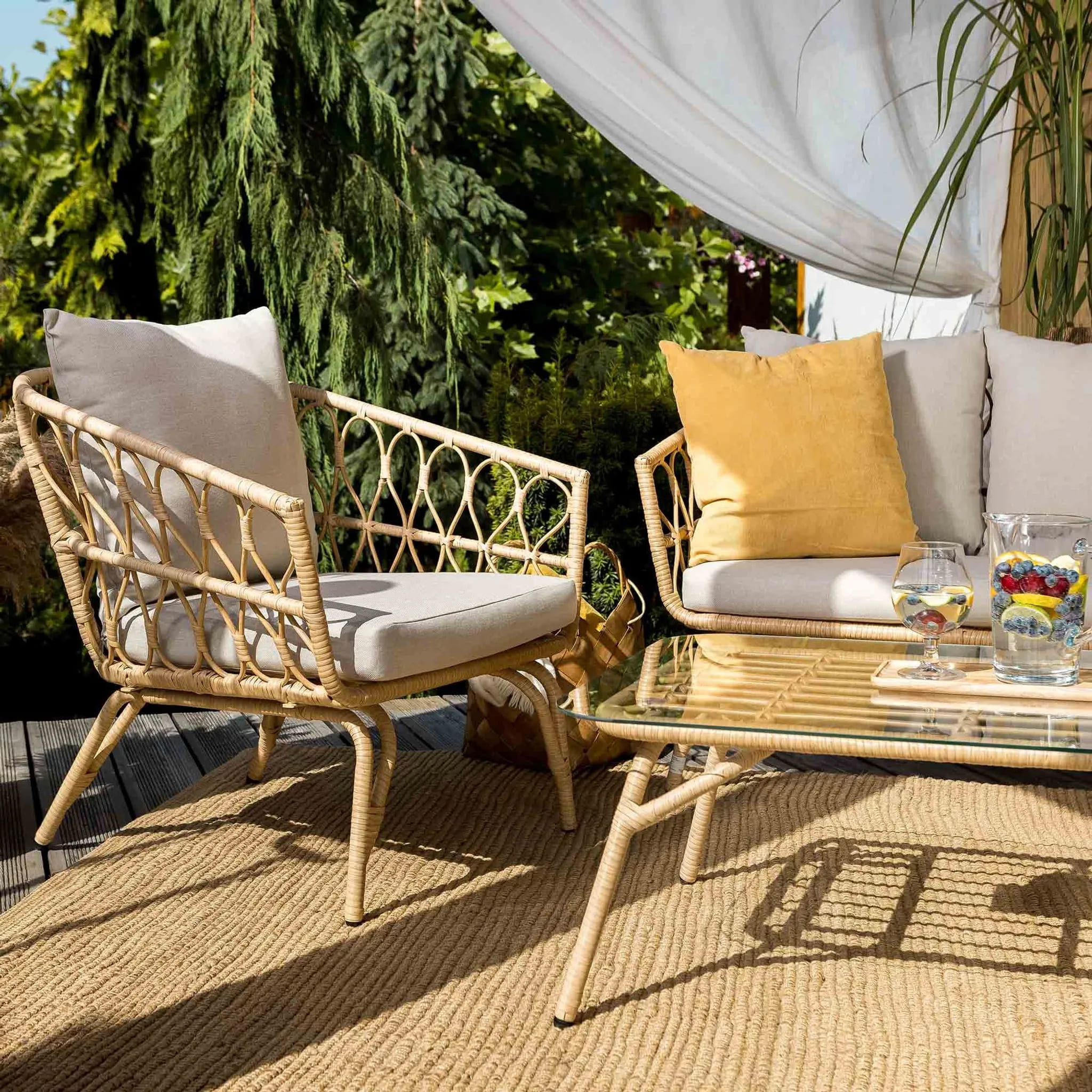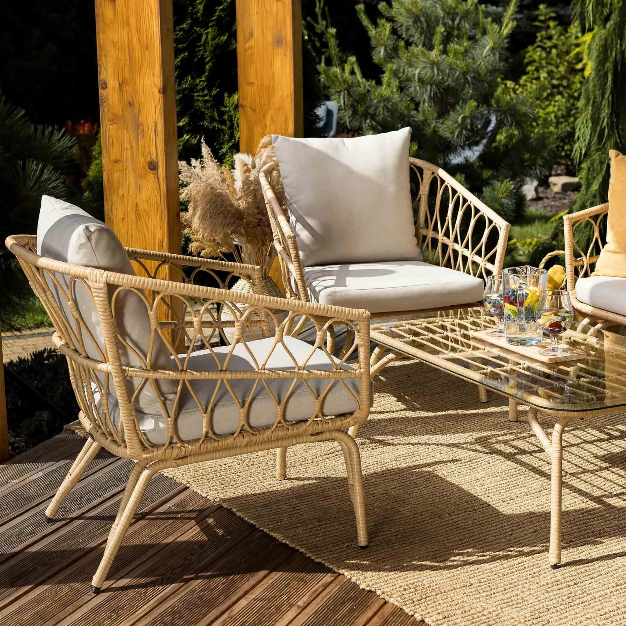 Мягкие подушки с плотным наполнителем и водоотталкивающей пропиткой обеспечивают комфорт и простоту ухода. Ажурный дизайн придает мебели легкость и делает комплект стильным дополнением любого экстерьера.