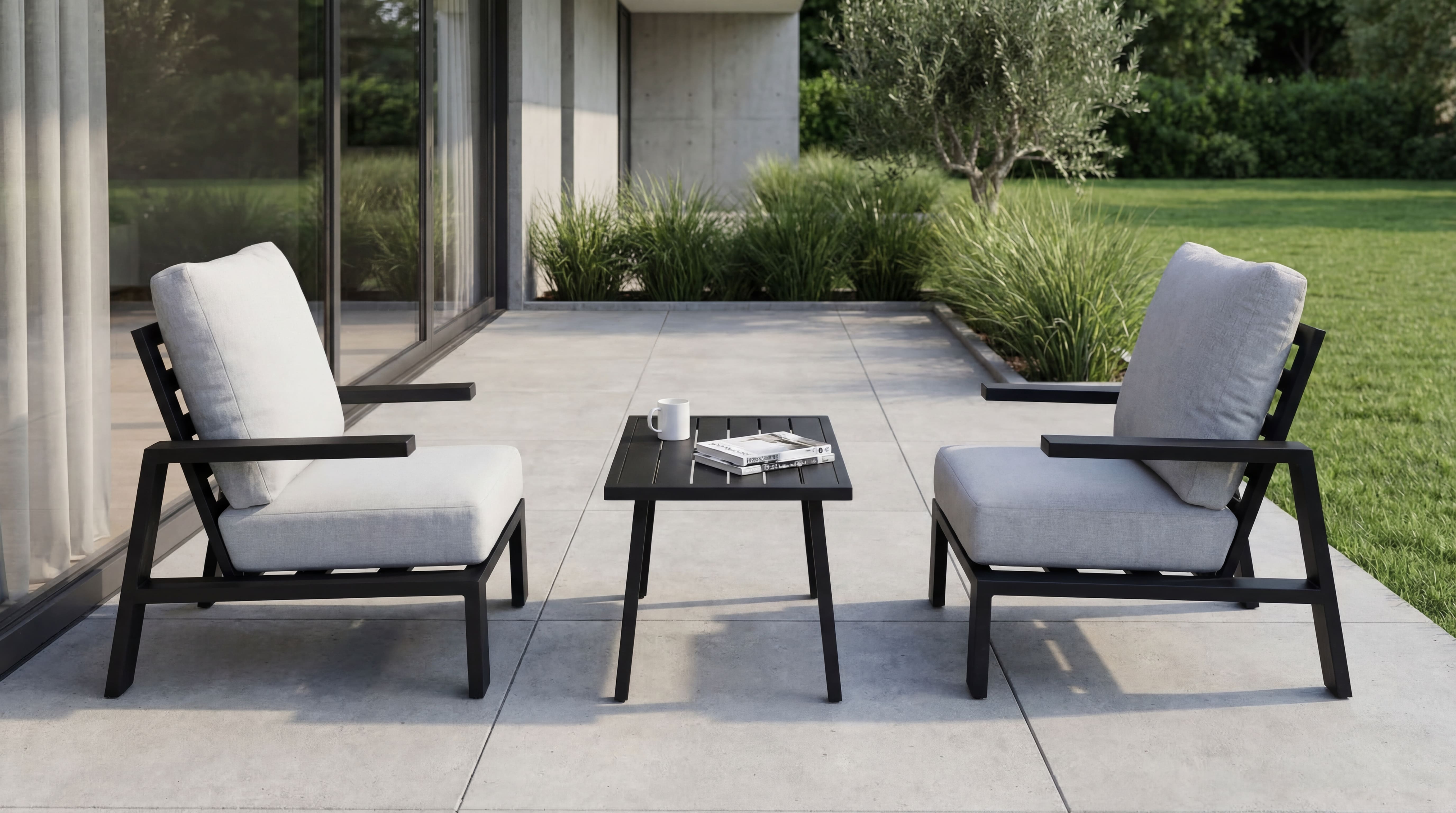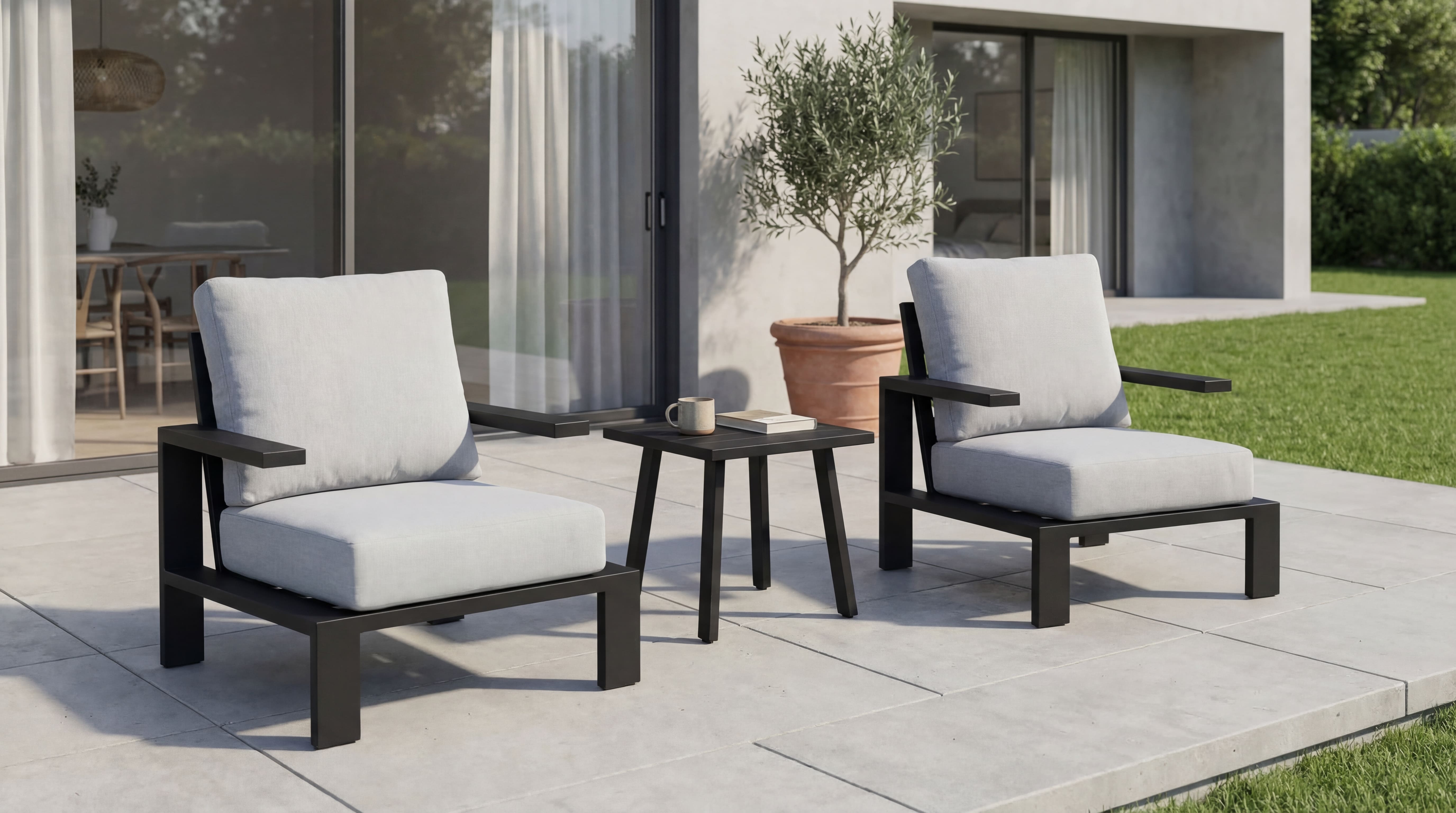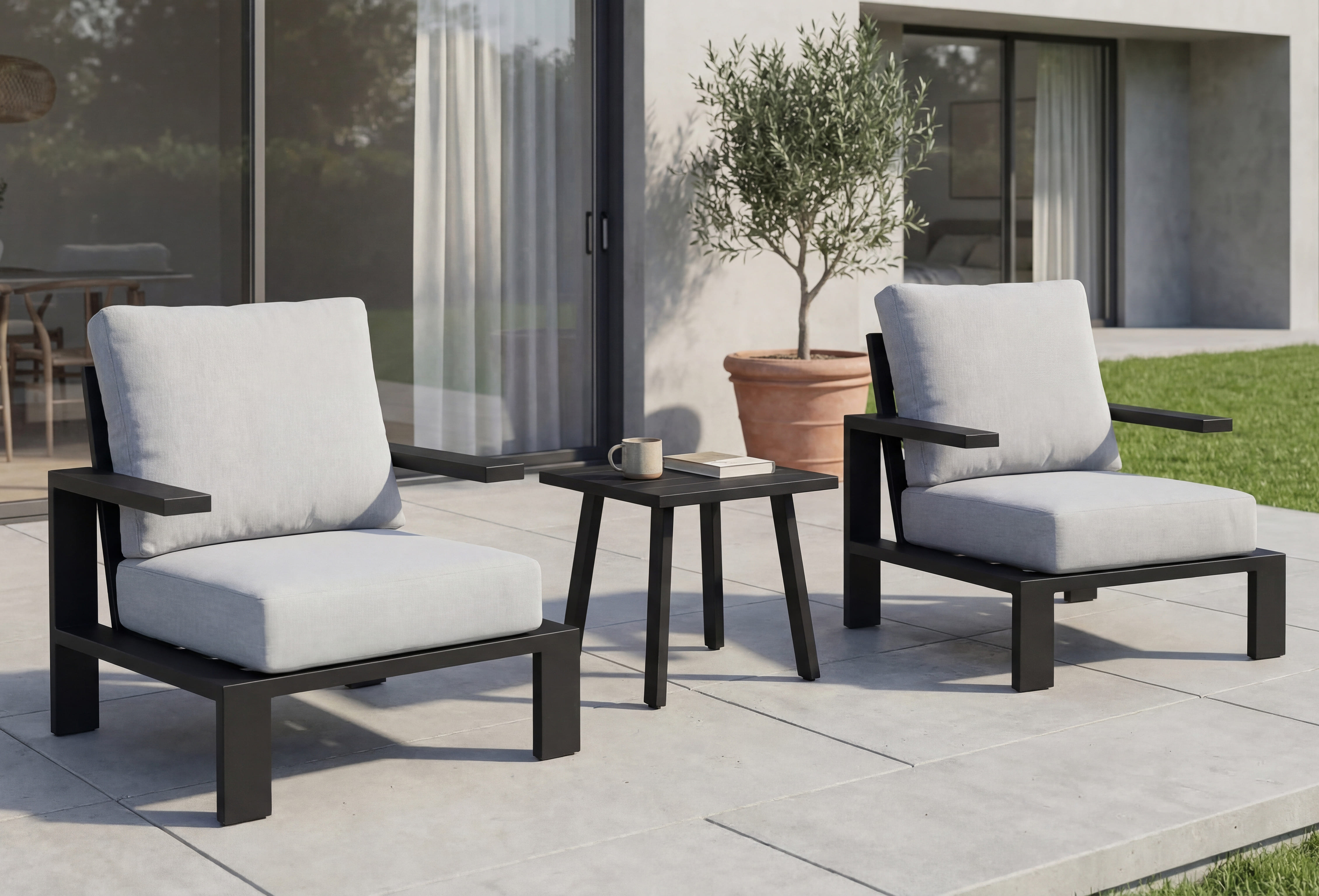Компактный набор из двух кресел и столика идеально подходит для небольших пространств. Материалы устойчивы к влаге, УФ-лучам и перепадам температур, что делает комплект универсальным для улицы и интерьера.