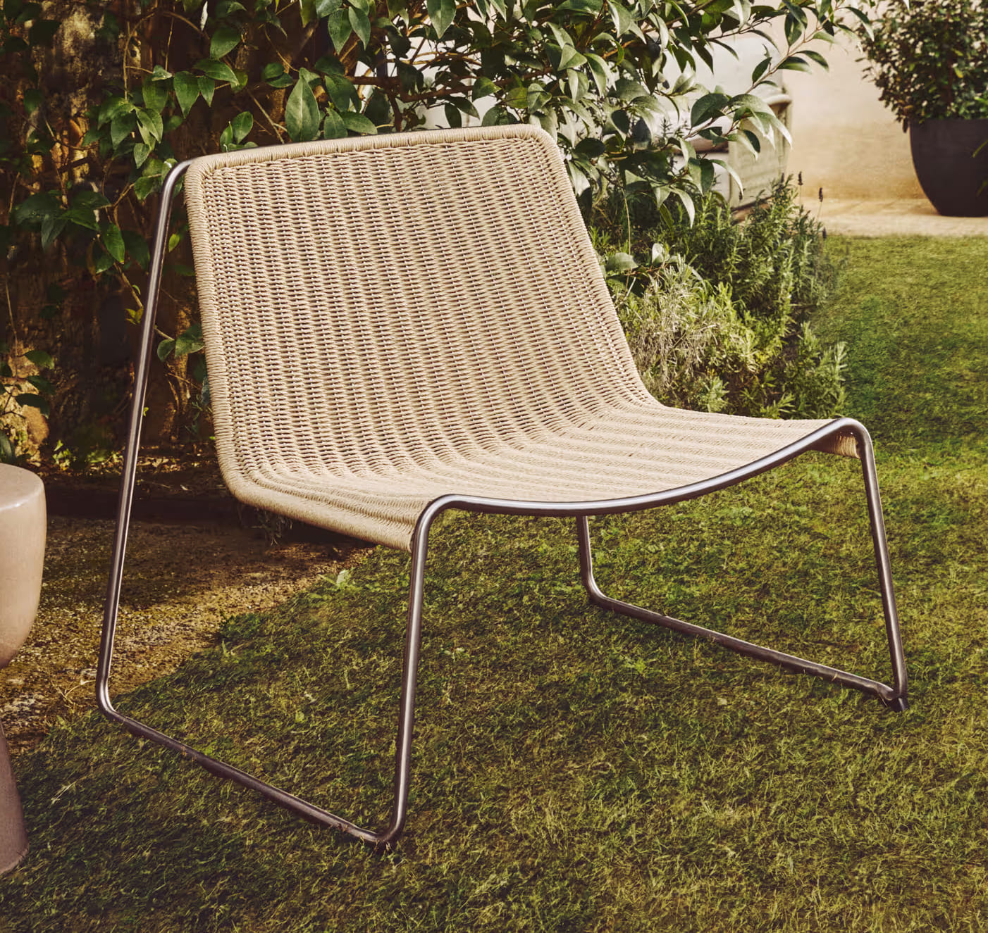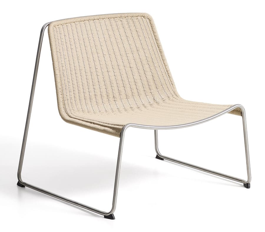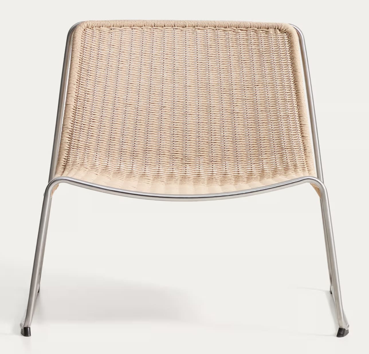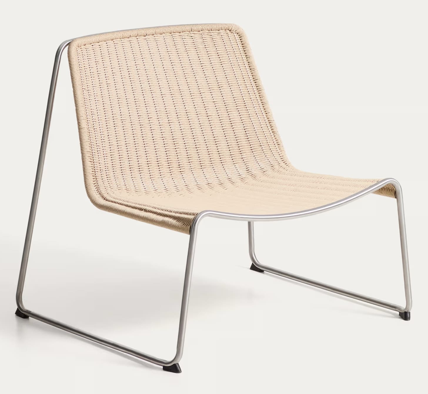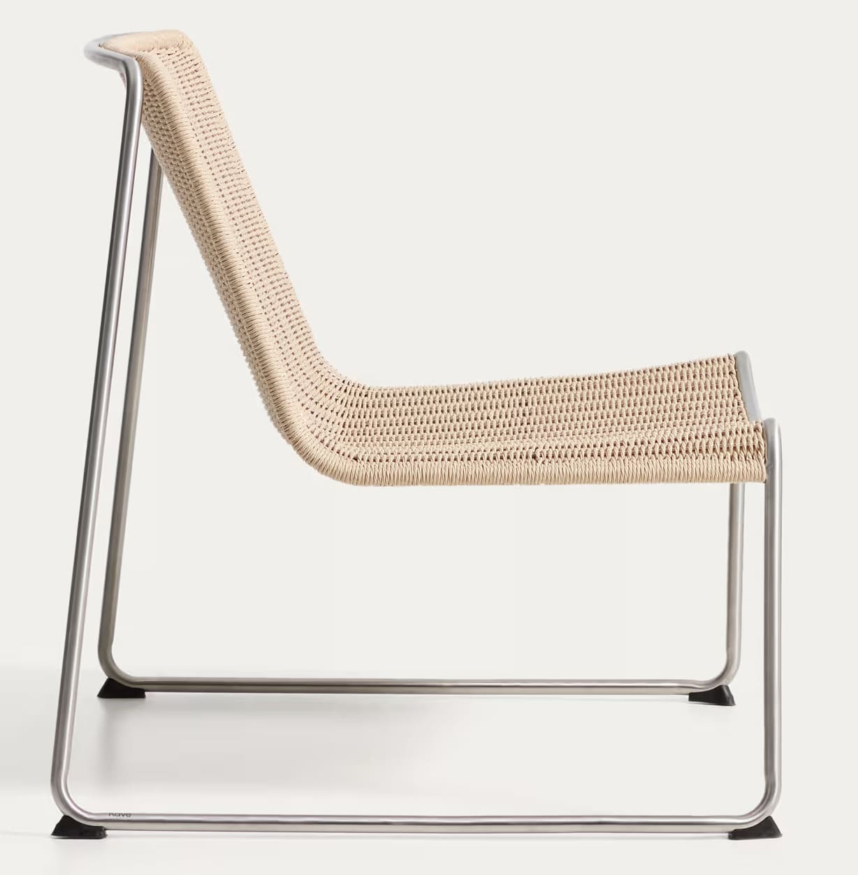 - Кресло с сиденьем, сплетенным вручную из синтетической веревки, и каркасом из нержавеющей стали.