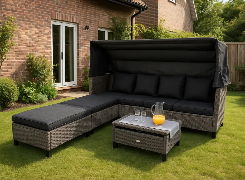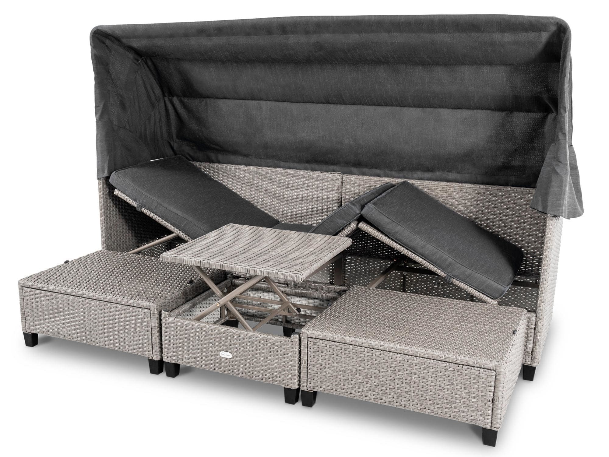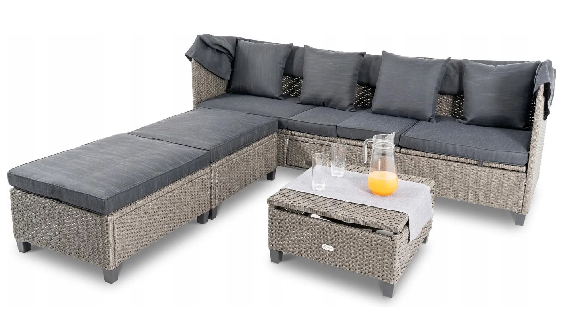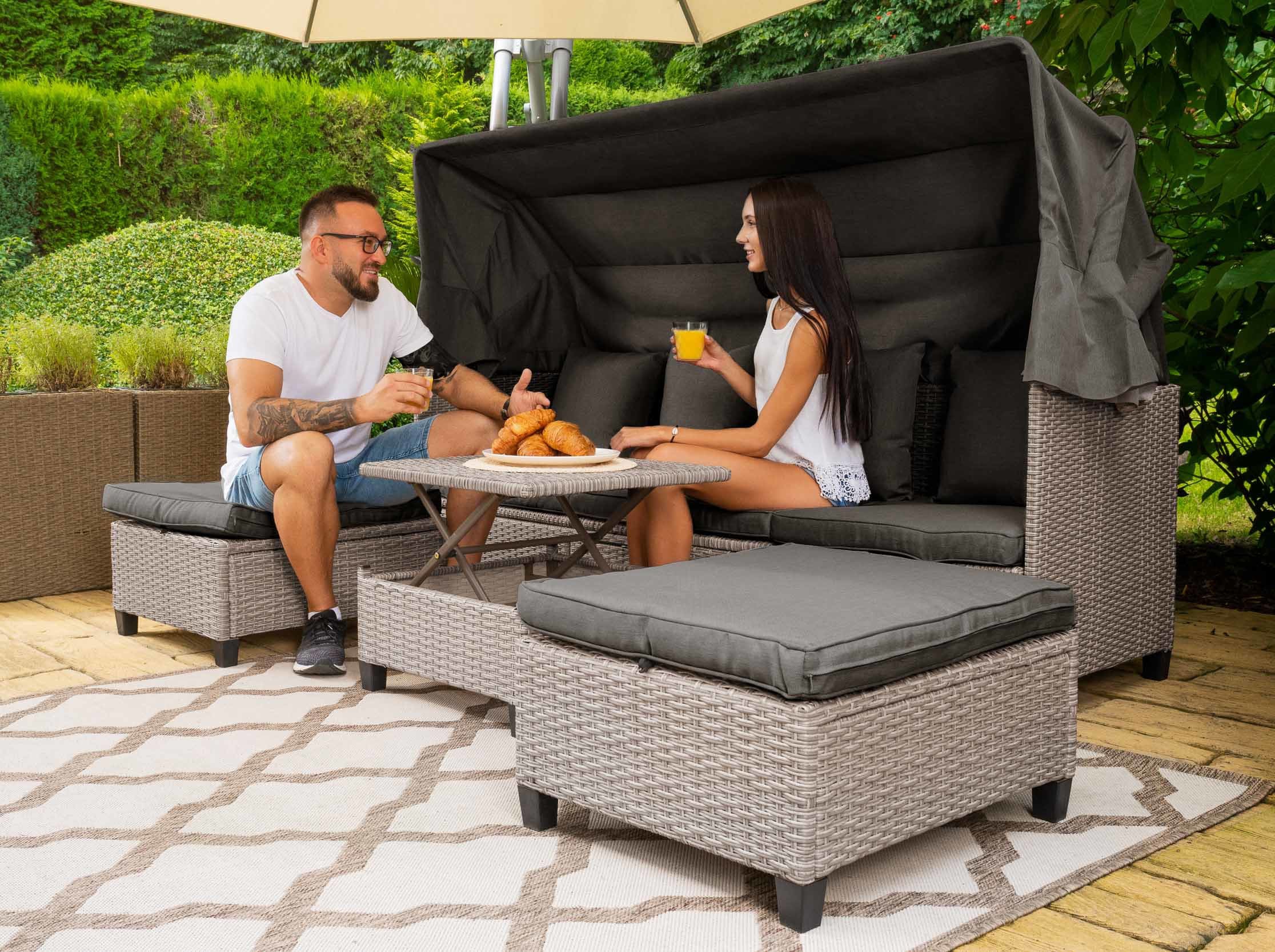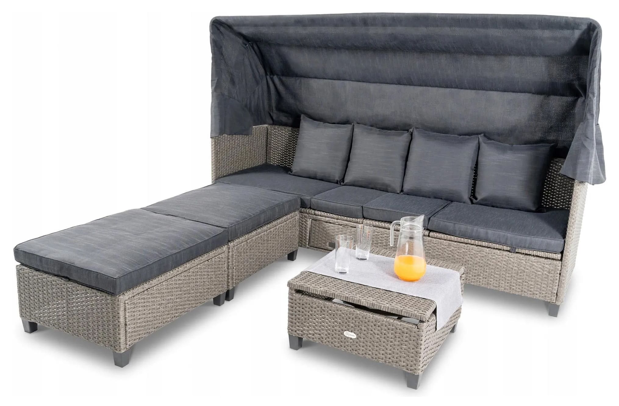 Диван имеет возможность регулировать угол наклона отдельных сегментов сиденья, благодаря чему диван легко трансформируется в шезлонг. Благодаря этой функции вы можете отрегулировать высоту лежака и спинки в наиболее удобное для вас положение, чтобы комфортно загорать или отдыхать, читая книгу и слушая звуки окружающей природы.