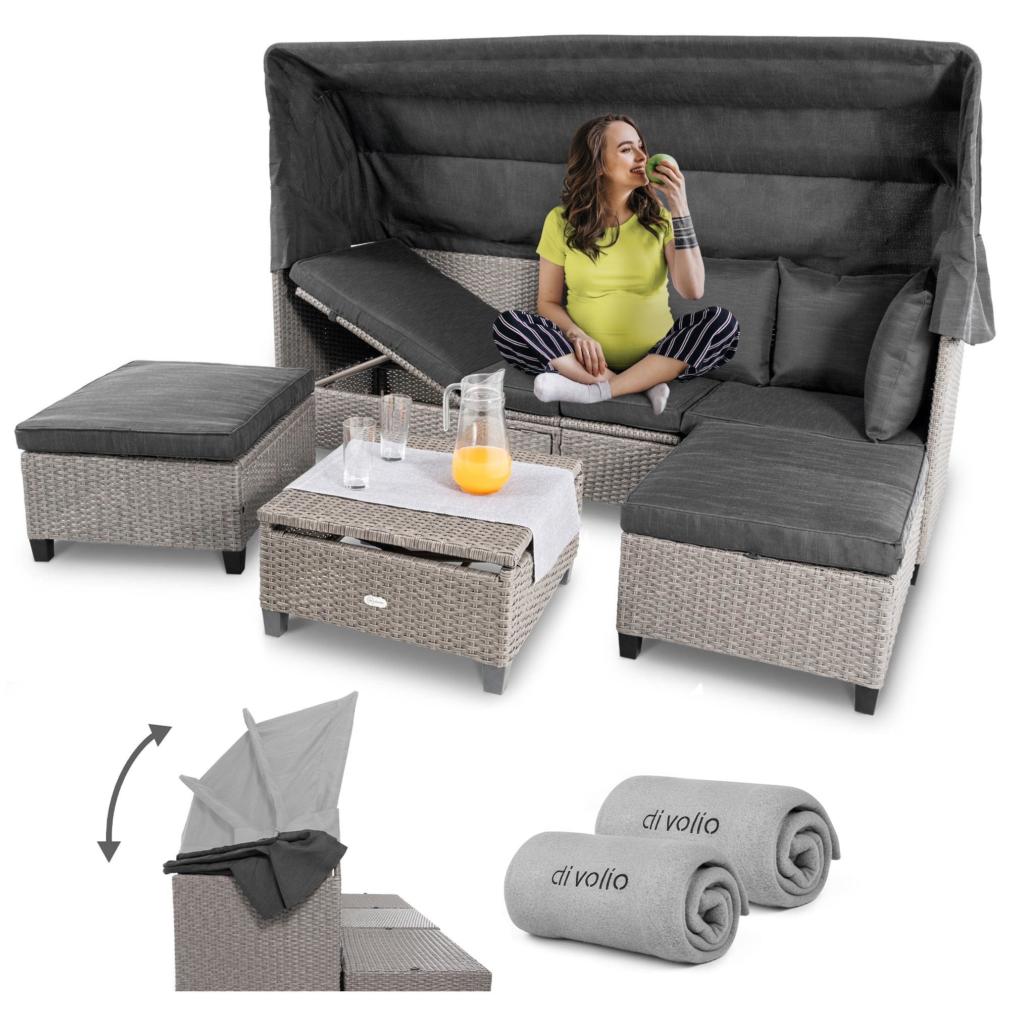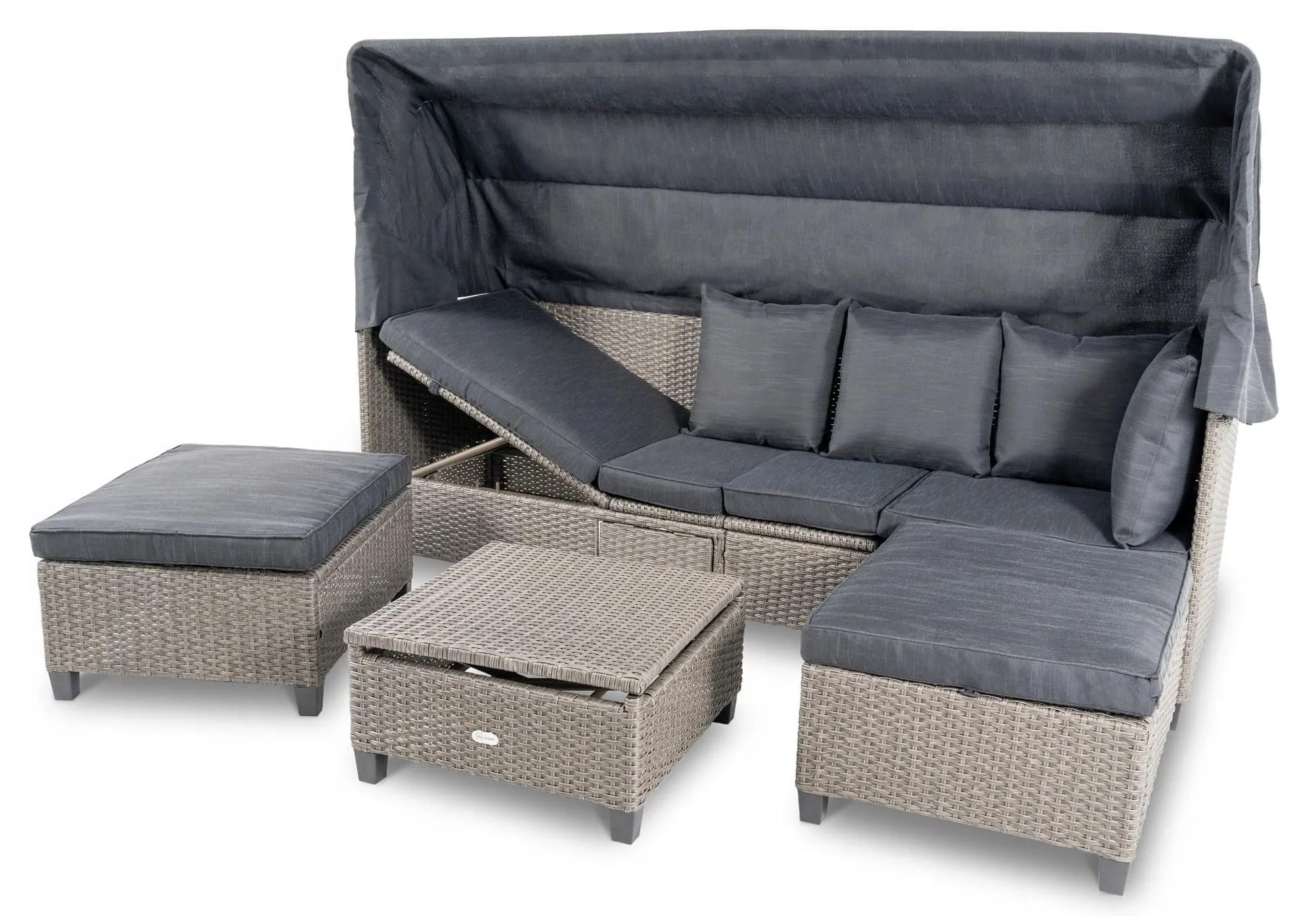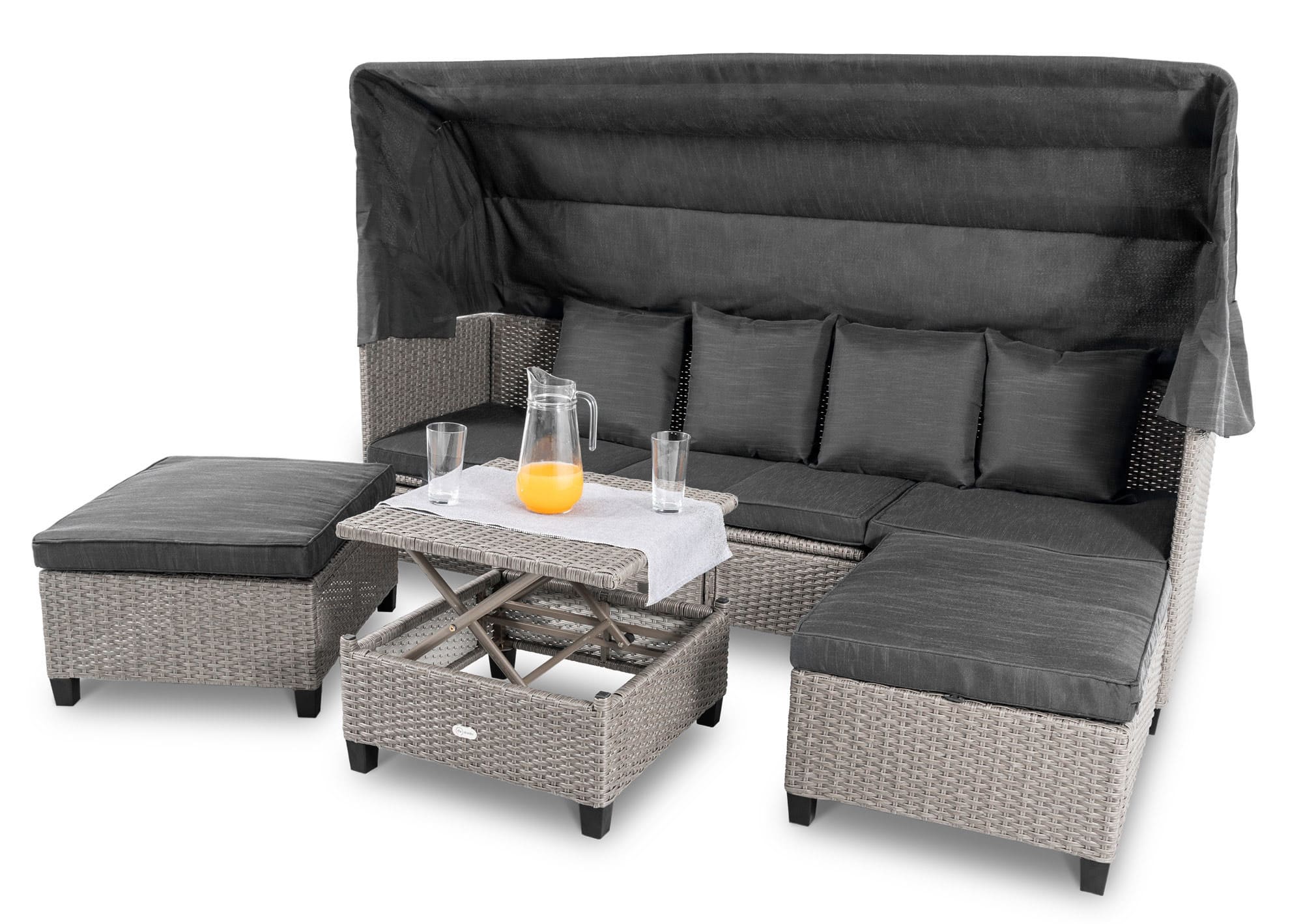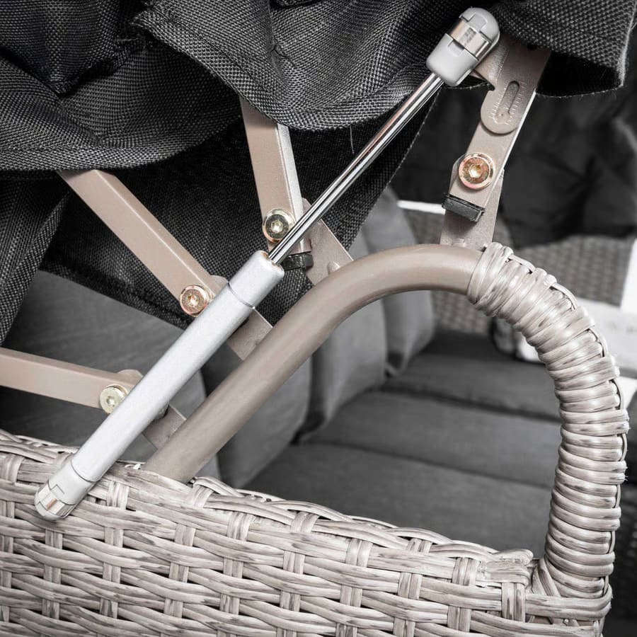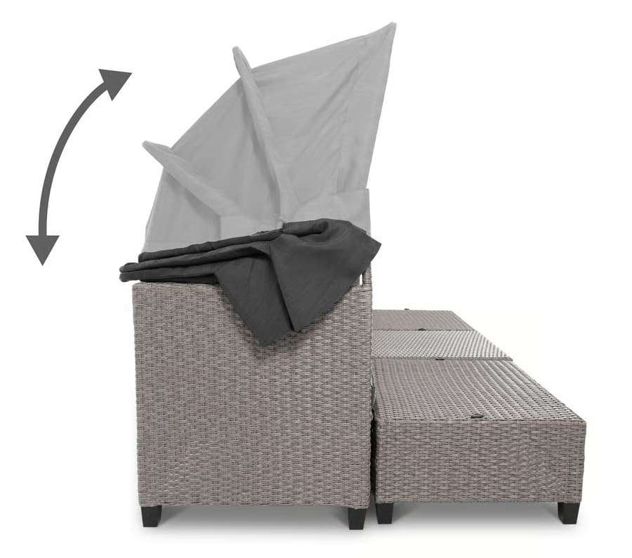Навес дивана имеет многоступенчатую систему сборки, поэтому вы можете регулировать его высоту в соответствии с вашими текущими потребностями - сложить его, если хотите погреться на солнце, или полностью развернуть, если хотите защититься от него.