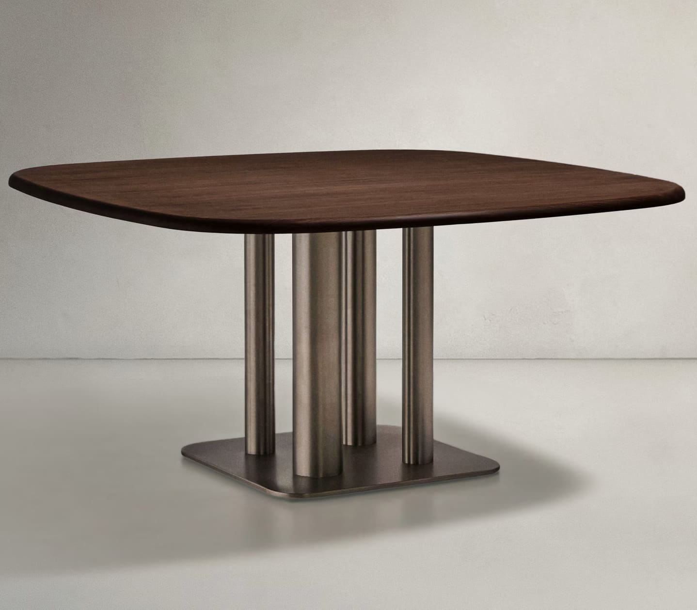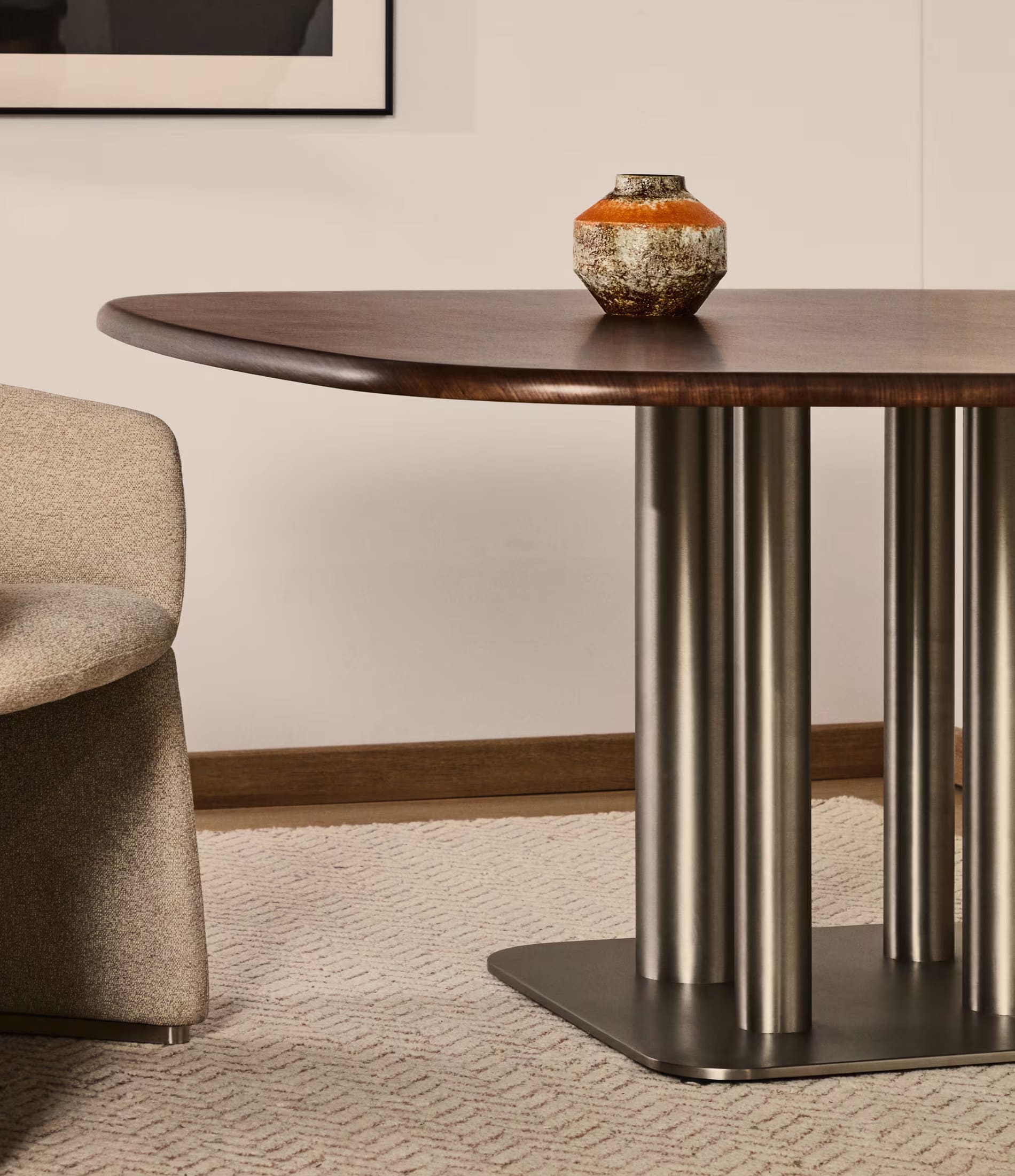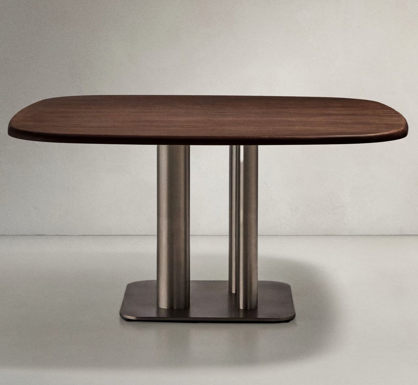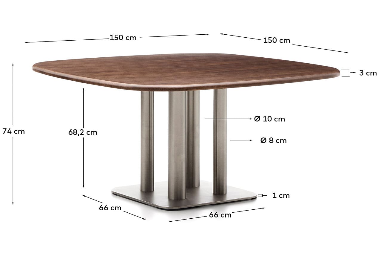 - Стол со столешницей из орехового шпона толщиной 0,6 мм с темной отделкой и ножками из нержавеющей стали разного диаметра с эффектом шлифовки, уменьшающим видимость отпечатков пальцев.