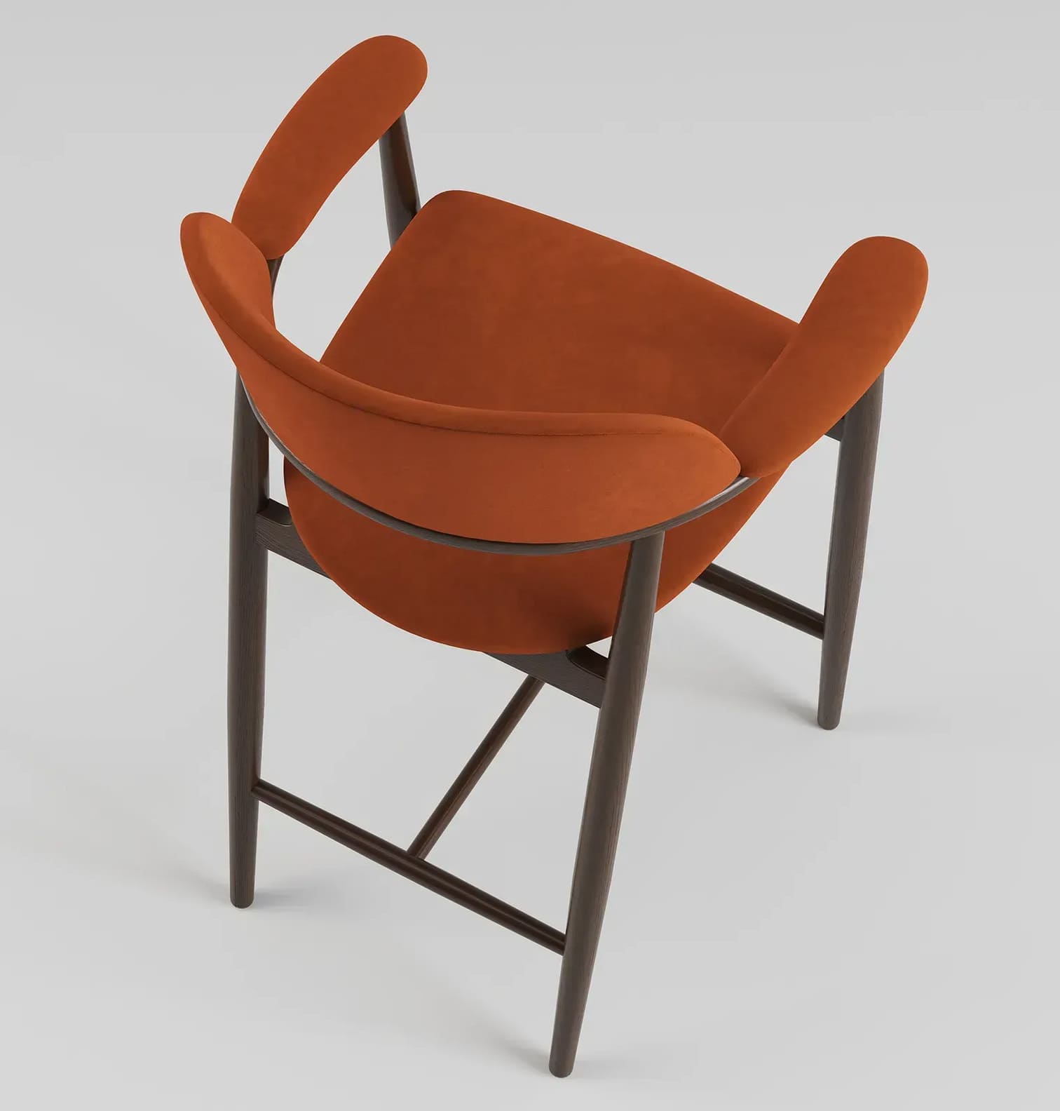 - Мягкое сиденье и спинка обеспечивают комфорт при длительном использовании, а обивка выполняется на заказ, что позволяет подобрать ткань и фактуру под конкретный интерьер — от кухни и барной зоны до кафе или ресторана. Удобные подлокотники плавно интегрированы в конструкцию, подчеркивая продуманную геометрию стула.
