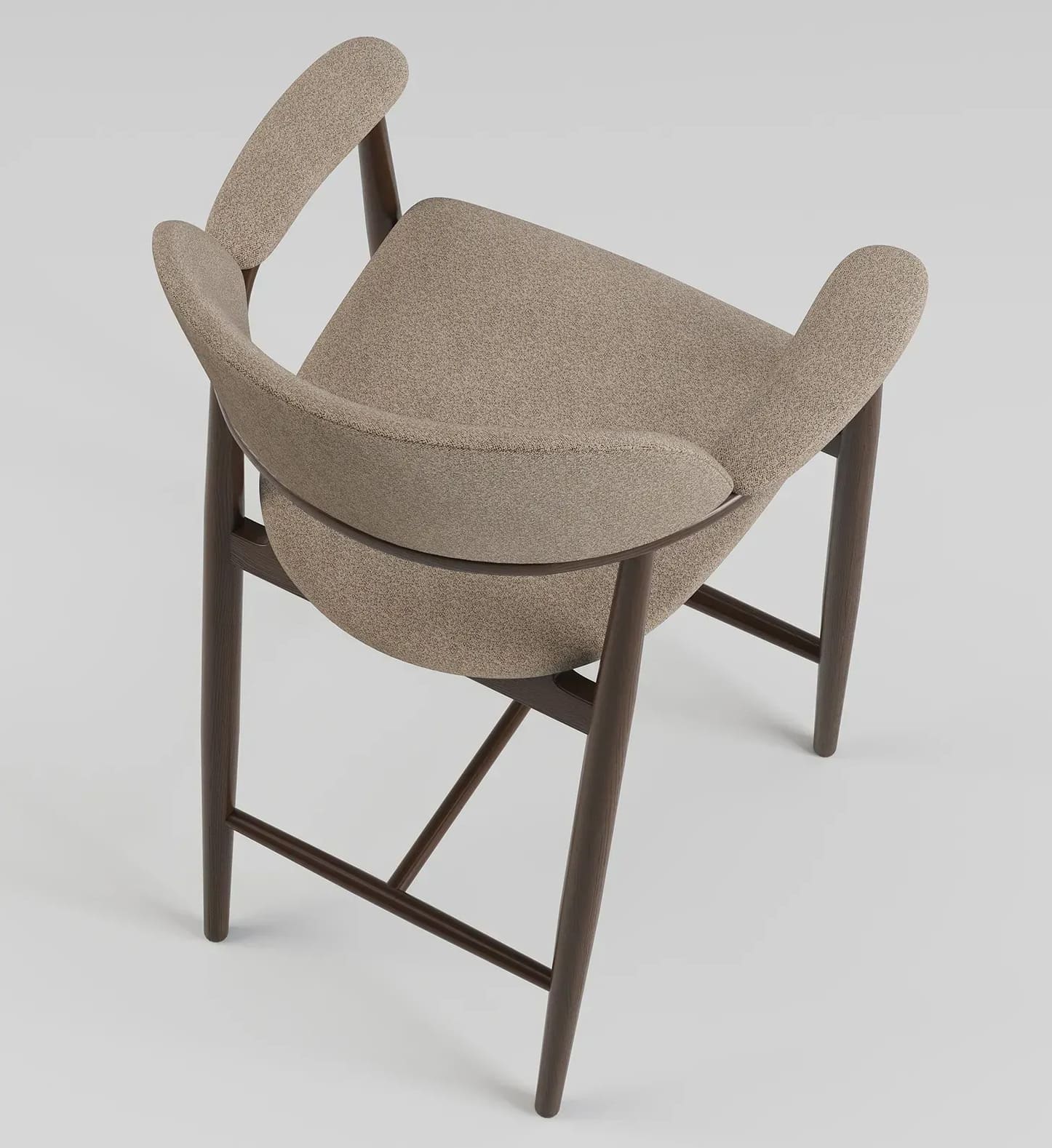- Мягкое сиденье и спинка обеспечивают комфорт при длительном использовании, а обивка выполняется на заказ, что позволяет подобрать ткань и фактуру под конкретный интерьер — от кухни и барной зоны до кафе или ресторана. Удобные подлокотники плавно интегрированы в конструкцию, подчеркивая продуманную геометрию стула.