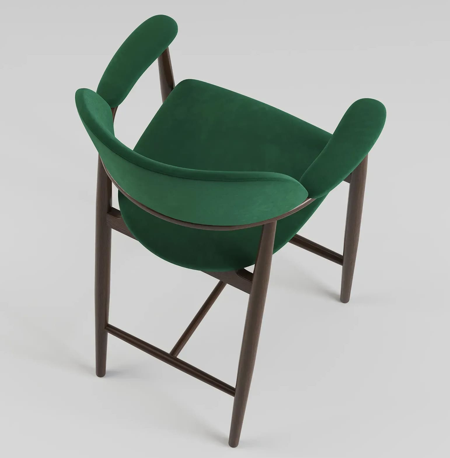 - Мягкое сиденье и спинка обеспечивают комфорт при длительном использовании, а обивка выполняется на заказ, что позволяет подобрать ткань и фактуру под конкретный интерьер — от кухни и барной зоны до кафе или ресторана. Удобные подлокотники плавно интегрированы в конструкцию, подчеркивая продуманную геометрию стула.