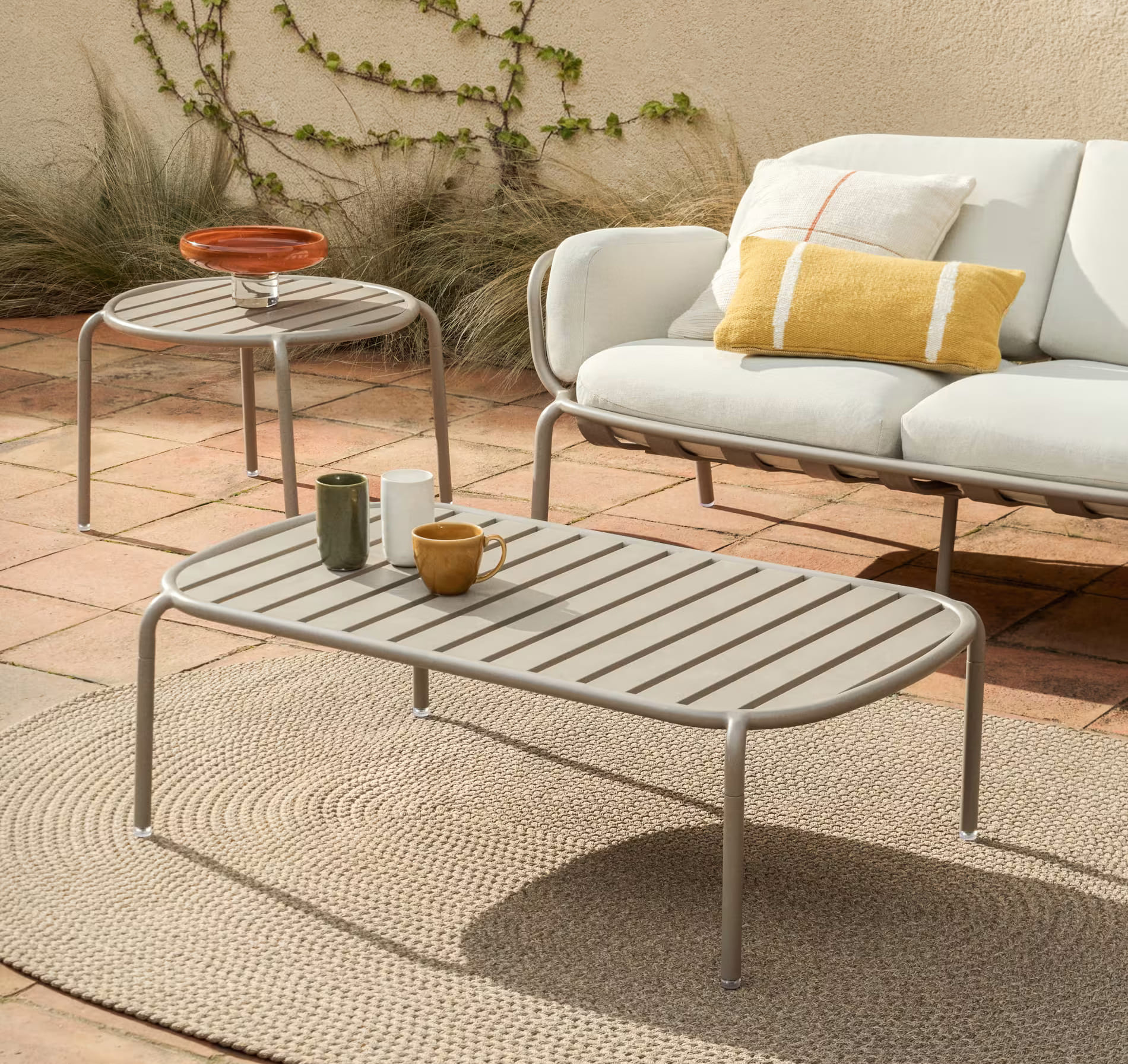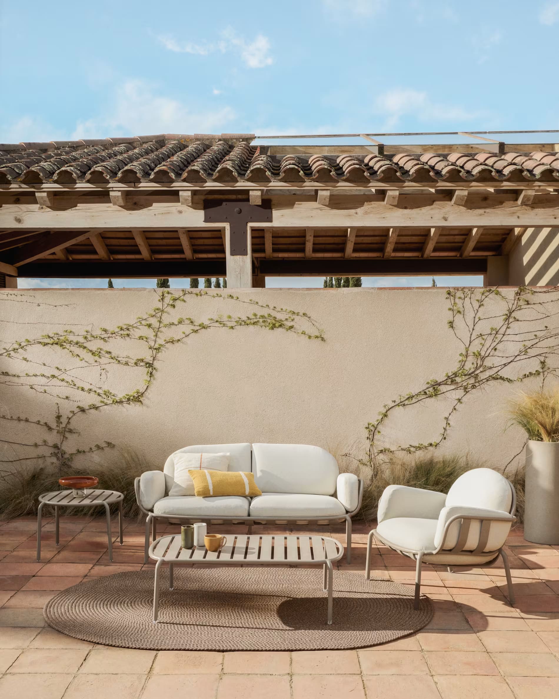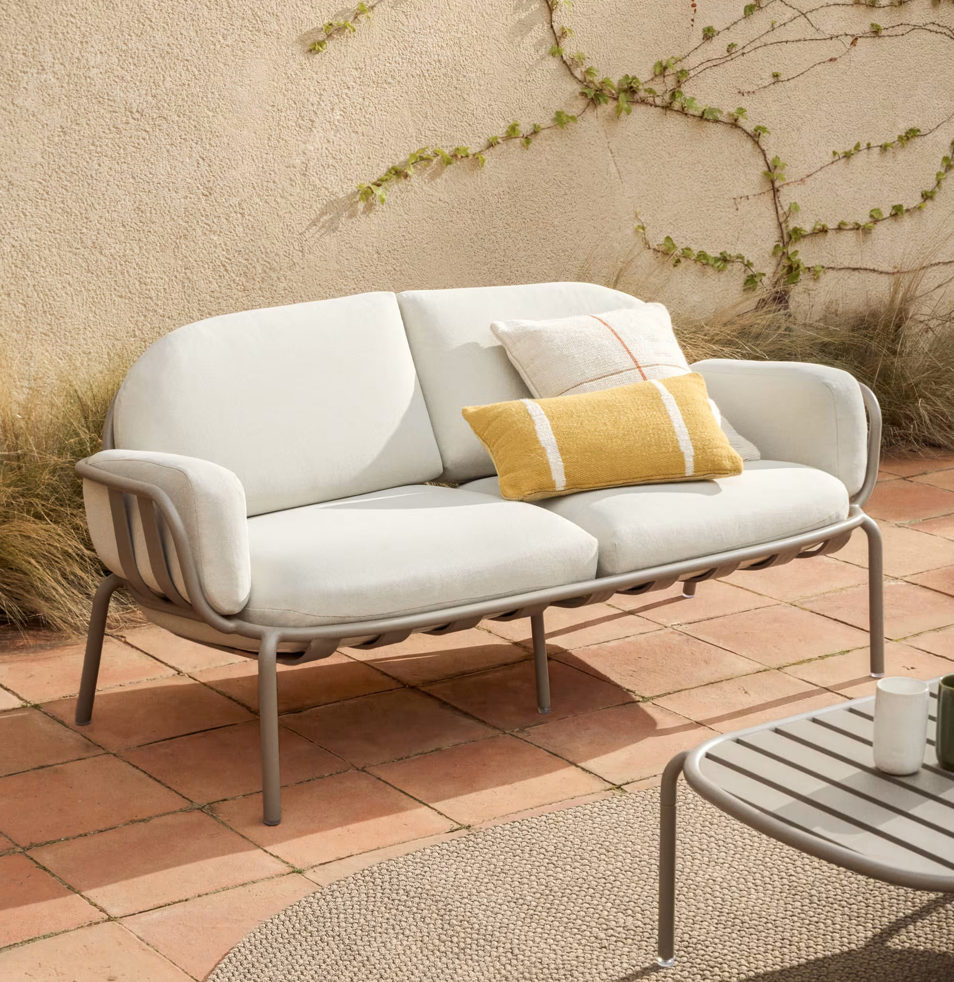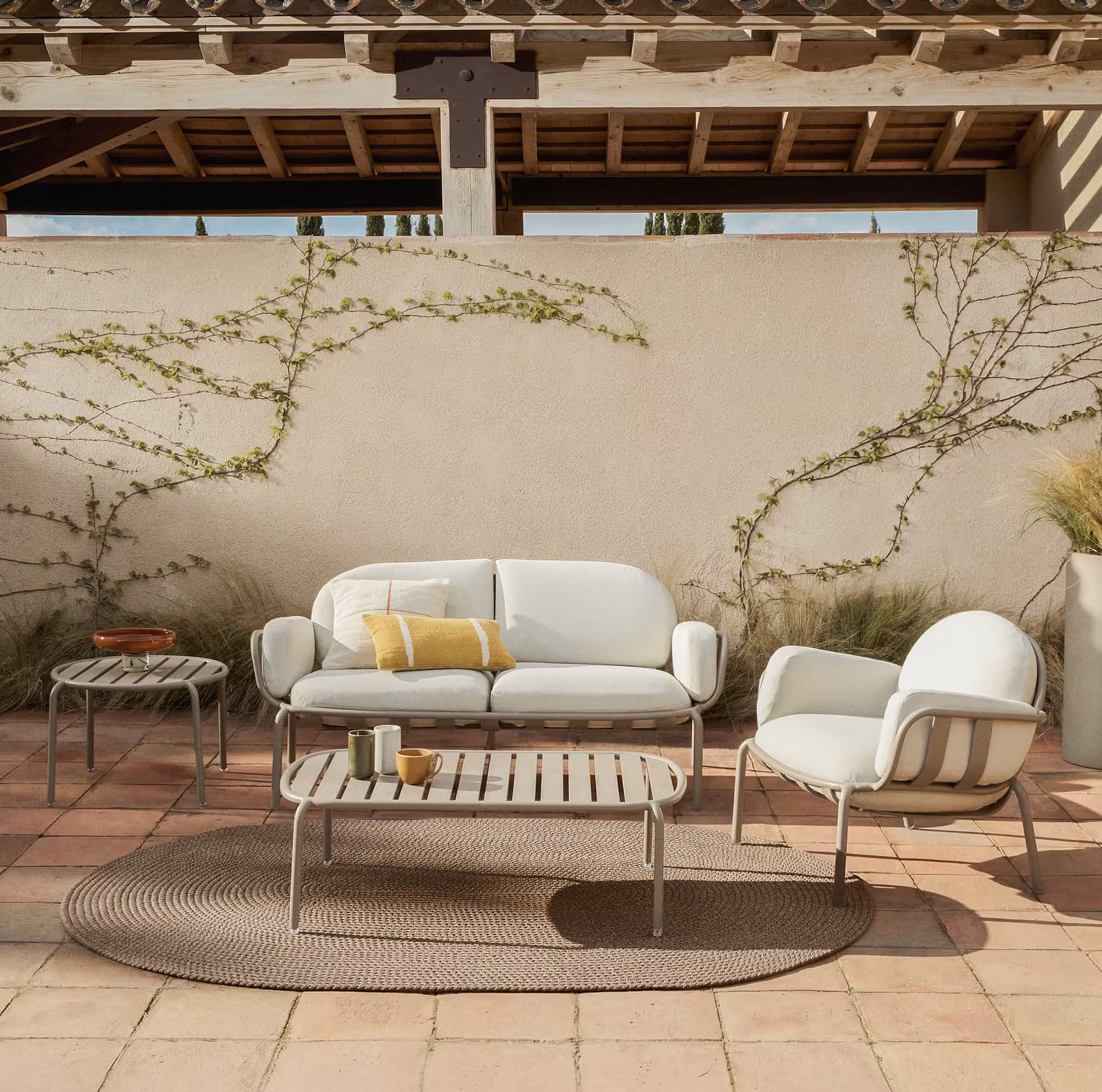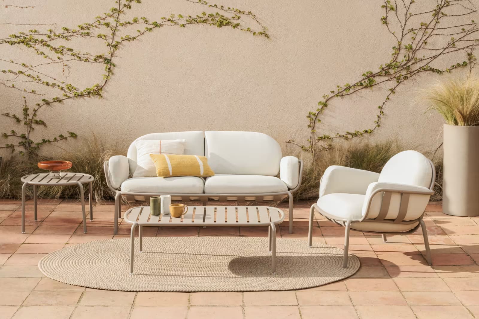 Стильный садовый комплект мебели Joncols для террасы и сада в светлых бежевых оттенках. В набор входят диван, кресло и два столика — идеальное решение для создания уютной лаунж-зоны на улице.