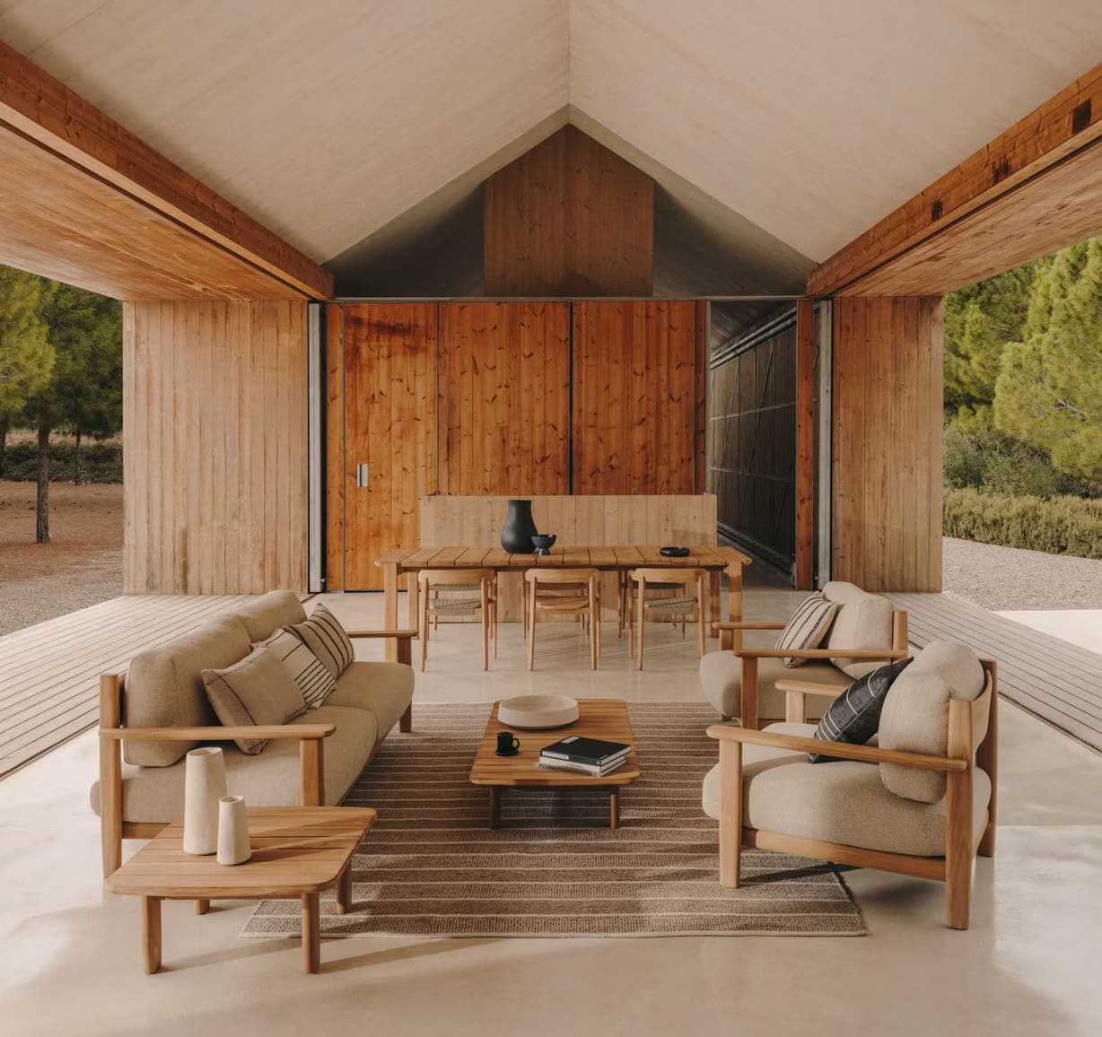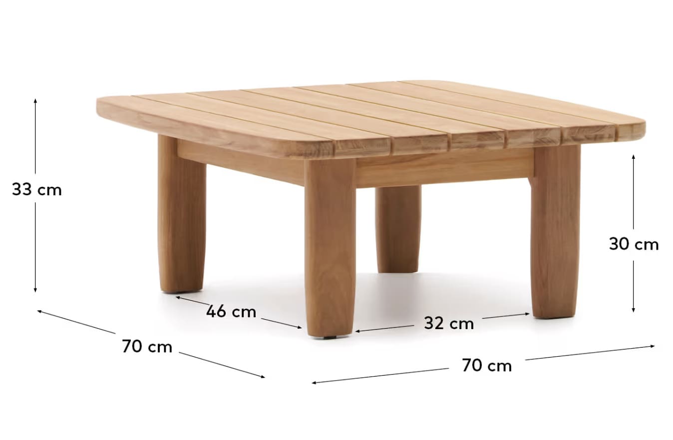 Мебель изготовлена из прочного тика, устойчивого к влаге и погодным условиям, а мягкие подушки обеспечивают комфортный отдых. Комплект отлично подходит как для уютных семейных вечеров, так и для приема гостей.