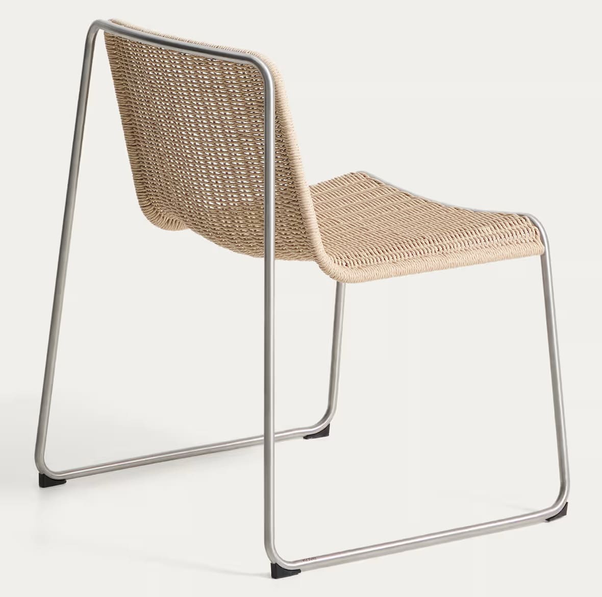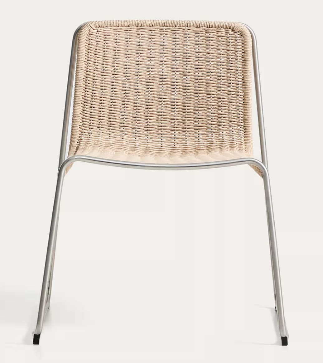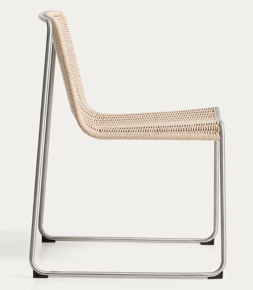 - Стул с сиденьем, сплетенным вручную из синтетической веревки, и каркасом из нержавеющей стали.