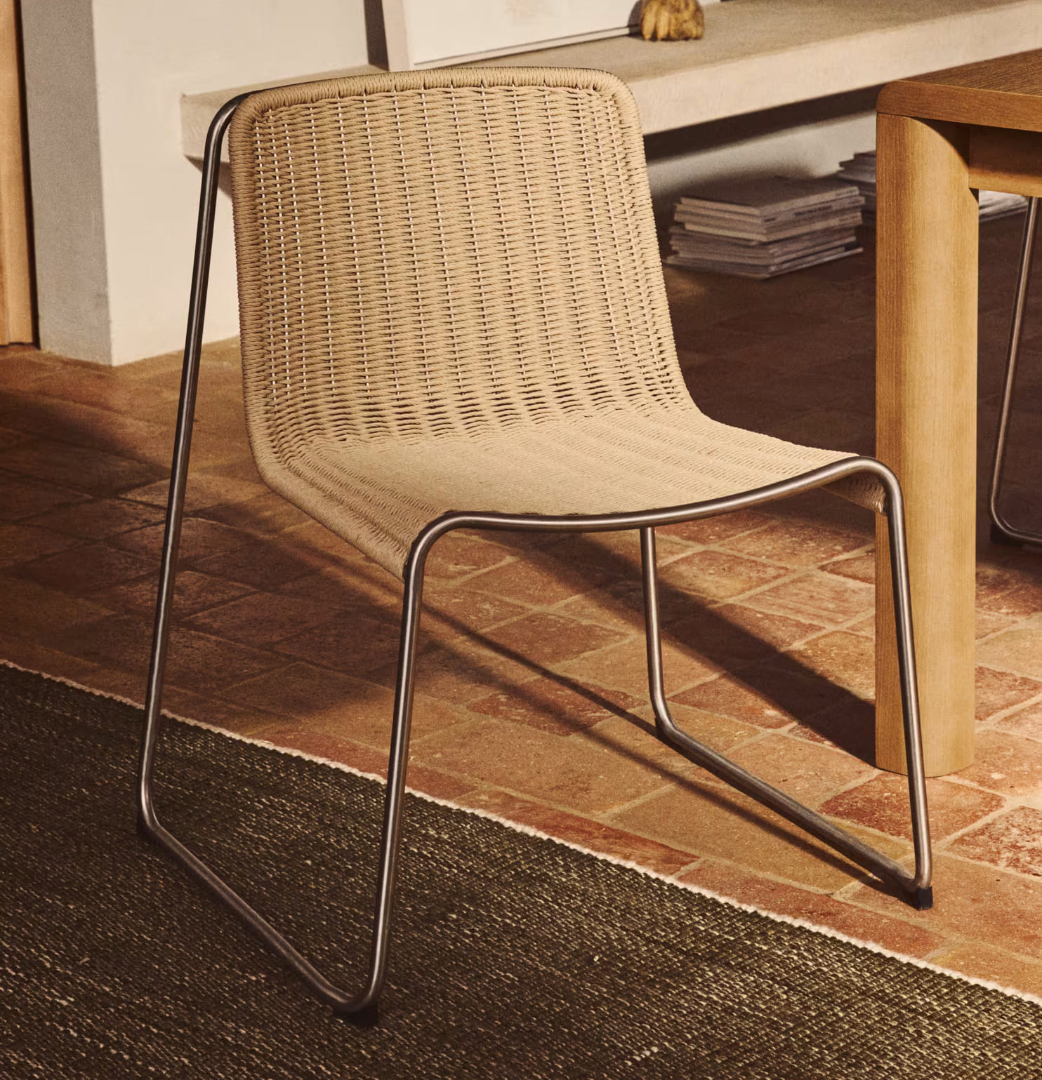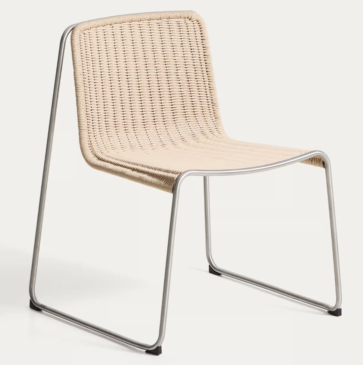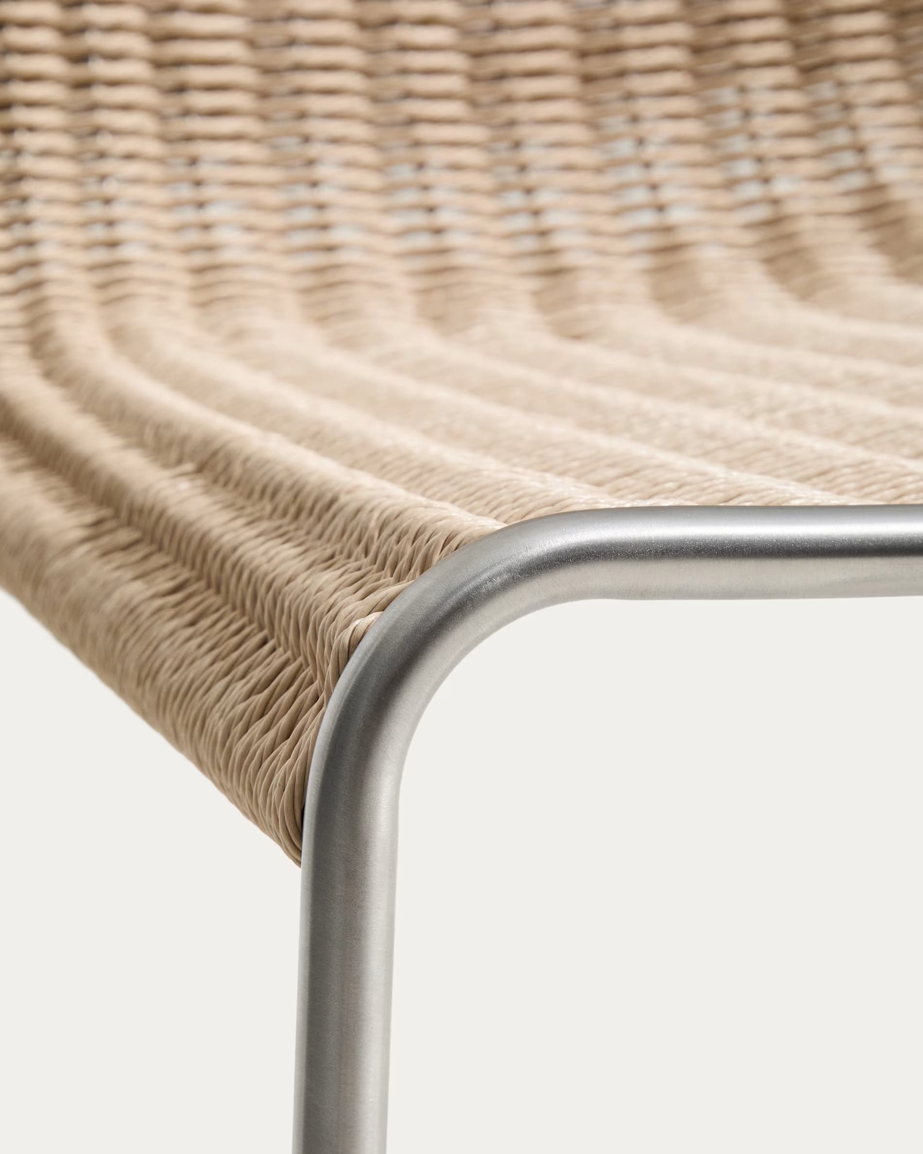 - Стул с сиденьем, сплетенным вручную из синтетической веревки, и каркасом из нержавеющей стали.