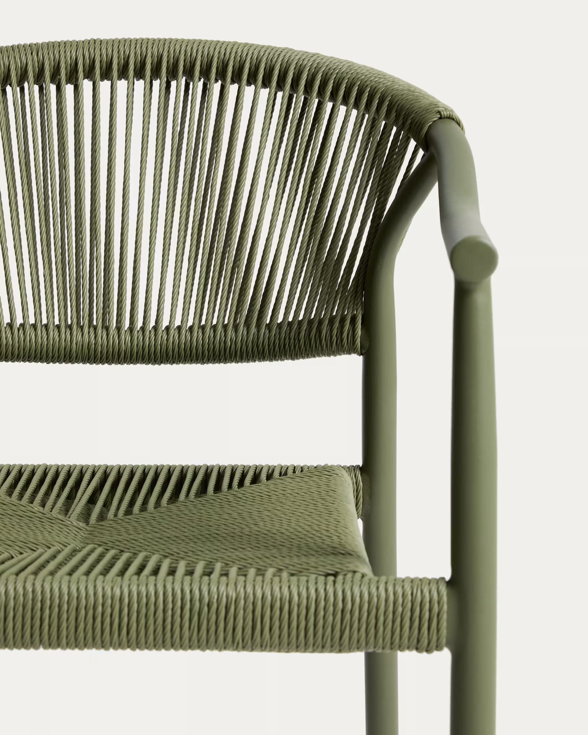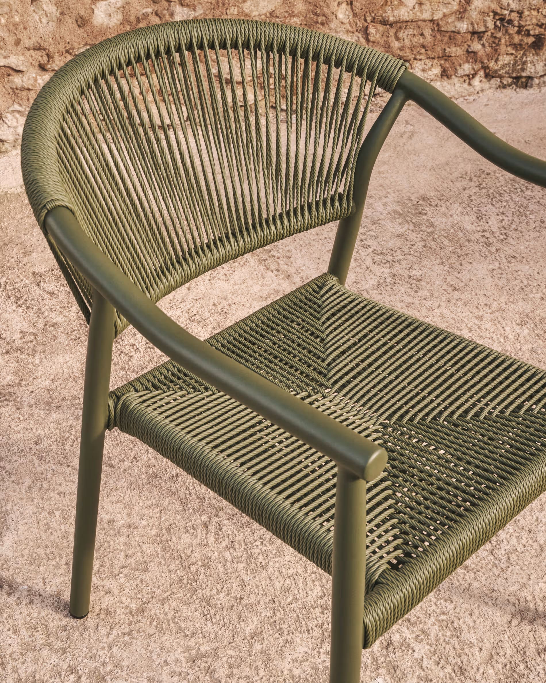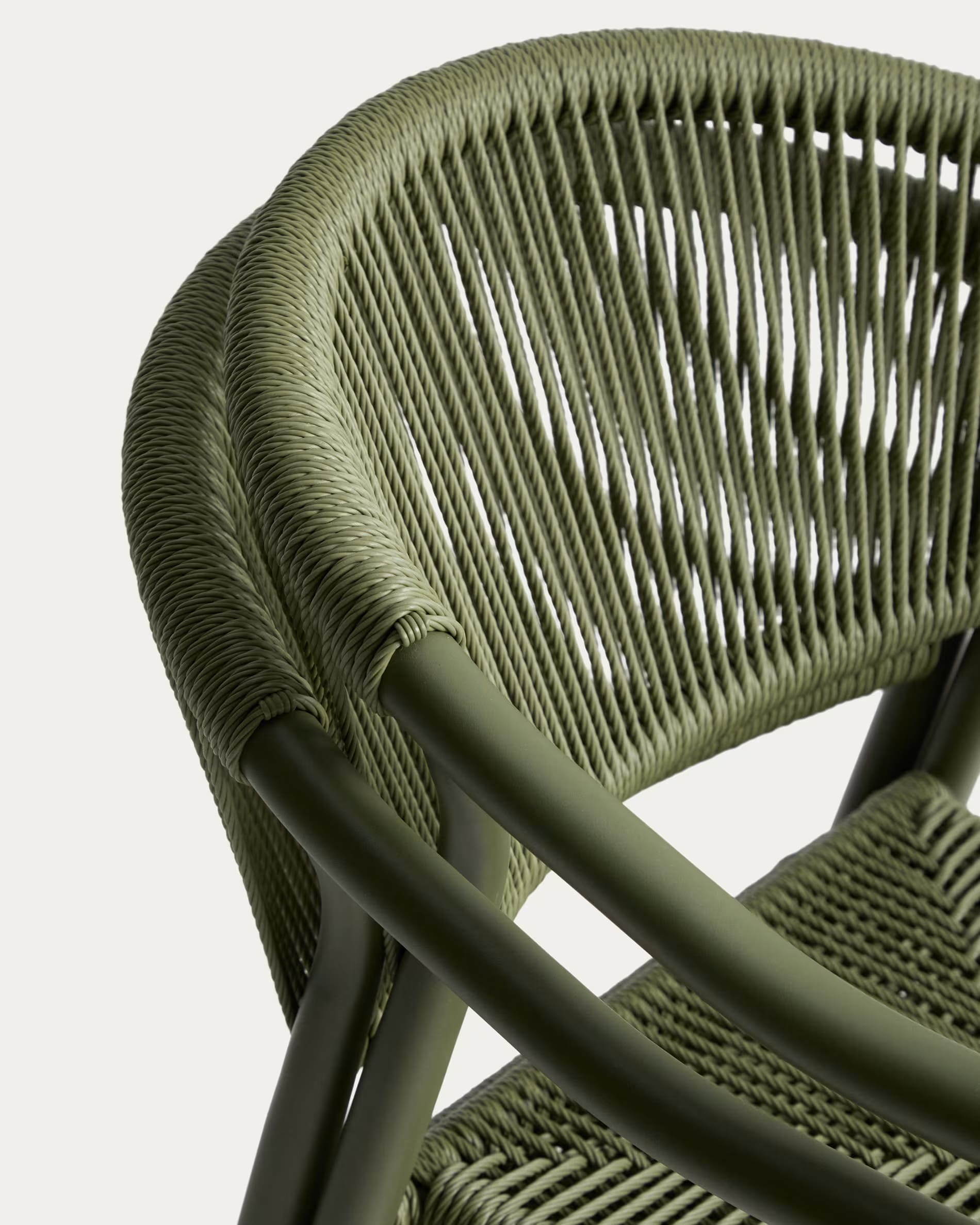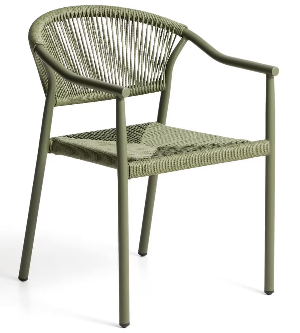 Уличный стул La Forma Livadia Зеленый — современный стул для террасы, балкона или кафе. Легкий алюминиевый каркас устойчив к влаге, коррозии и ультрафиолету, а плетеное сиденье из синтетической веревки обеспечивает комфорт и вентиляцию. Подходит для использования на улице и в помещении, легко штабелируется.