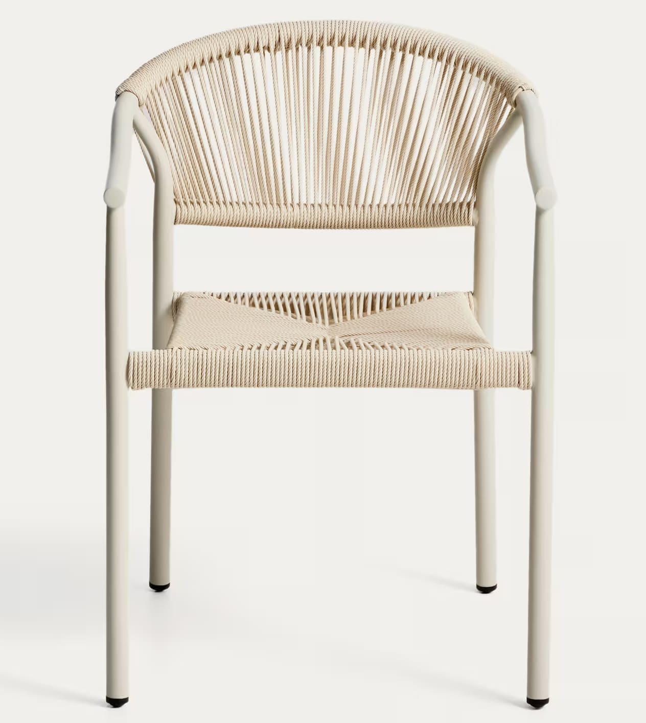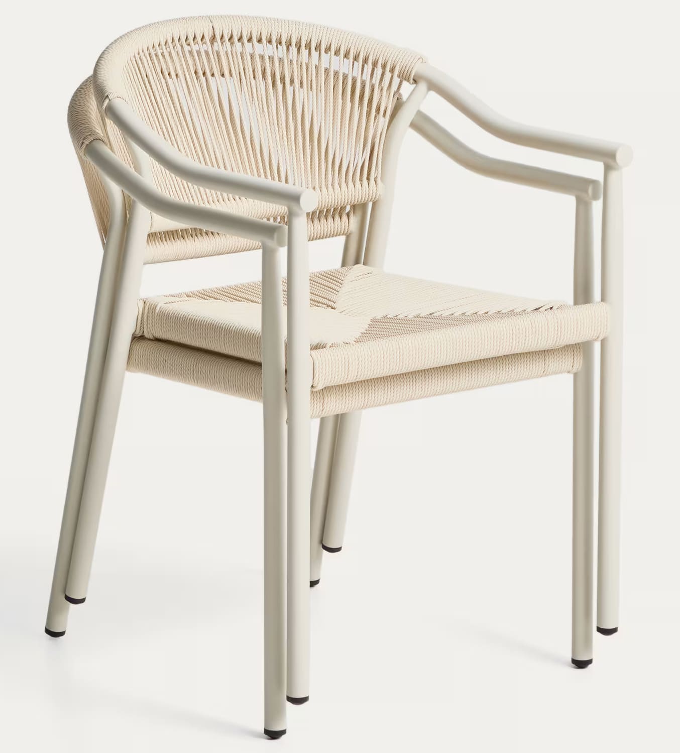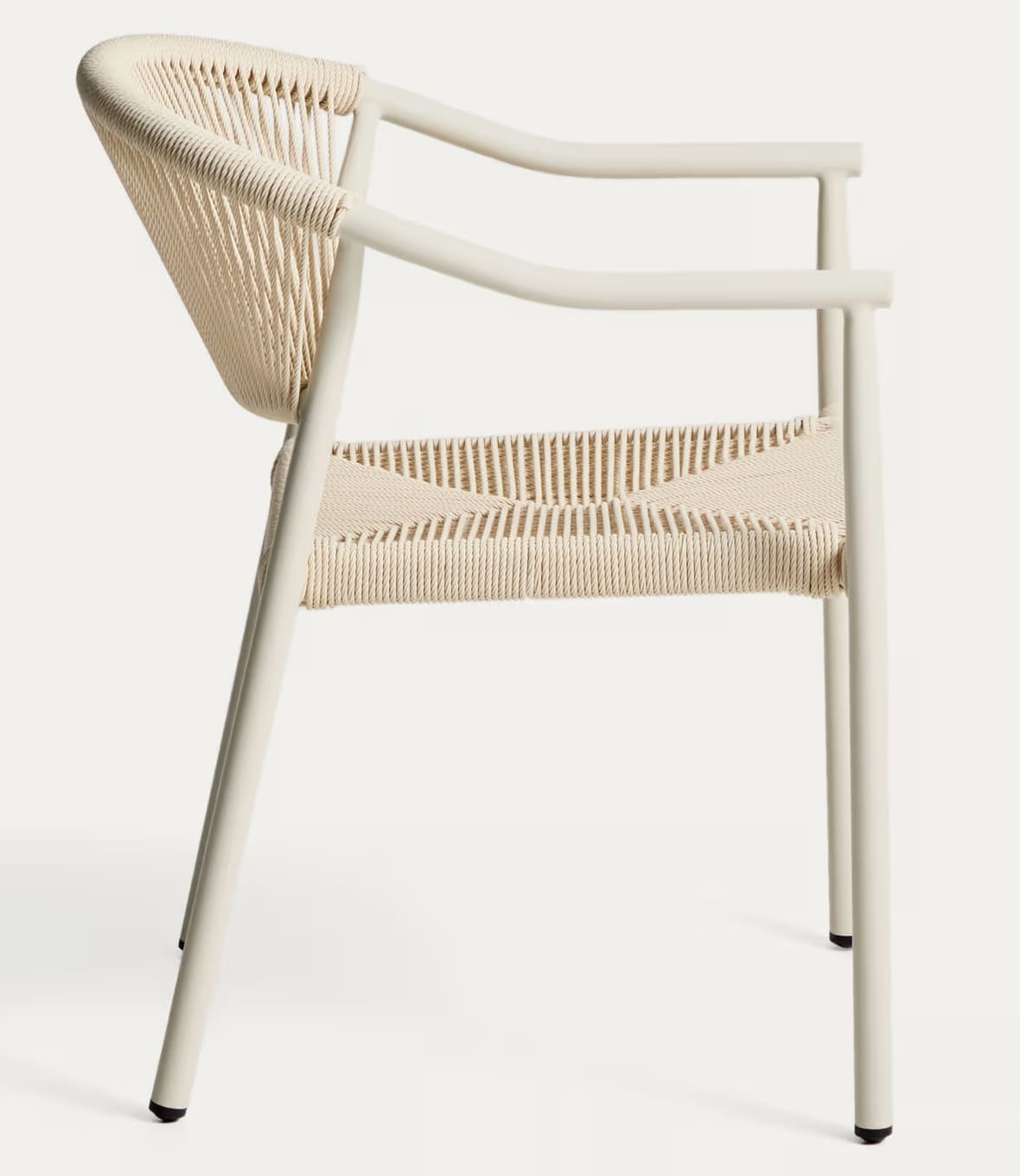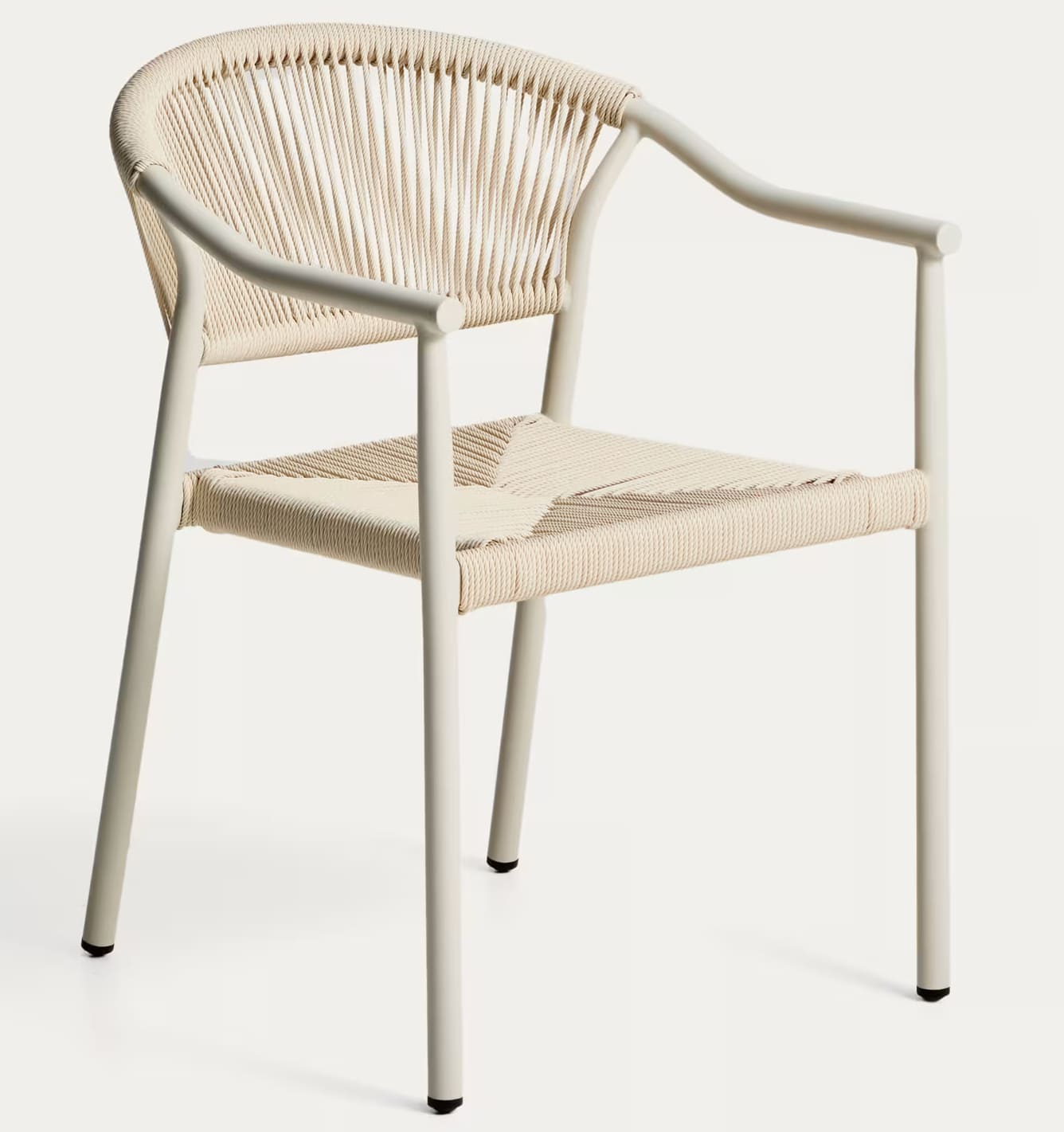 Уличный стул La Forma Livadia экрю — современный стул для террасы, балкона или кафе. Легкий алюминиевый каркас устойчив к влаге, коррозии и ультрафиолету, а плетеное сиденье из синтетической веревки обеспечивает комфорт и вентиляцию. Подходит для использования на улице и в помещении, легко штабелируется.