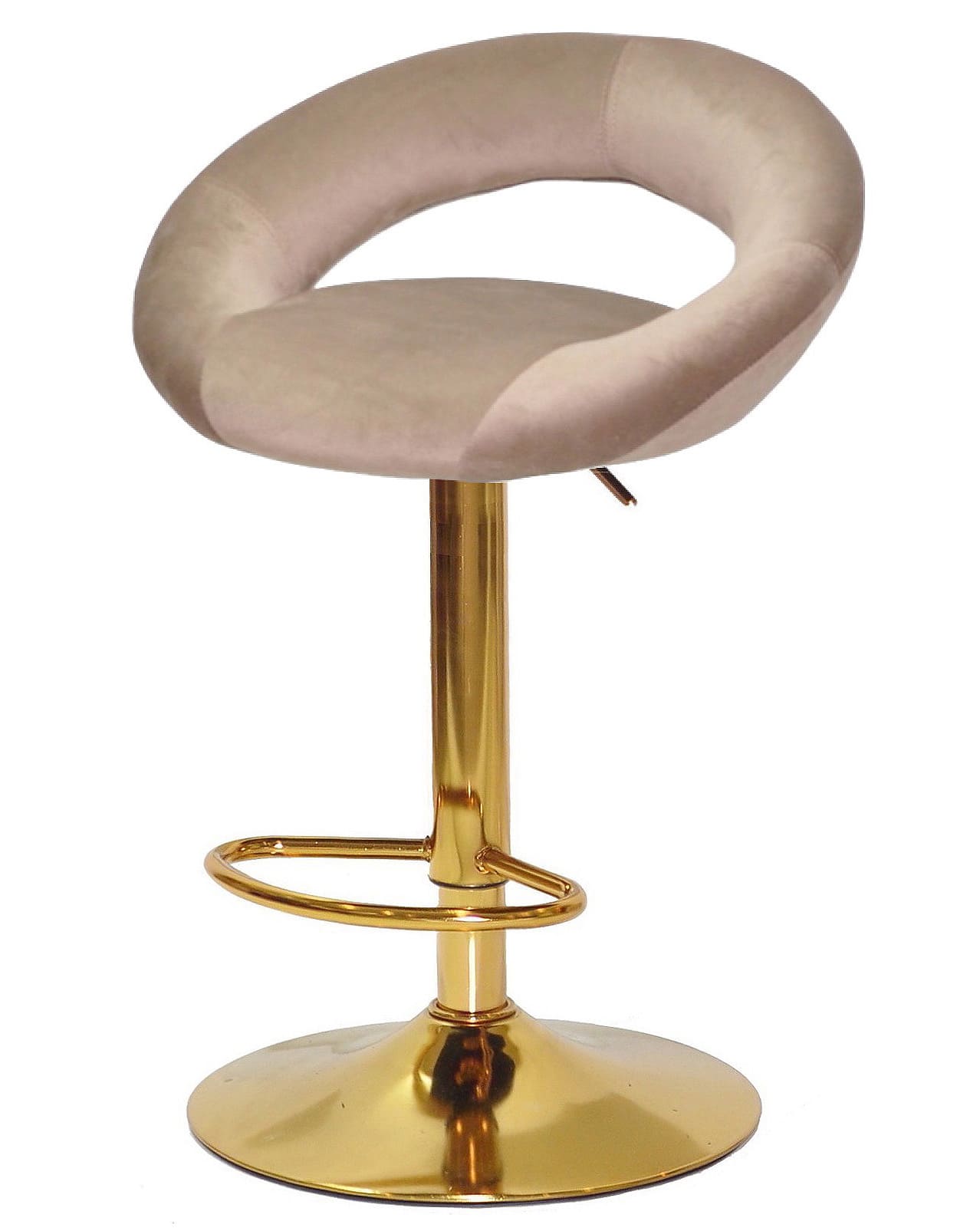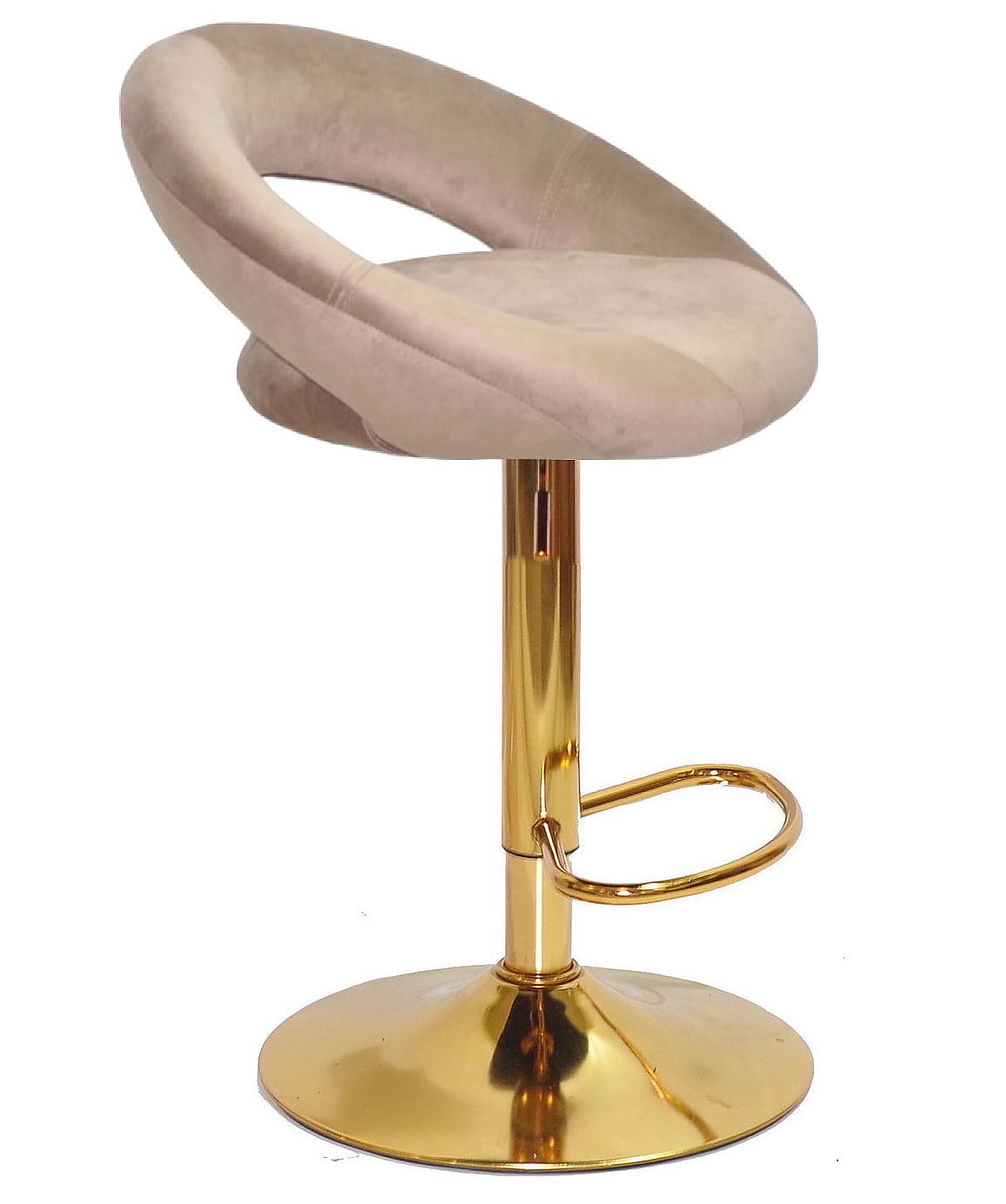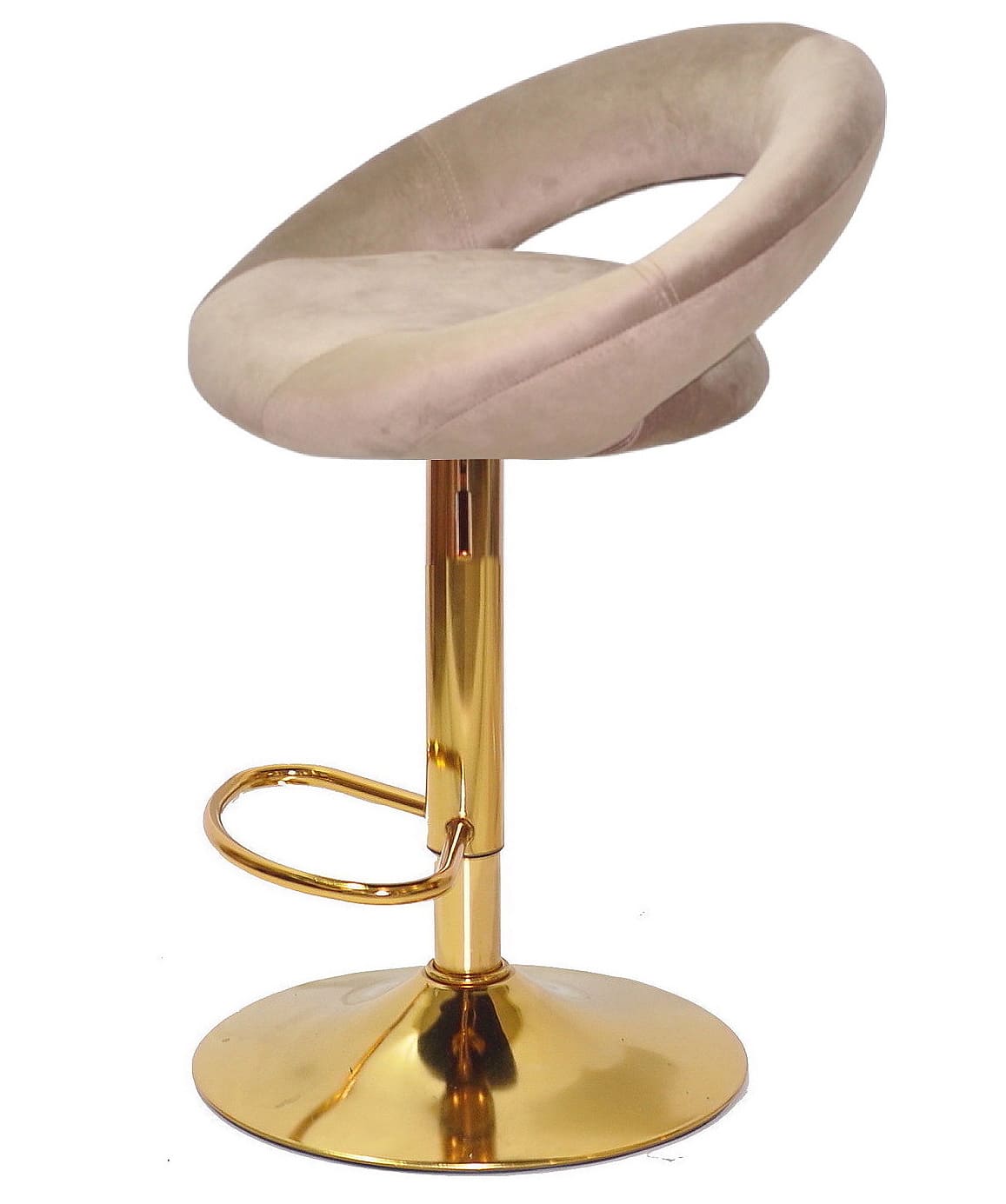 Цей барний стілець з регулюванням висоти оснащений поворотним сидінням, що обертається на 360°, забезпечуючи максимальний комфорт при використанні. Металева ніжка золотого кольору гарантує міцність та стійкість, а зручна підніжка робить посадку ще комфортнішою.