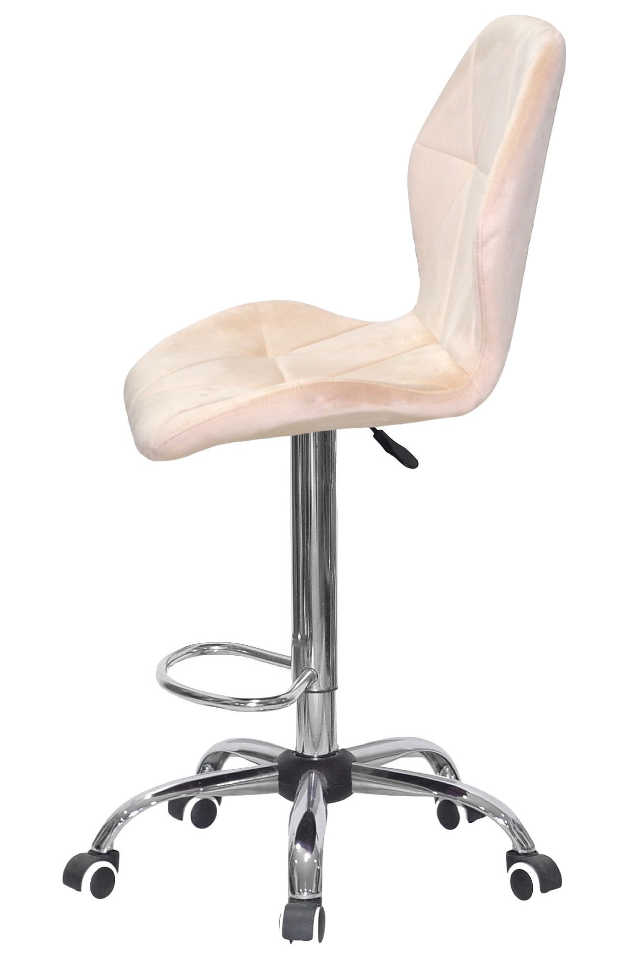Стильний і комфортний барний стілець на колесах для кухні, барної стійки, салону краси, студії або офісу. Оксамитова оббивка бежевого кольору, ергономічна спинка та поворотне сидіння 360° забезпечують зручність навіть при тривалому сидінні.