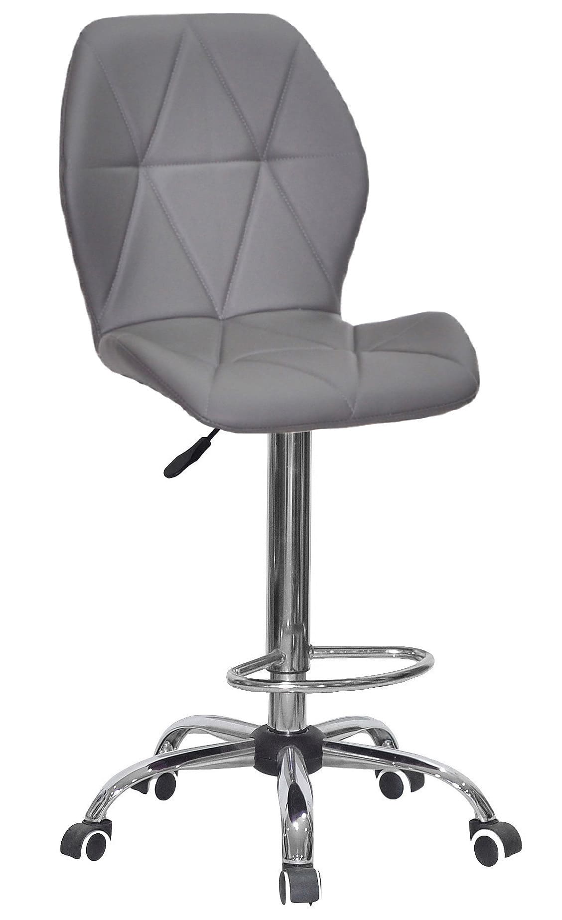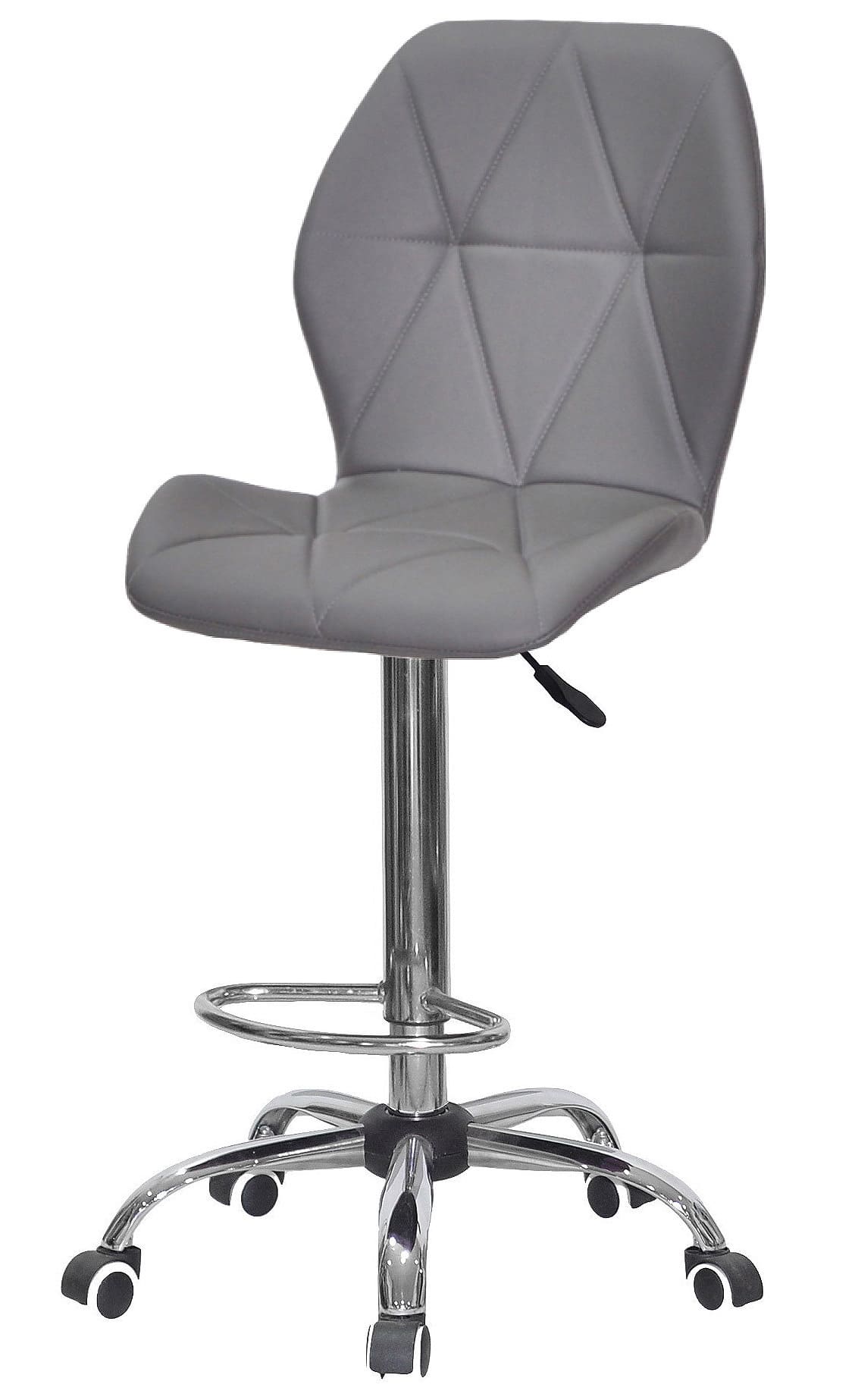 Стильний і комфортний барний стілець на колесах для кухні, барної стійки, салону краси, студії або офісу. Оббивка з екошкіри сірого кольору, ергономічна спинка та поворотне сидіння 360° забезпечують зручність навіть при тривалому сидінні.