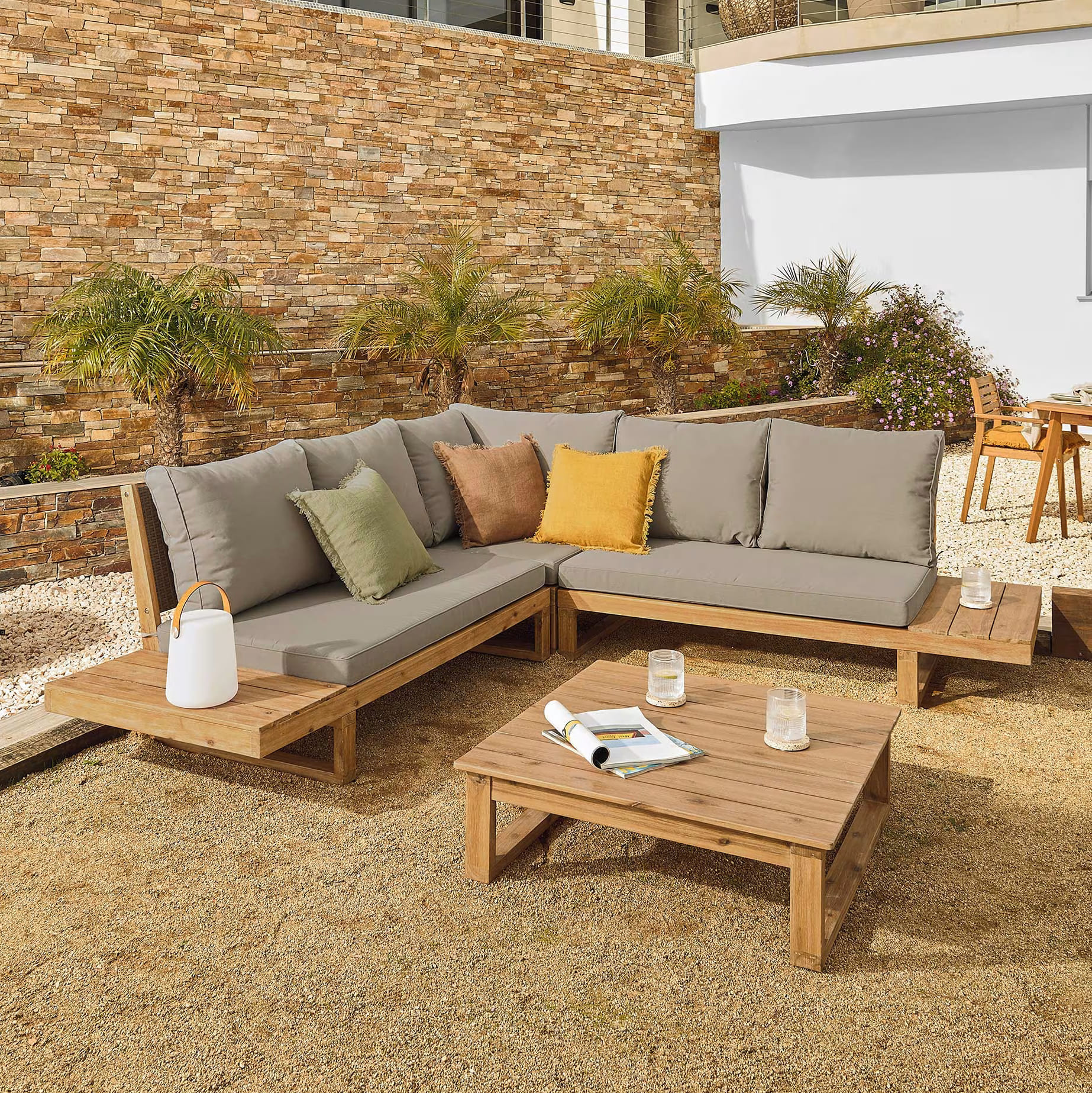 Садовий комплект меблів Kave Home Flaviina - це стильне рішення для тераси або саду, що включає кутовий 5-місний диван та стіл. Каркас виконаний з масиву акації FSC 100%, що гарантує міцність, довговічність та екологічність.
