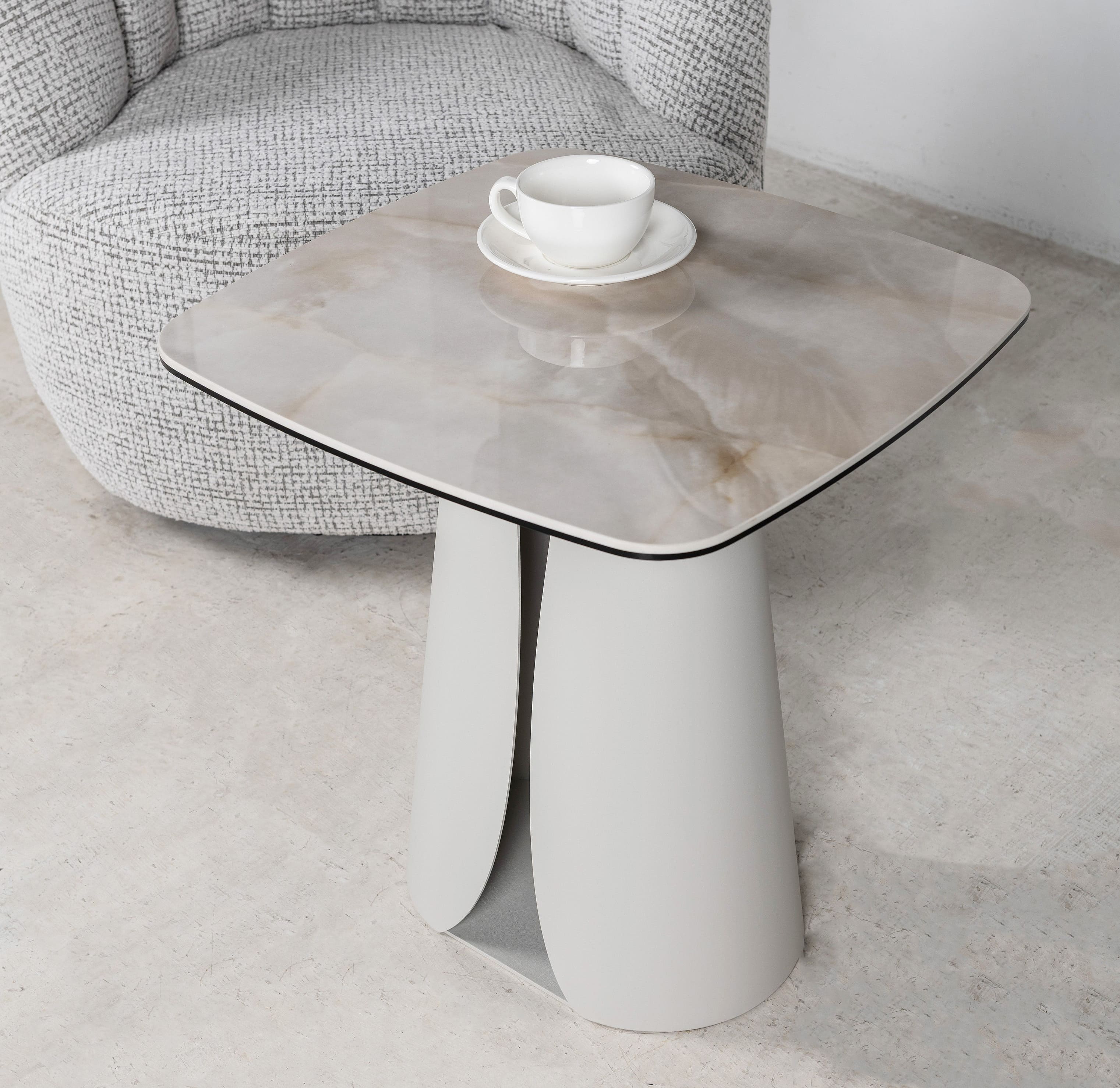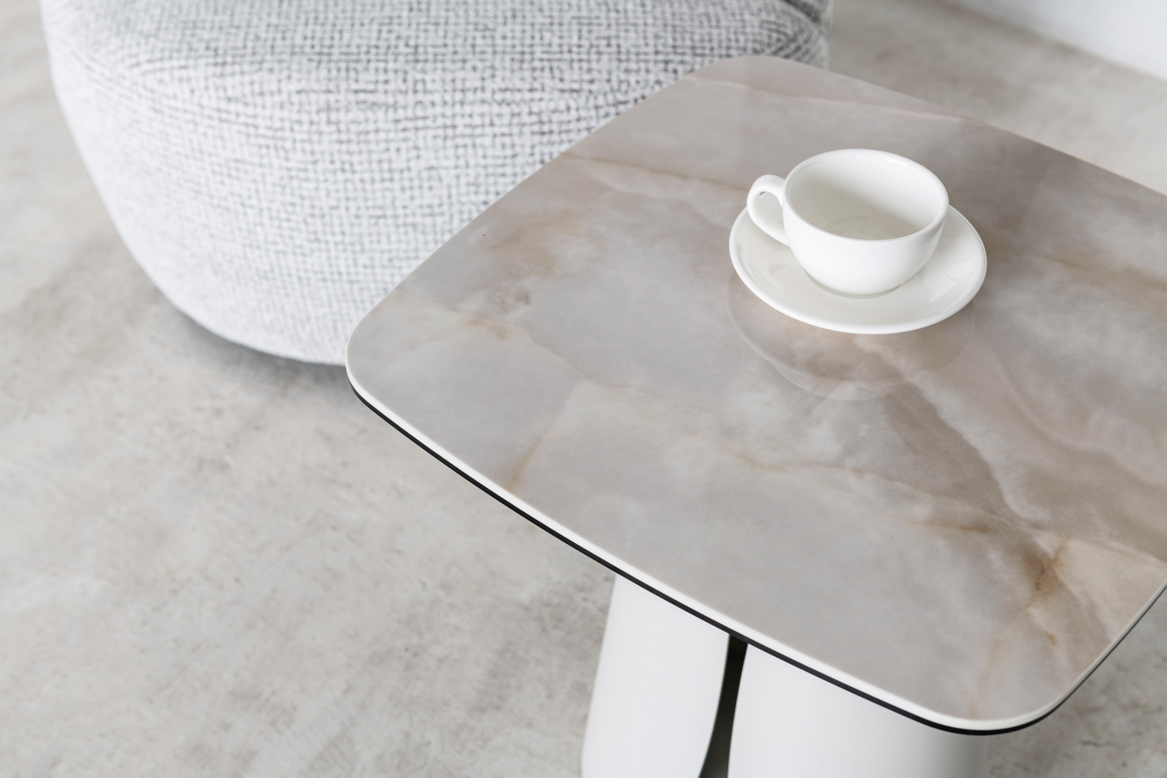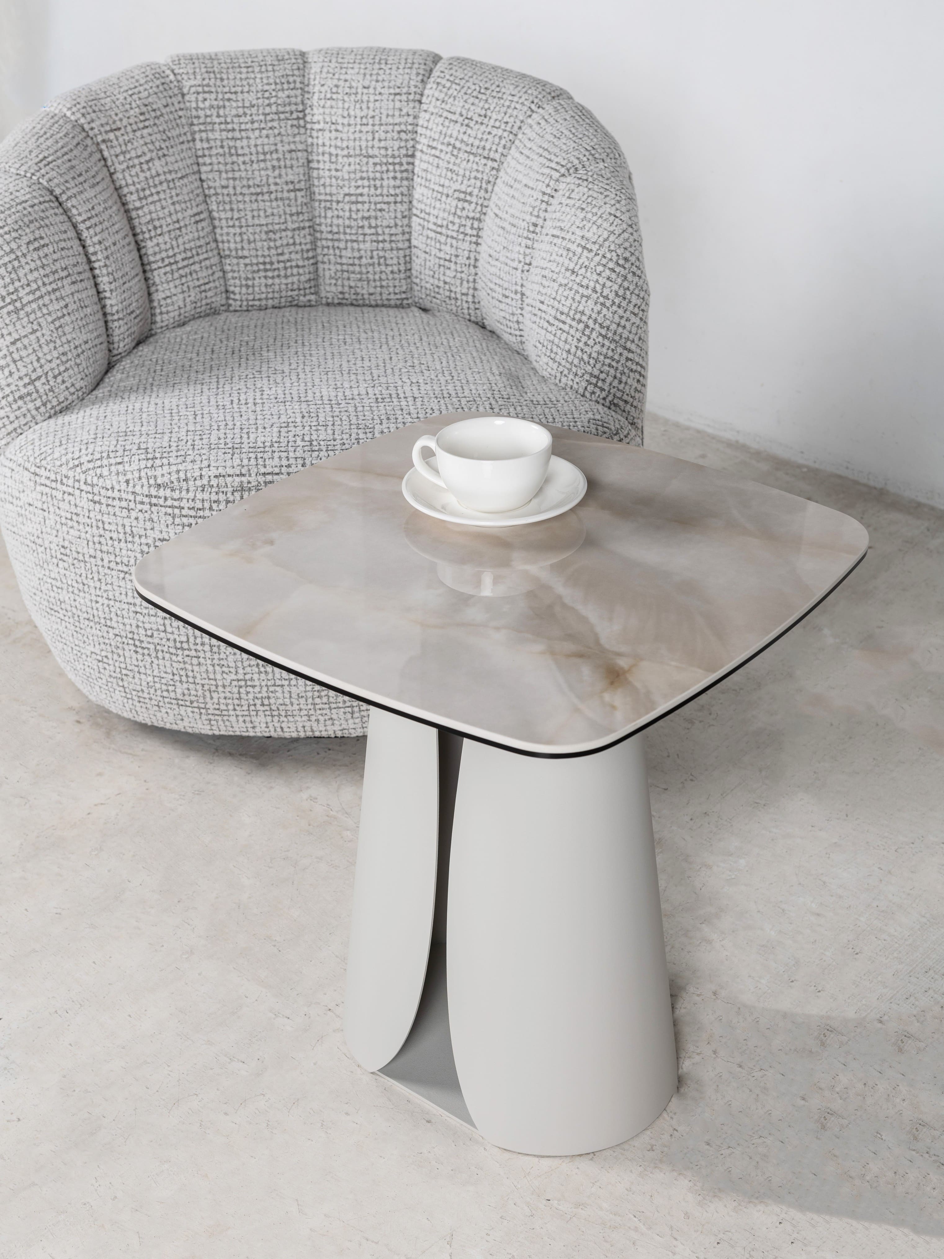 Кавовий стіл «Лунаріо» створений, щоб стати витонченим акцентом у вітальні чи зоні відпочинку. Його квадратна стільниця з глянцевої кераміки у відтінку айворі онікс зачаровує природним малюнком каменю та глибоким блиском поверхні.