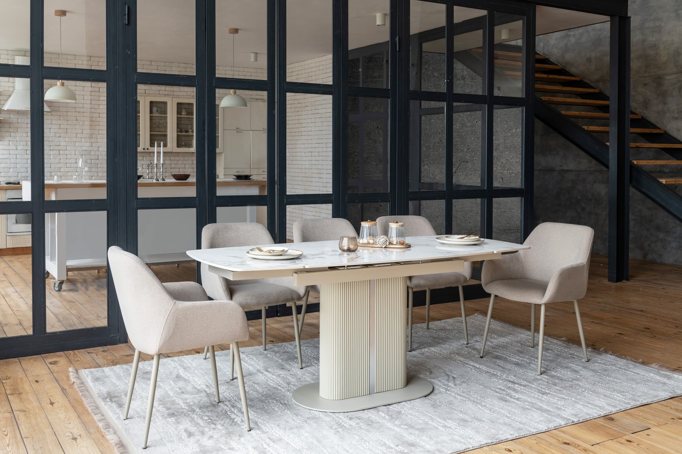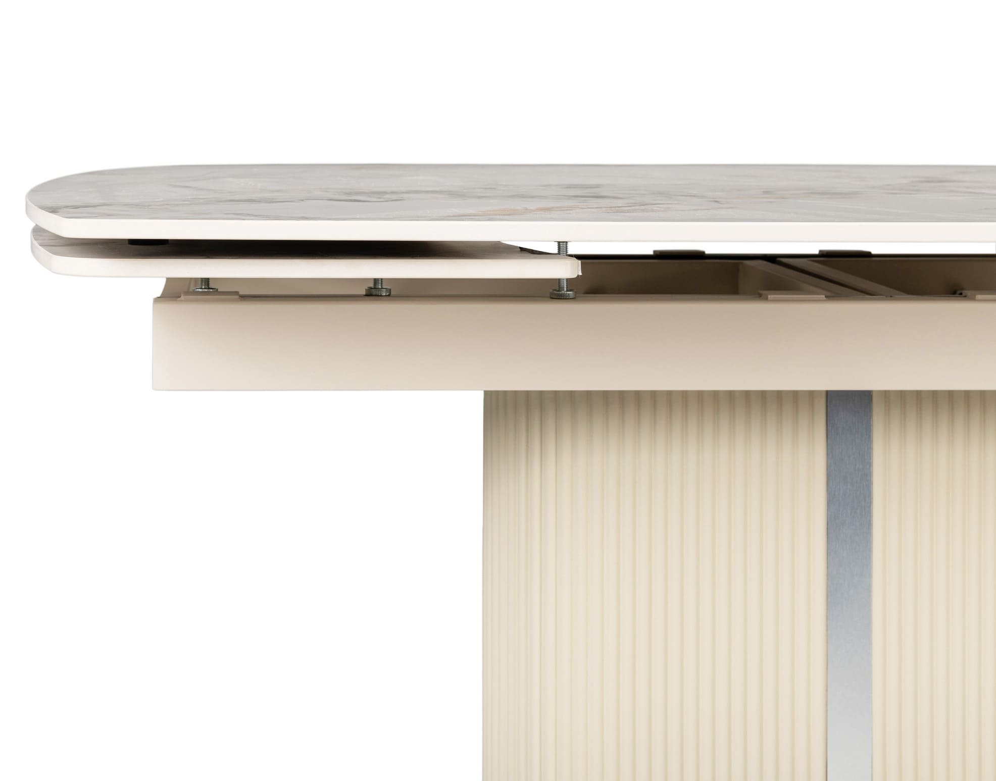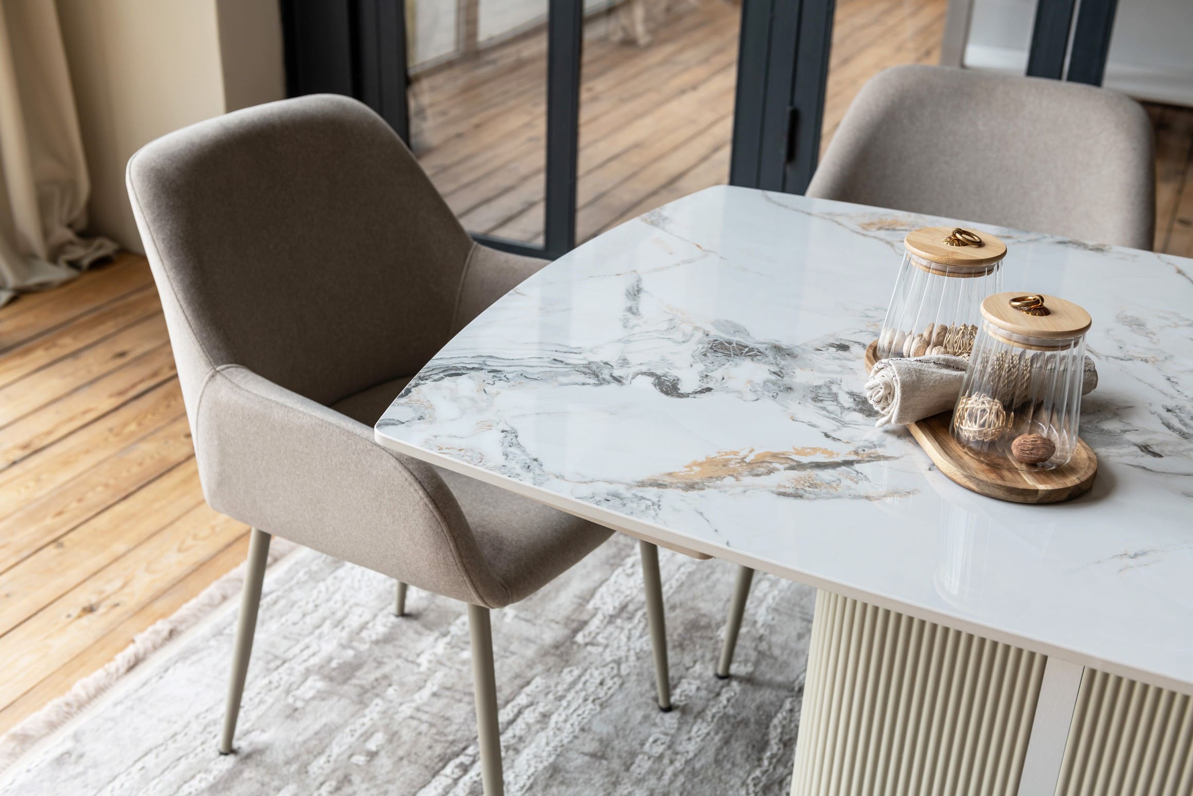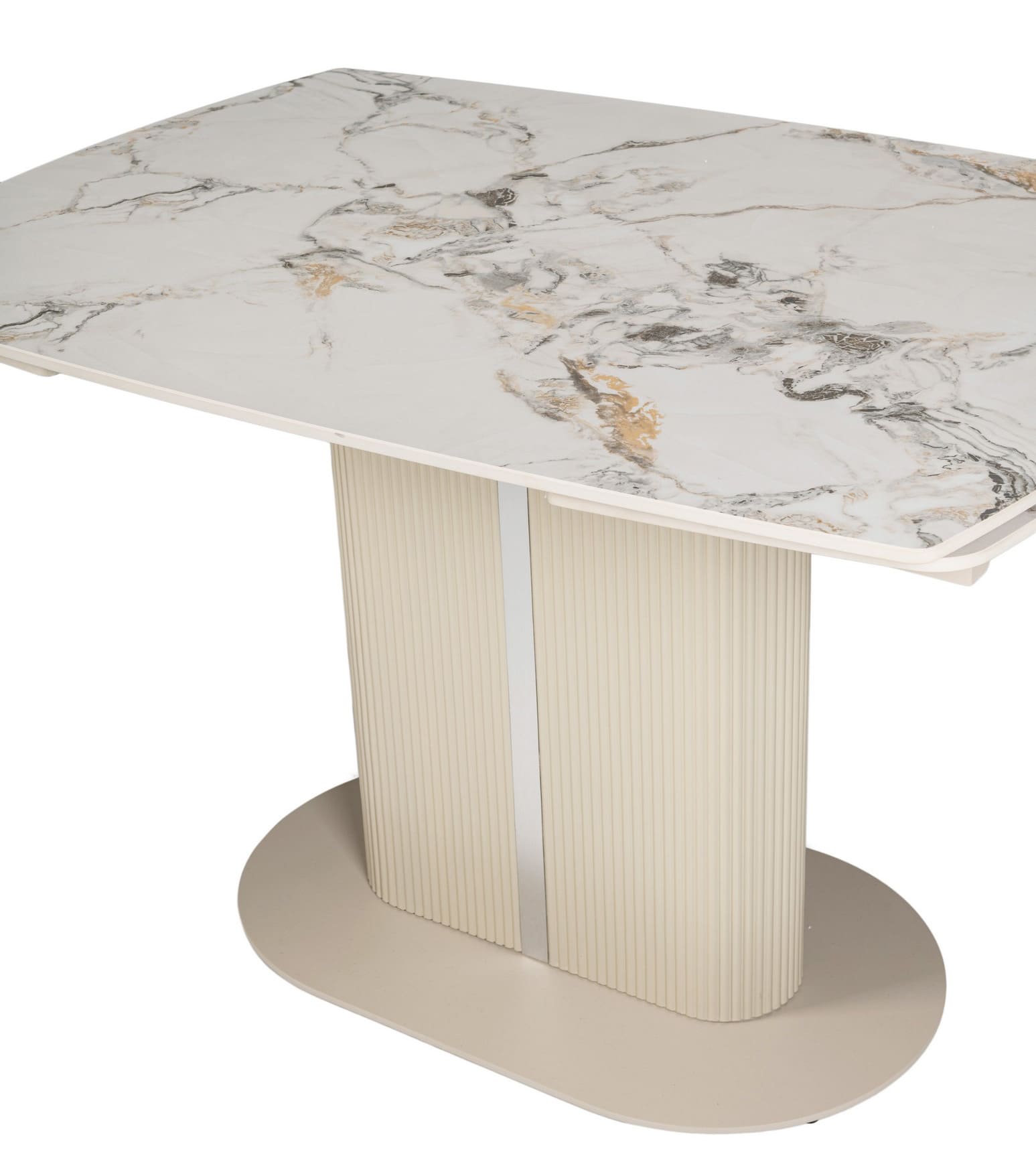 Основа поєднує пофарбований МДФ і метал у бежевому тоні, додаючи конструкції легкості та водночас надійності. Прямокутна форма та збалансовані пропорції дозволяють столу гармонійно вписатися в сучасний мінімалізм, скандинавський стиль чи більш класичний інтер’єр, роблячи його центральним елементом кімнати.
