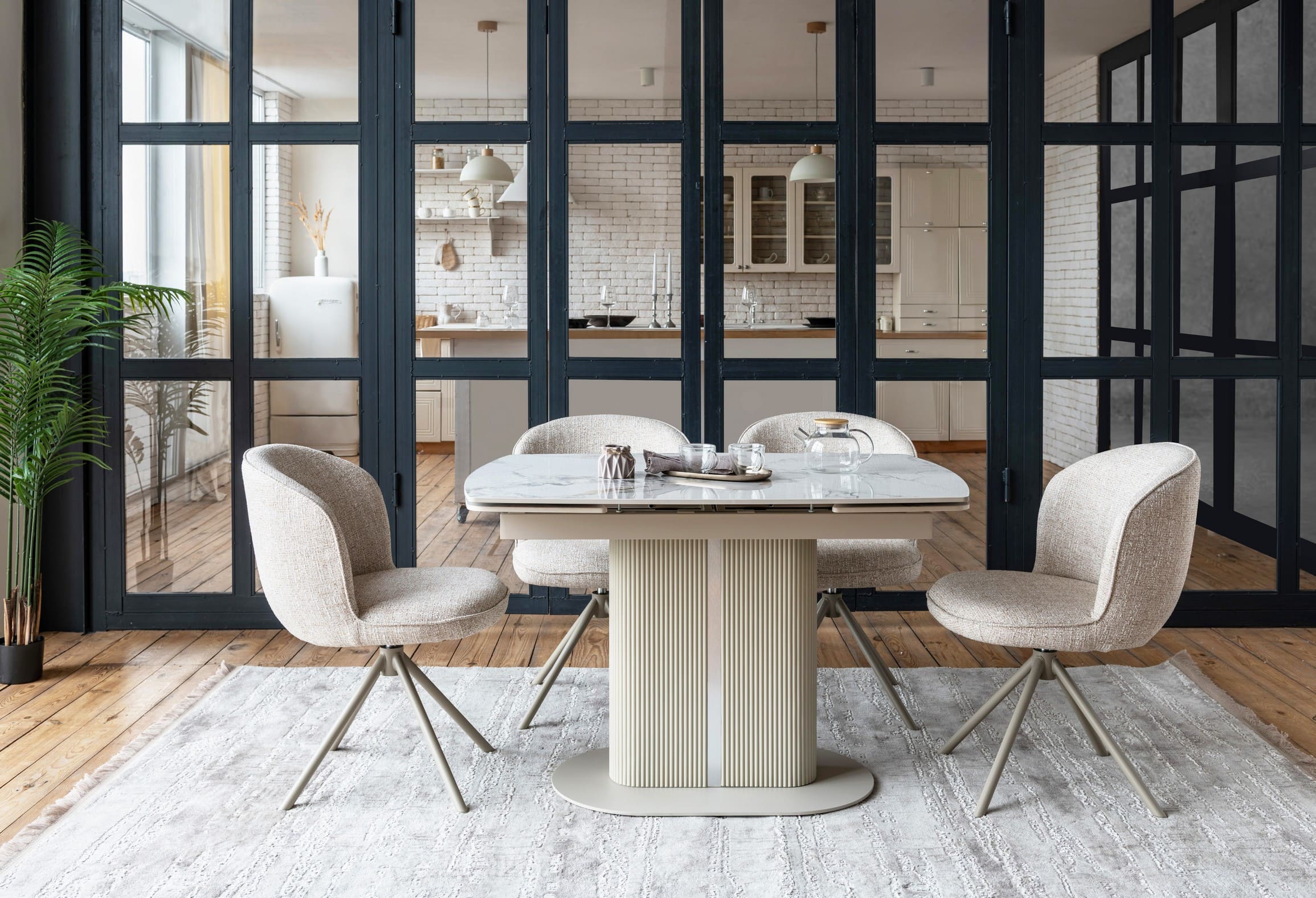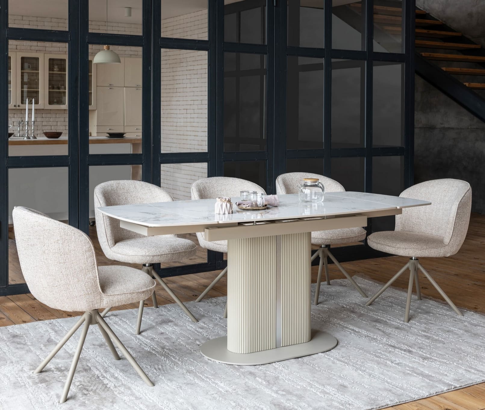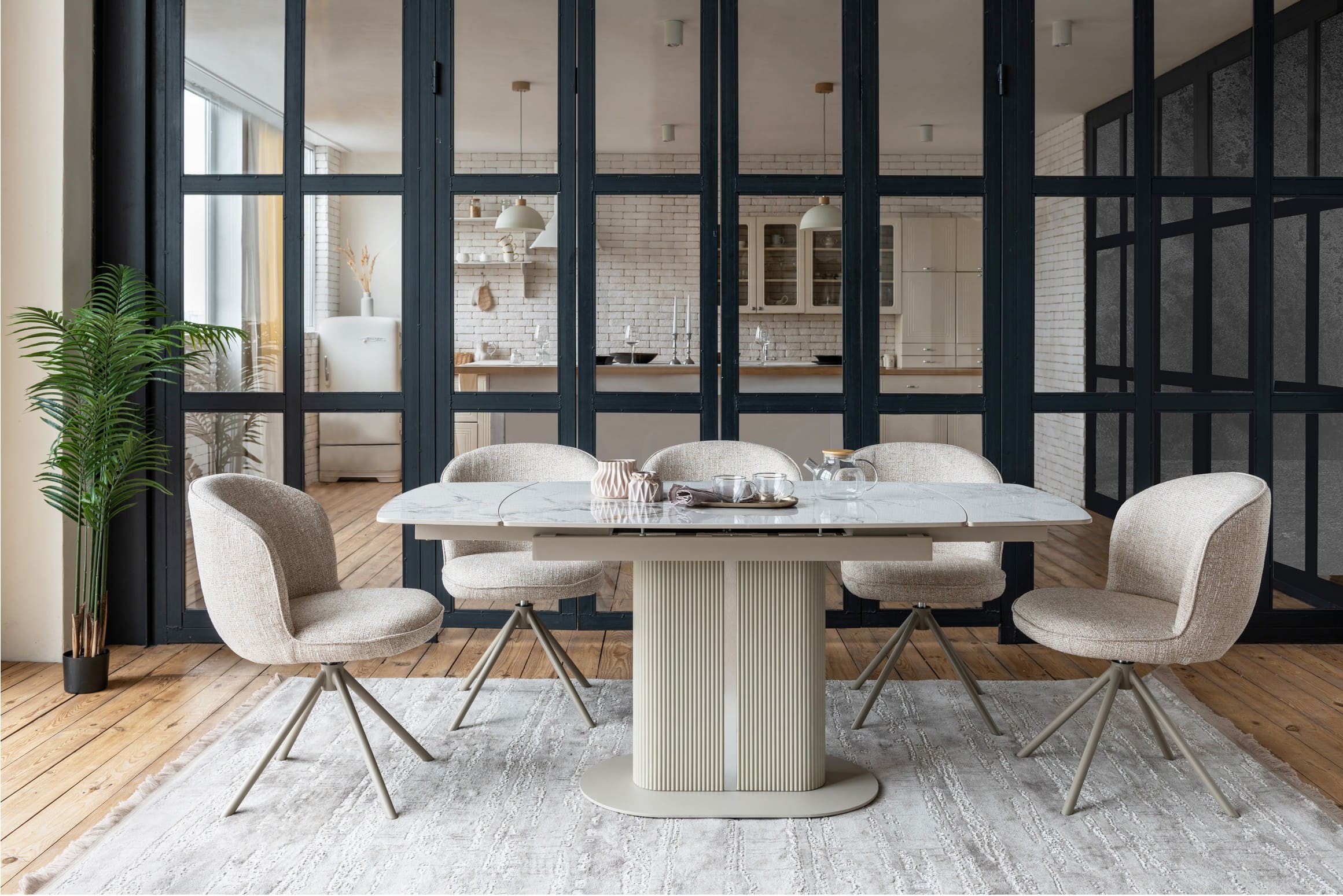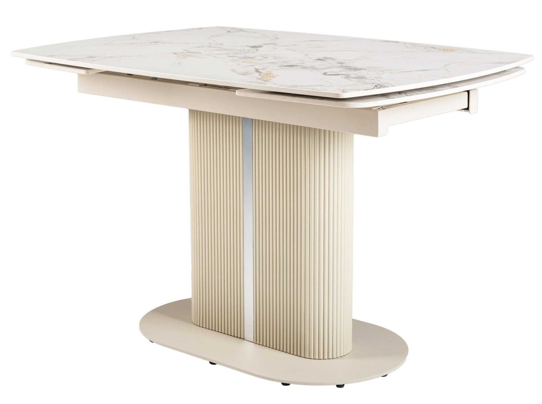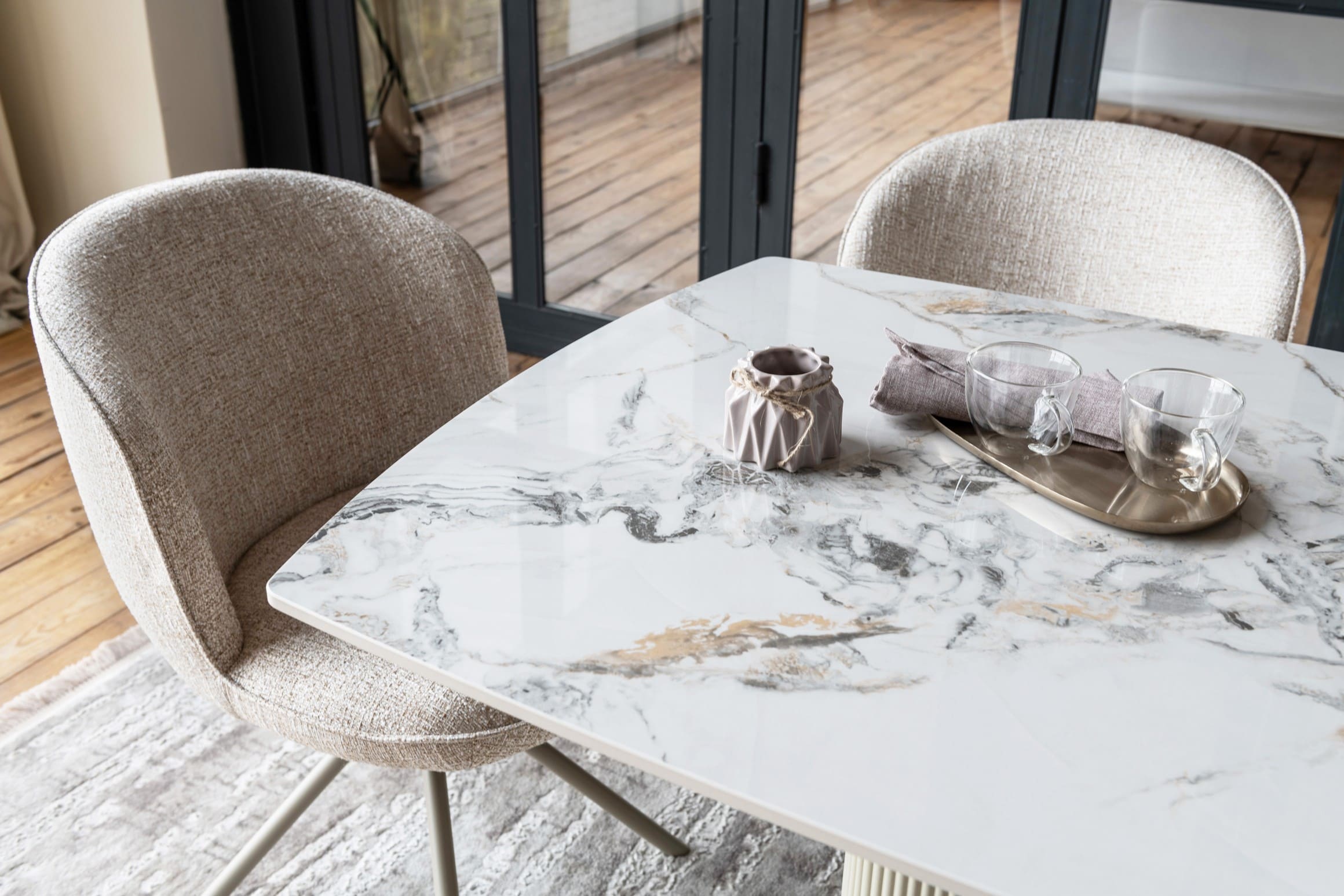 Основа поєднує пофарбований МДФ і метал у бежевому тоні, додаючи конструкції легкості та водночас надійності. Прямокутна форма та збалансовані пропорції дозволяють столу гармонійно вписатися в сучасний мінімалізм, скандинавський стиль чи більш класичний інтер’єр, роблячи його центральним елементом кімнати.