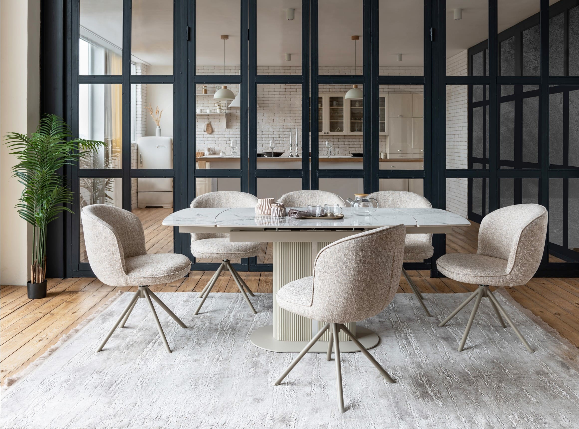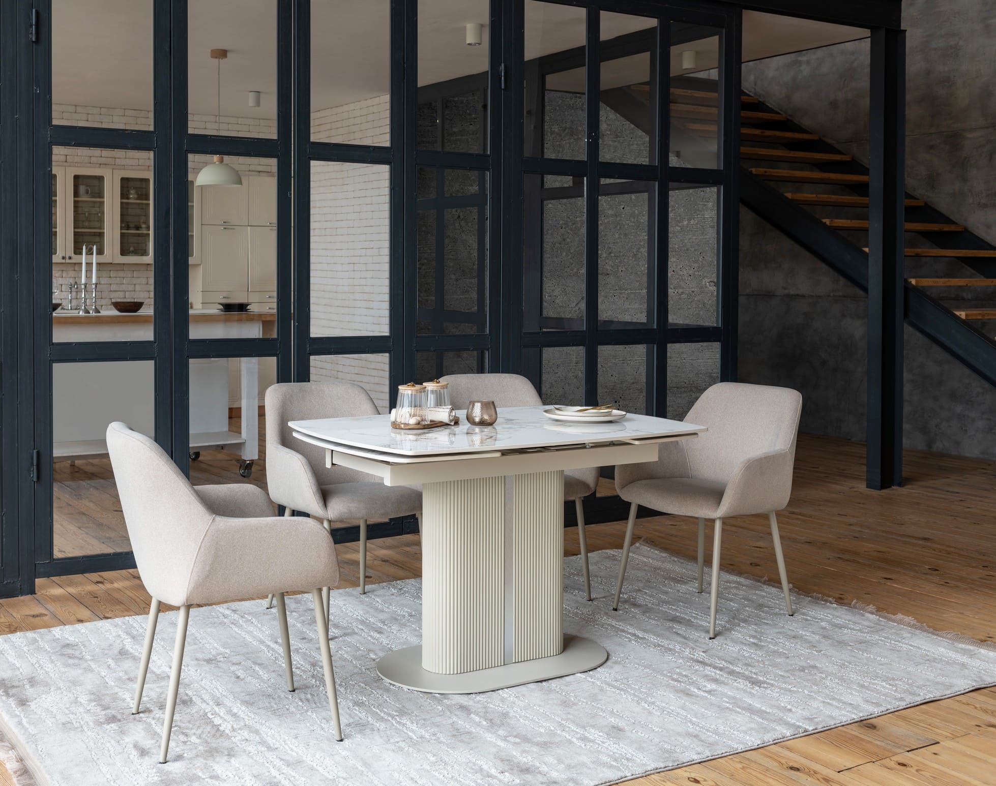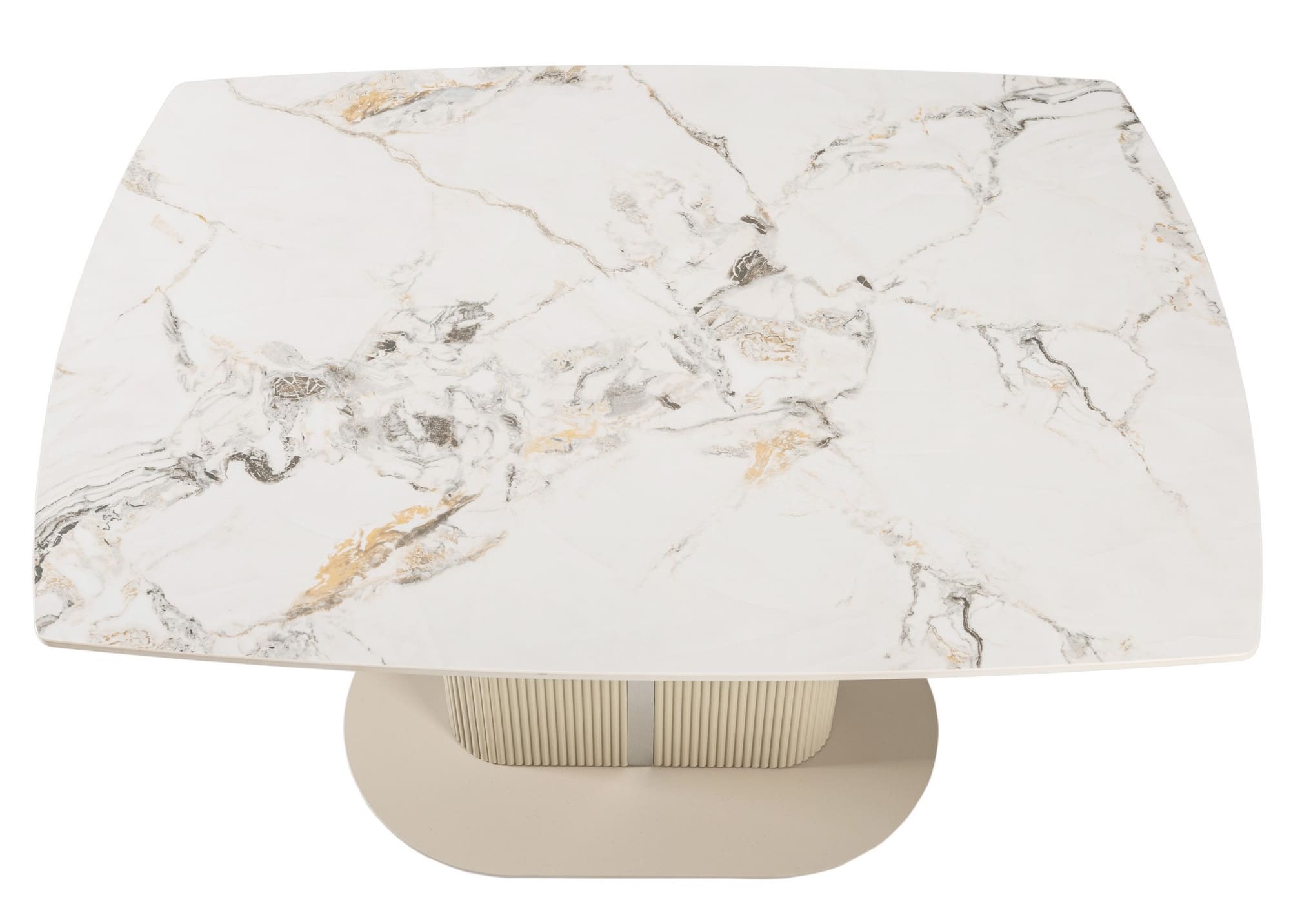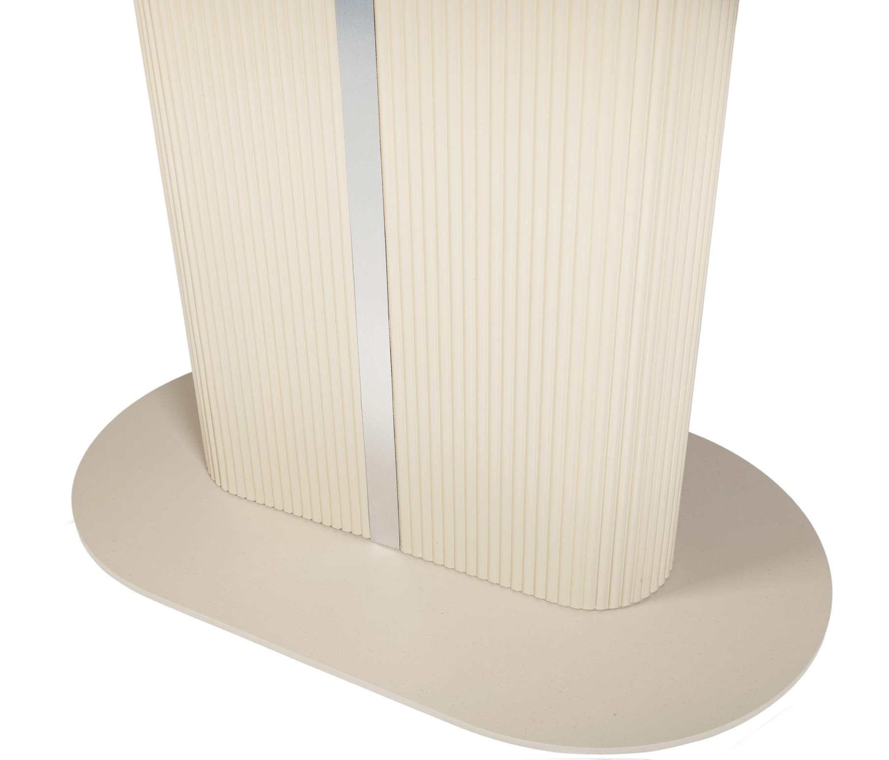 Основа поєднує пофарбований МДФ і метал у бежевому тоні, додаючи конструкції легкості та водночас надійності. Прямокутна форма та збалансовані пропорції дозволяють столу гармонійно вписатися в сучасний мінімалізм, скандинавський стиль чи більш класичний інтер’єр, роблячи його центральним елементом кімнати.