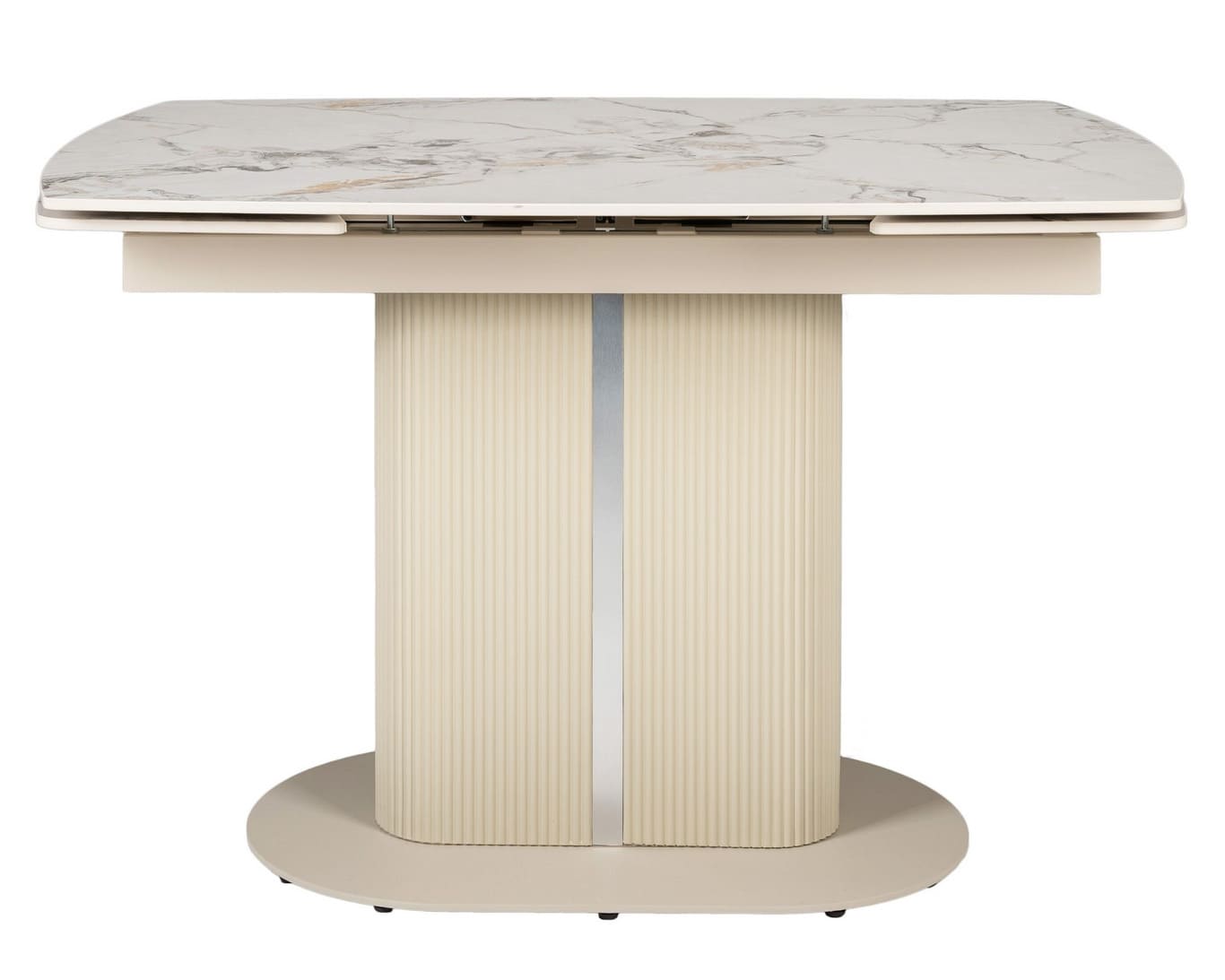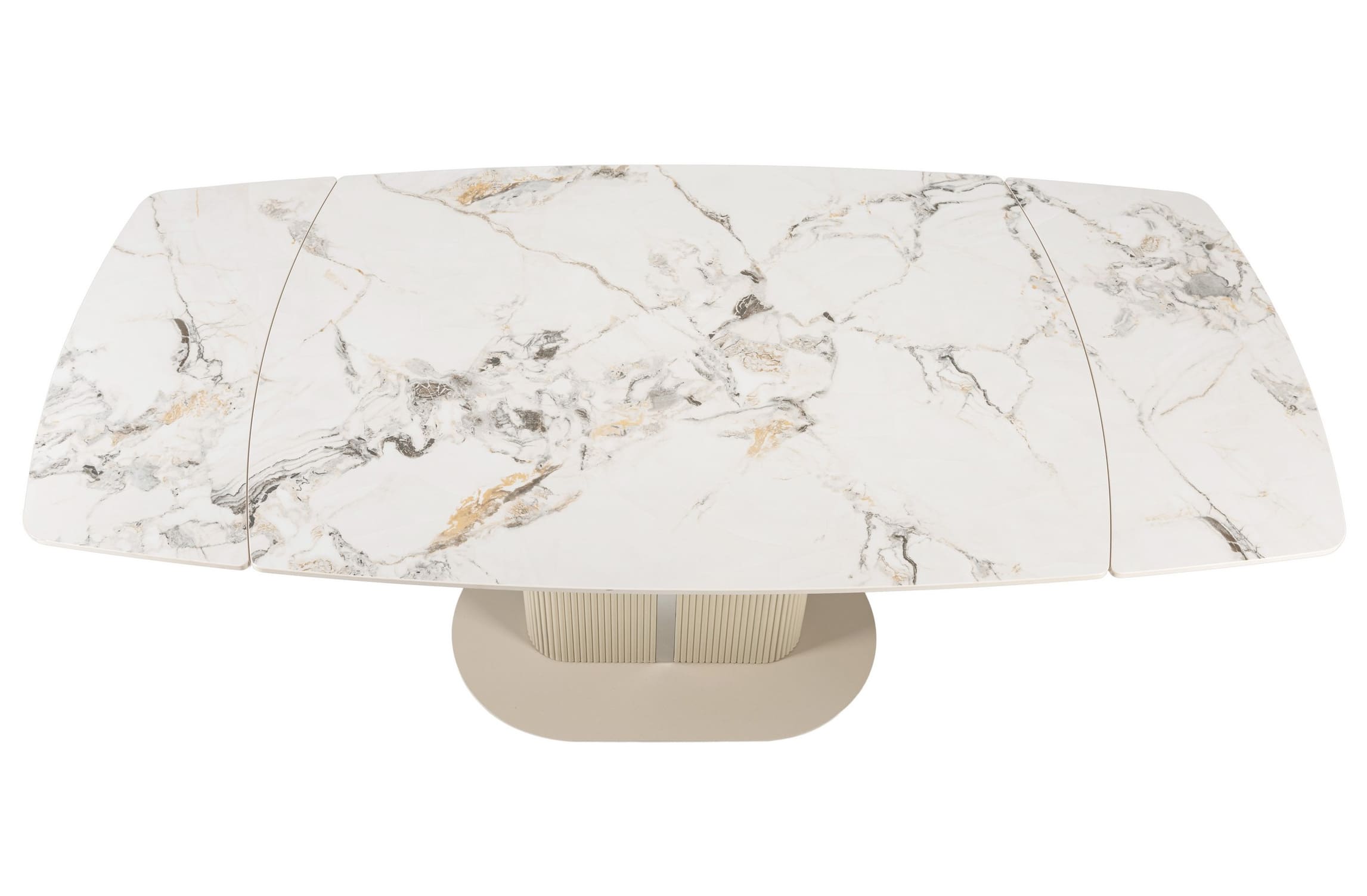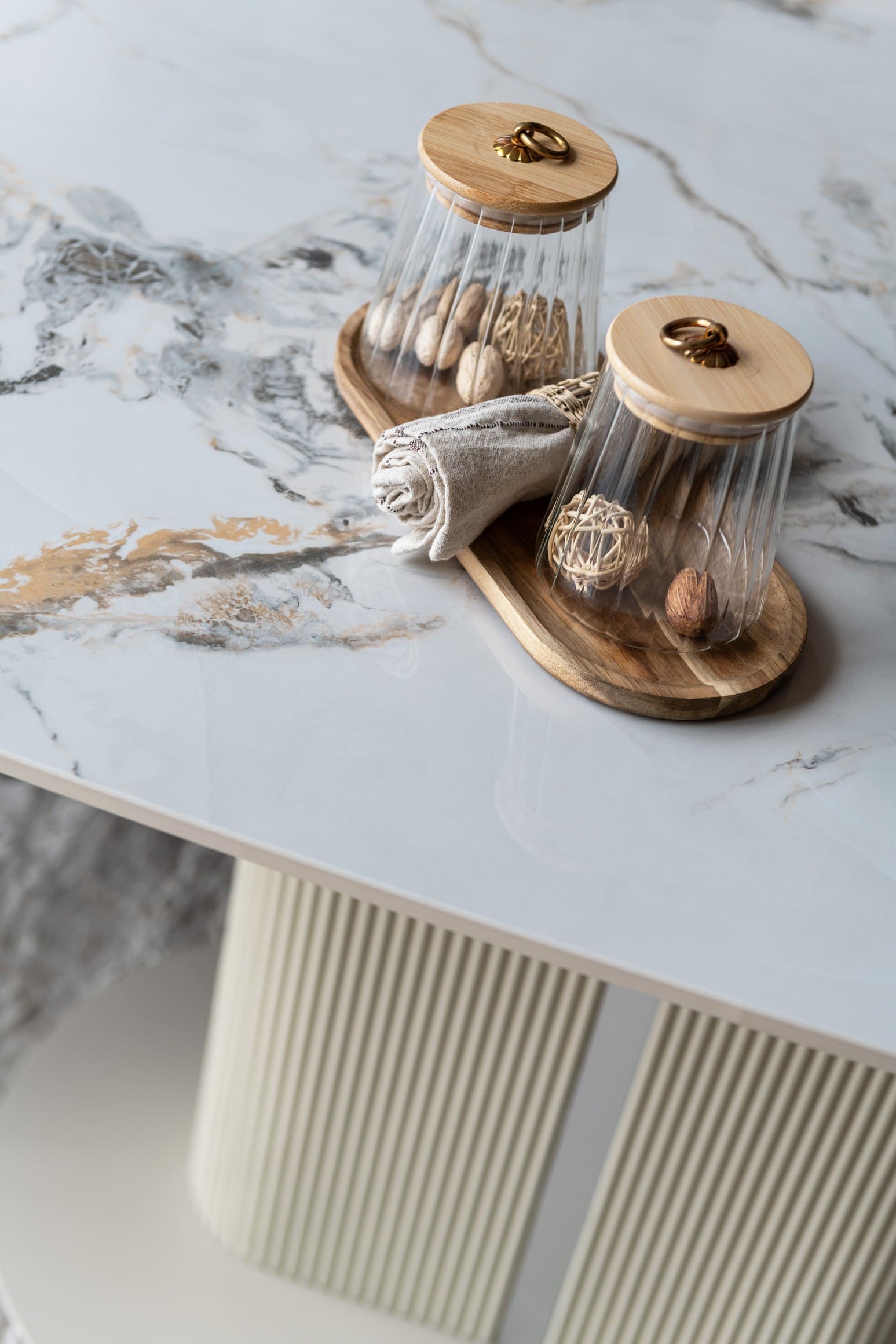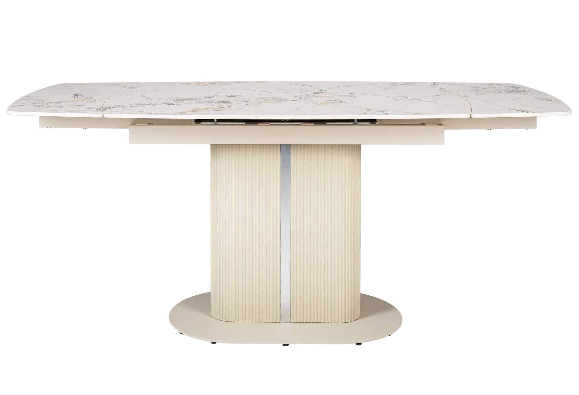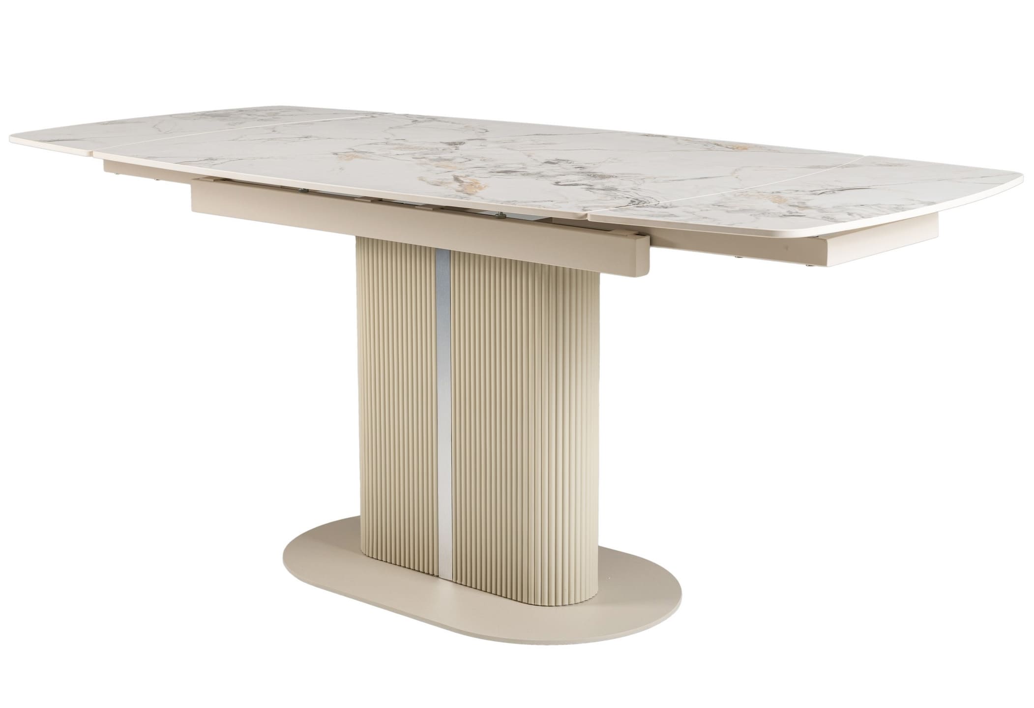 Основа поєднує пофарбований МДФ і метал у бежевому тоні, додаючи конструкції легкості та водночас надійності. Прямокутна форма та збалансовані пропорції дозволяють столу гармонійно вписатися в сучасний мінімалізм, скандинавський стиль чи більш класичний інтер’єр, роблячи його центральним елементом кімнати.