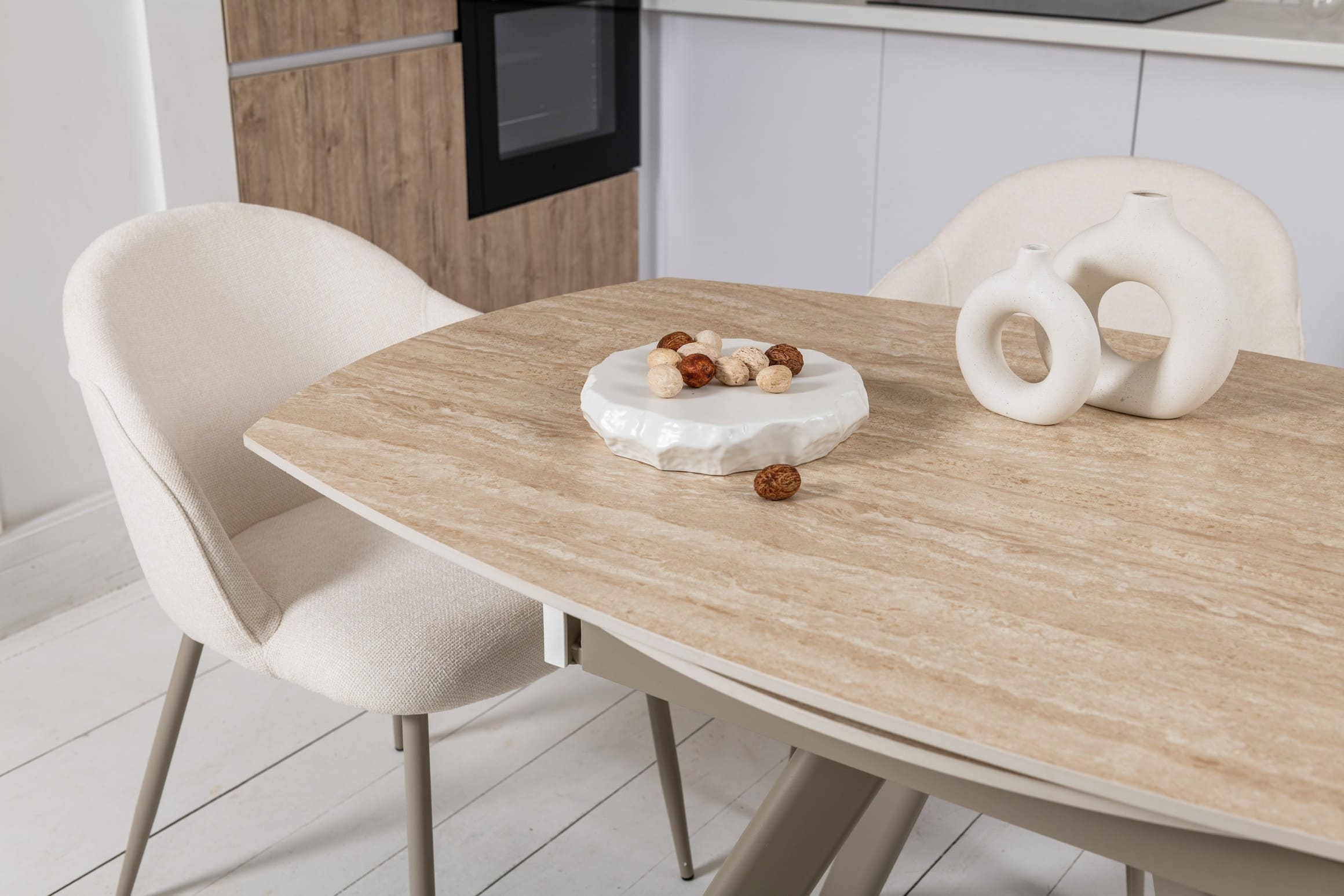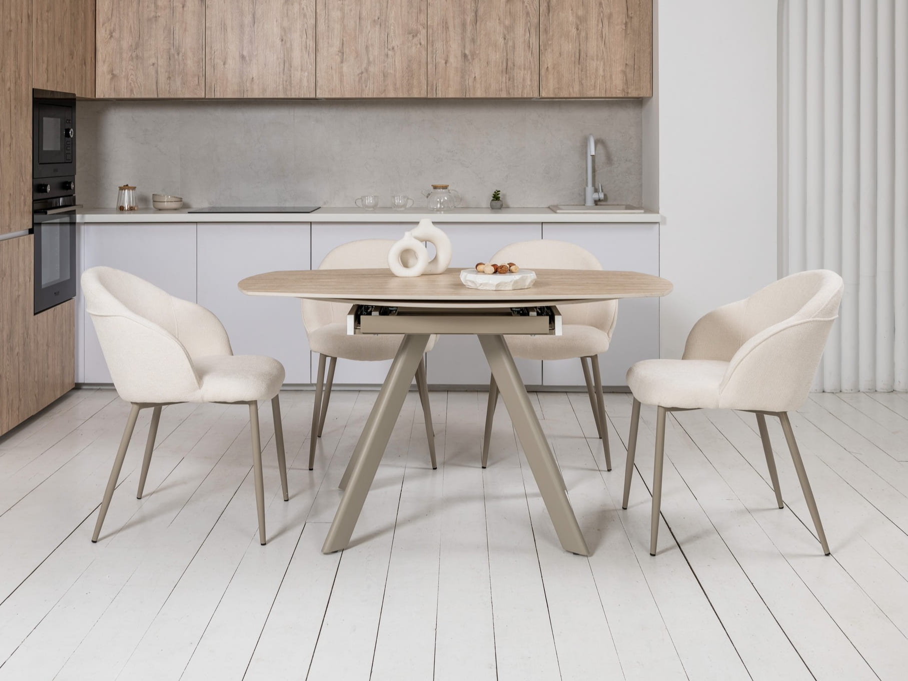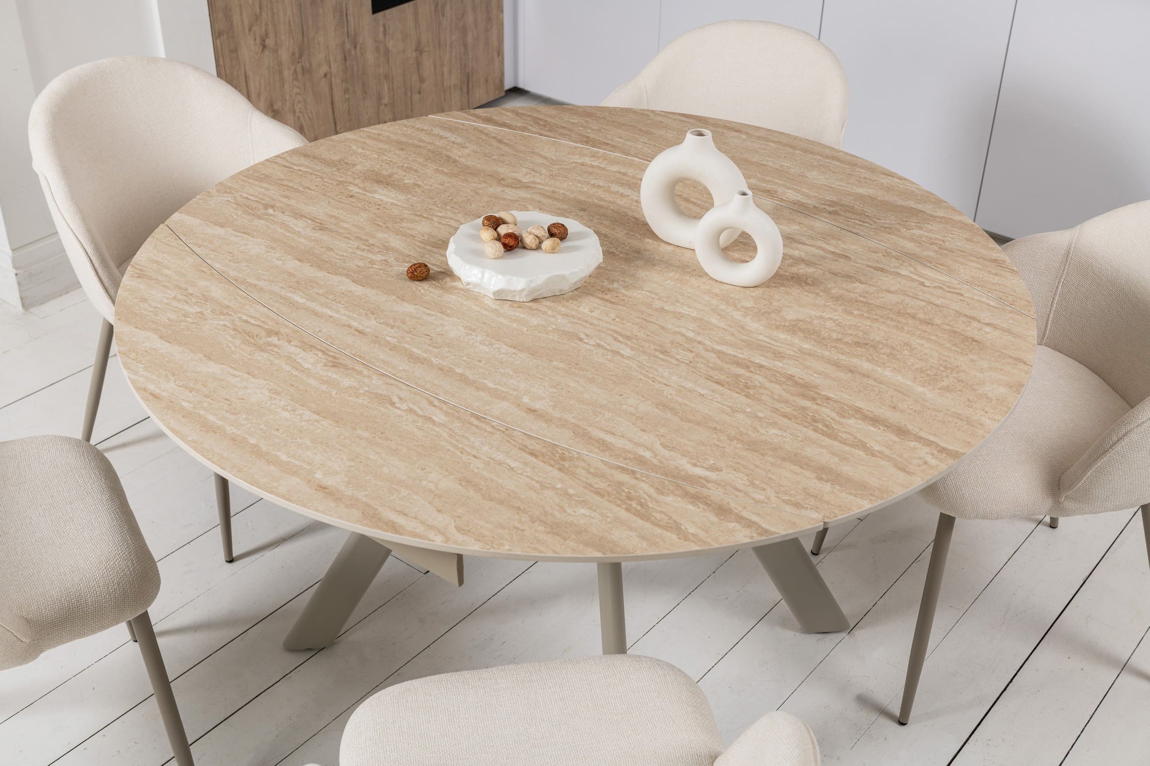 Стільниця з матової кераміки в трендовому відтінку римський травертін додає інтер’єру розкоші та благородства, а фарбована металева основа кольору капучино забезпечує надійність і стійкість конструкції.