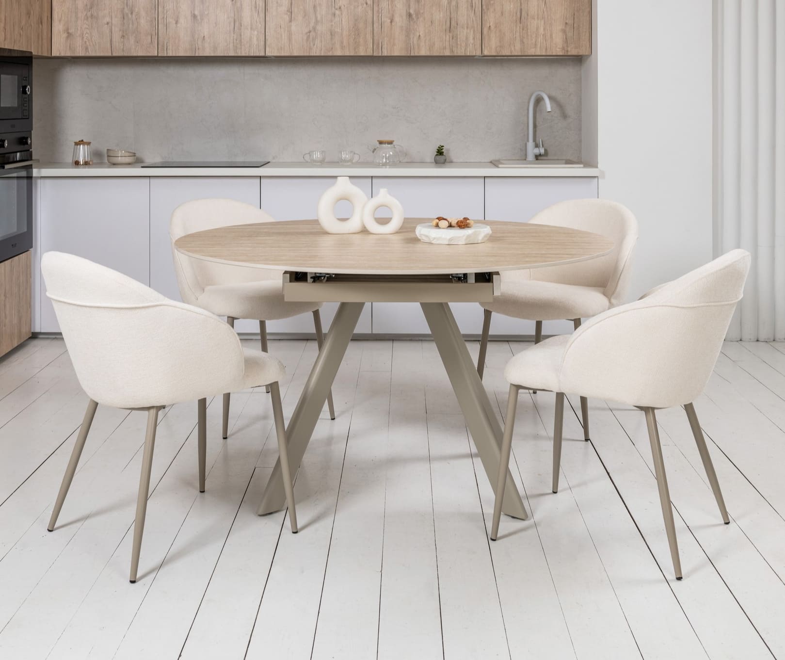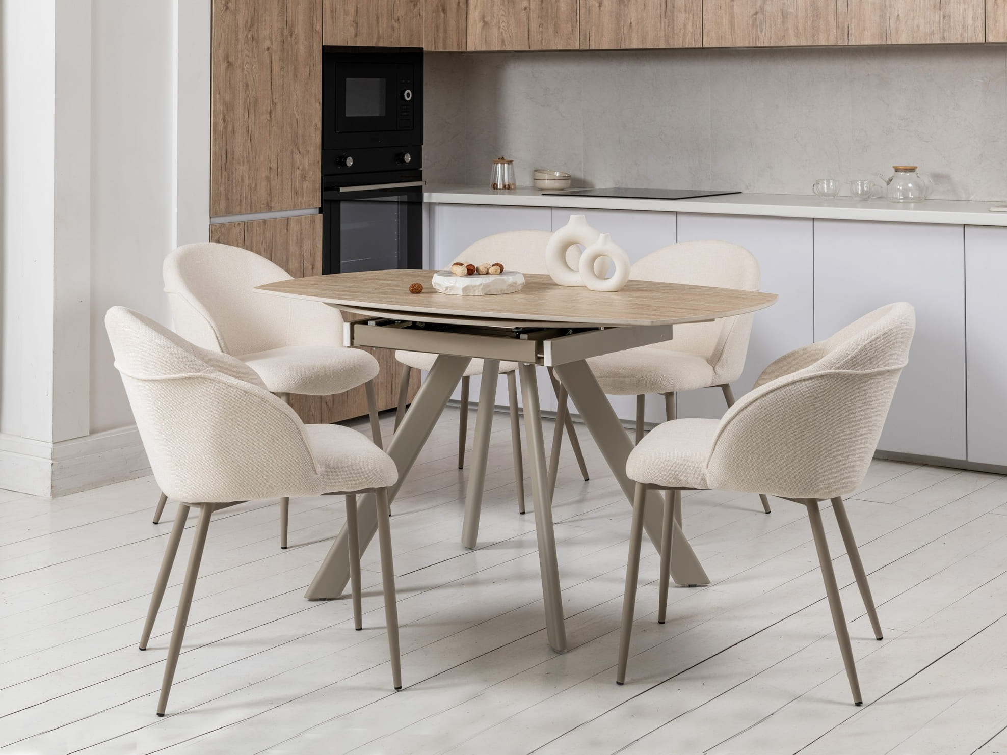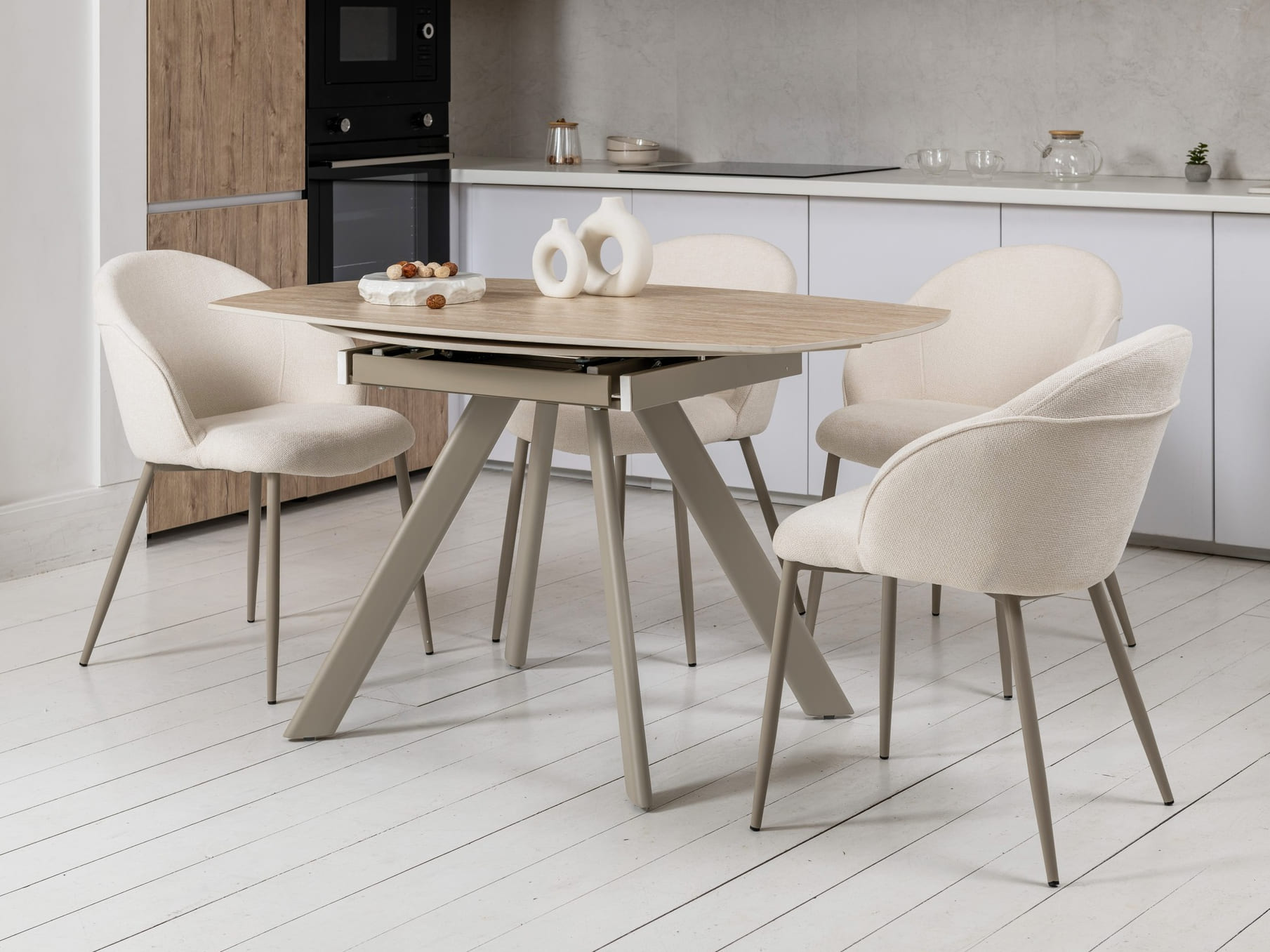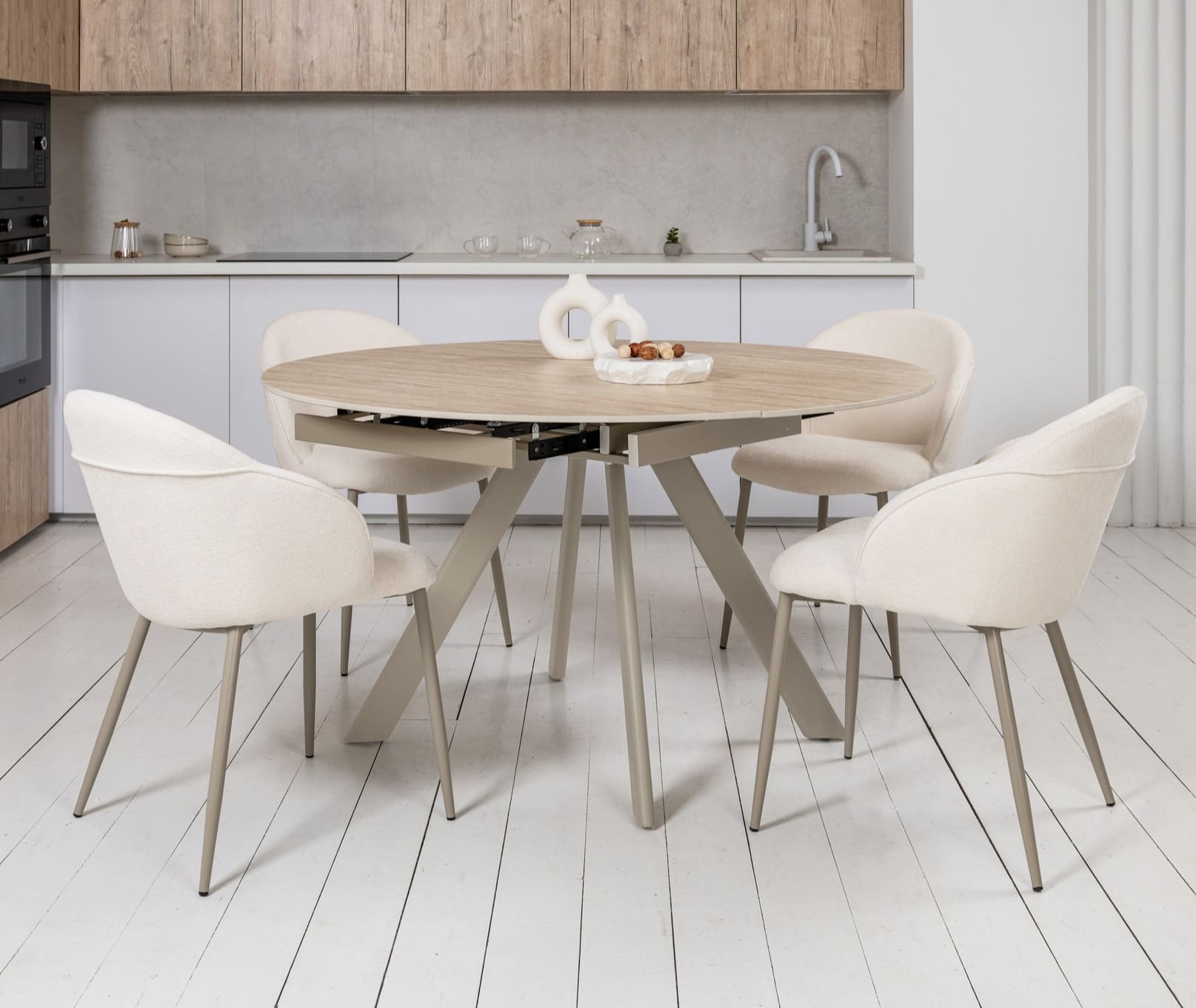 Стільниця з матової кераміки в трендовому відтінку римський травертін додає інтер’єру розкоші та благородства, а фарбована металева основа кольору капучино забезпечує надійність і стійкість конструкції.