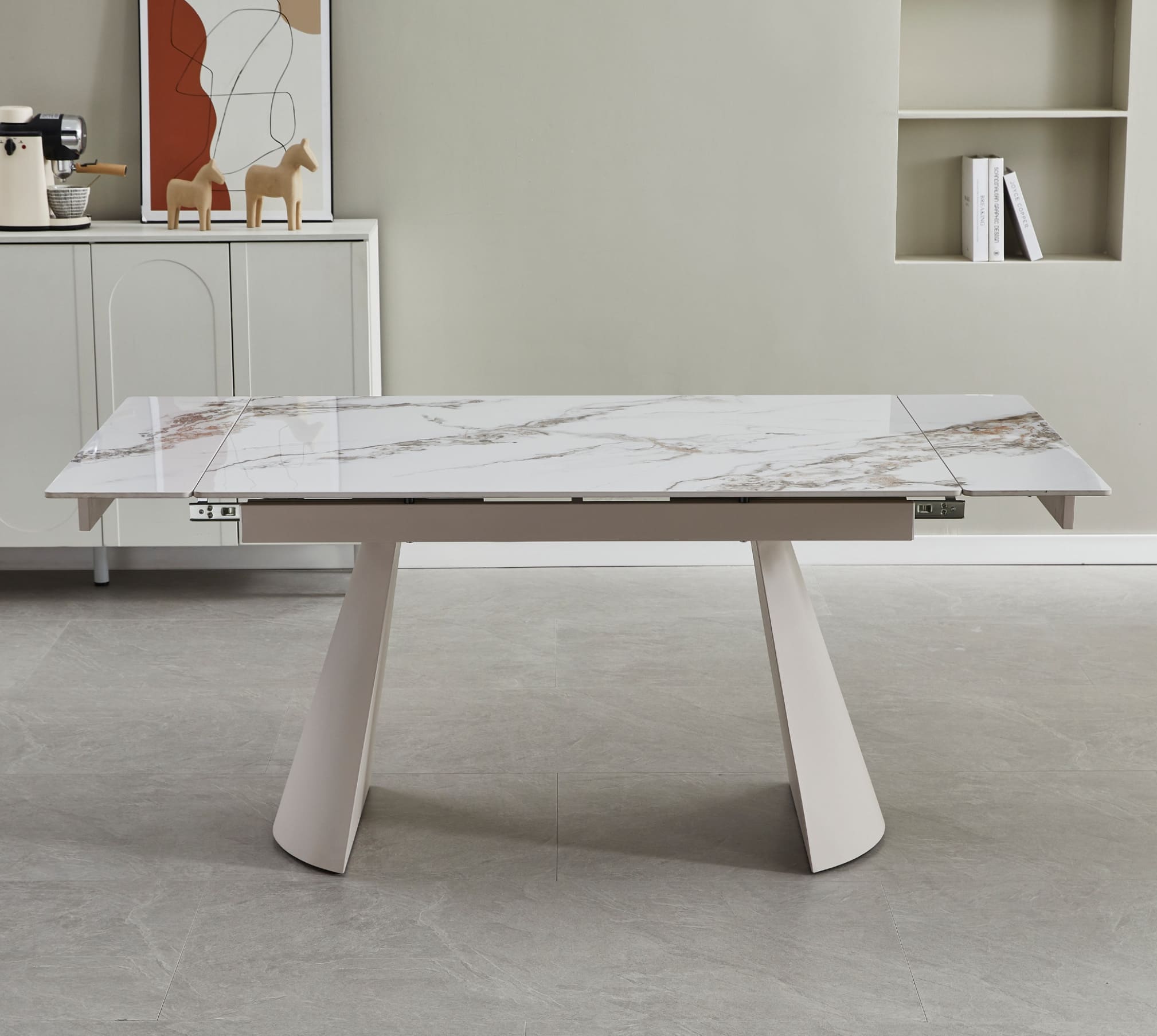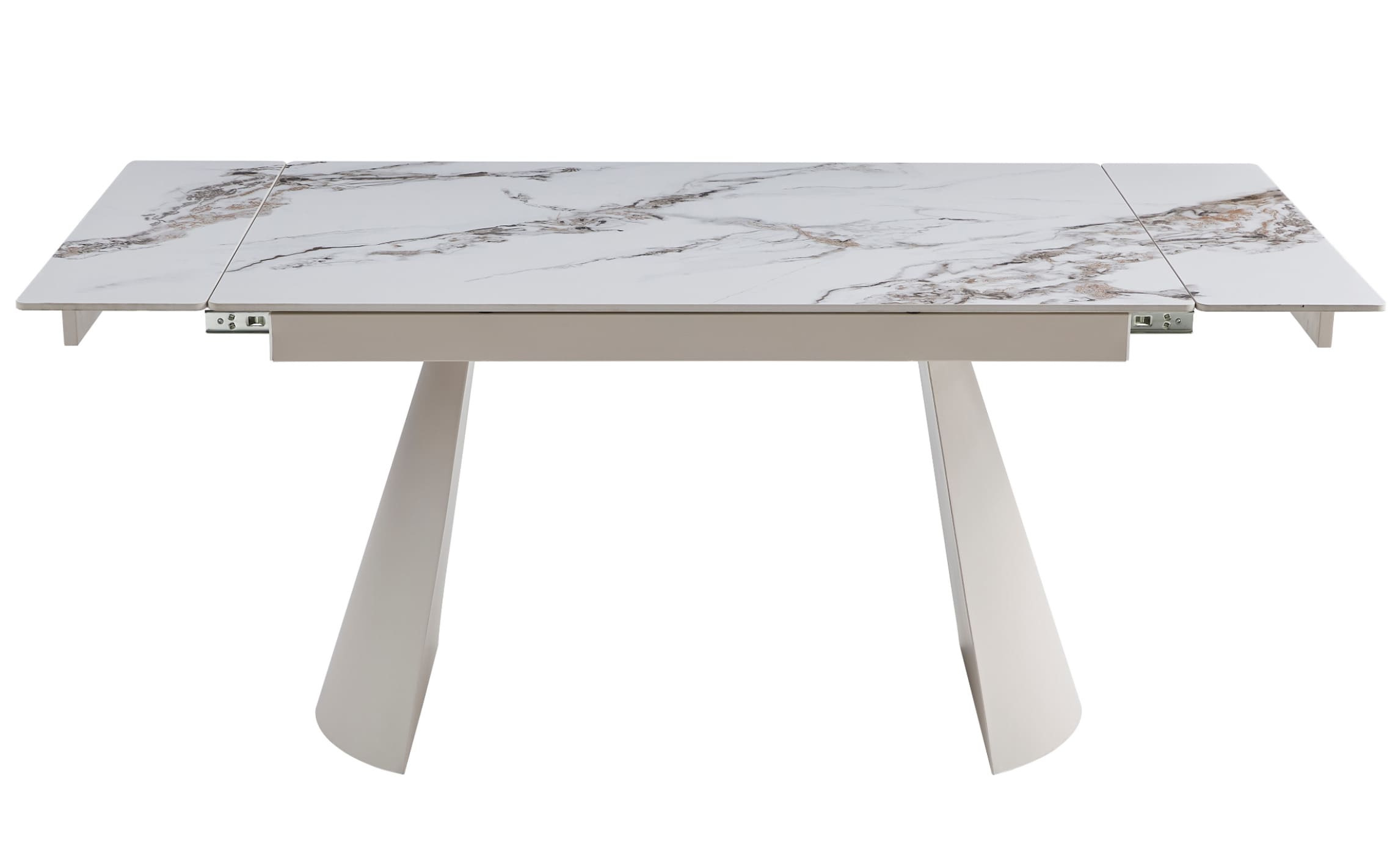 Металева основа в кольорі капучино додає конструкції надійності та візуального балансу. Завдяки продуманому боковому механізму стіл легко збільшується з 130 до 180 см, перетворюючись на простору поверхню для зустрічей із друзями чи сімейних вечерь.