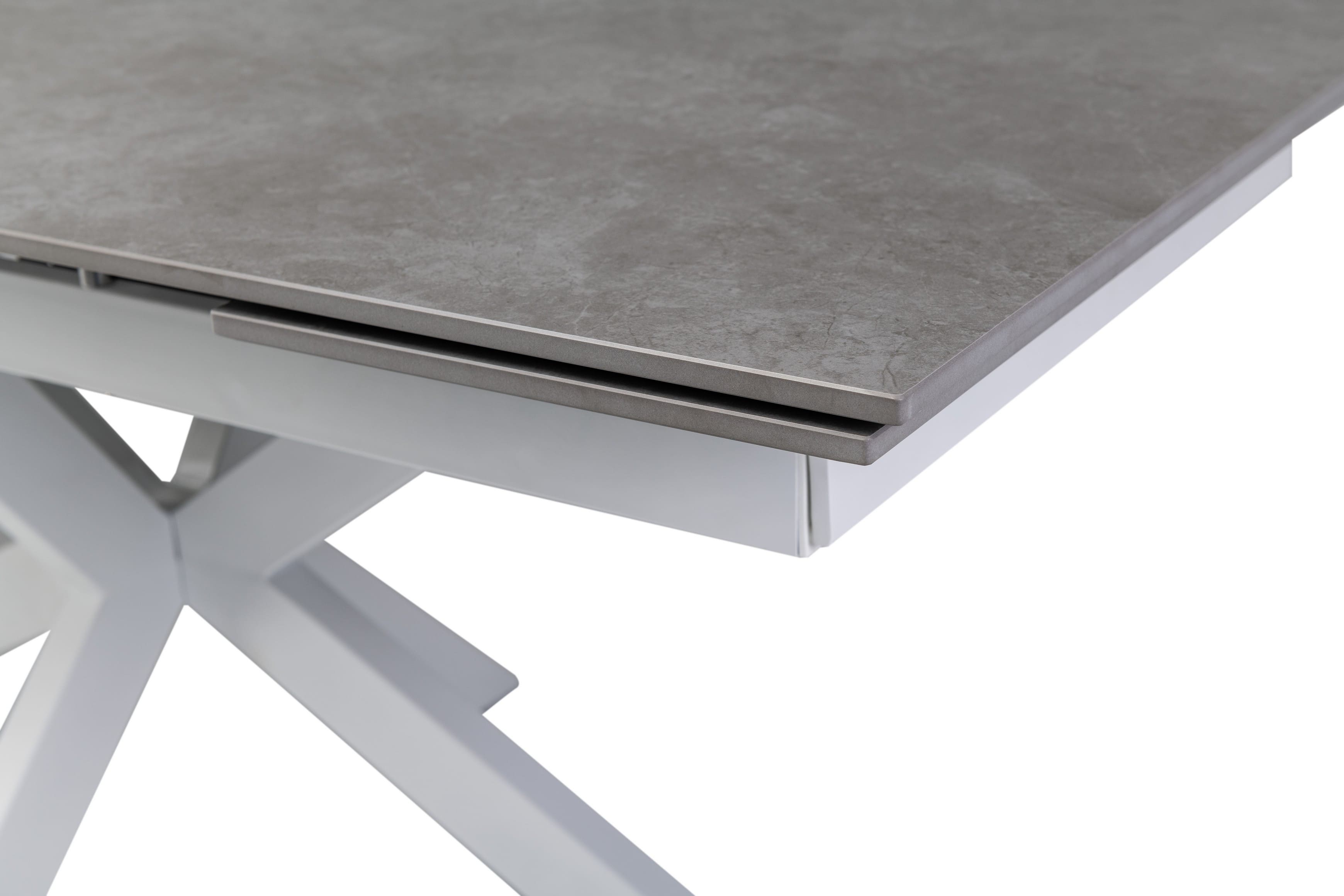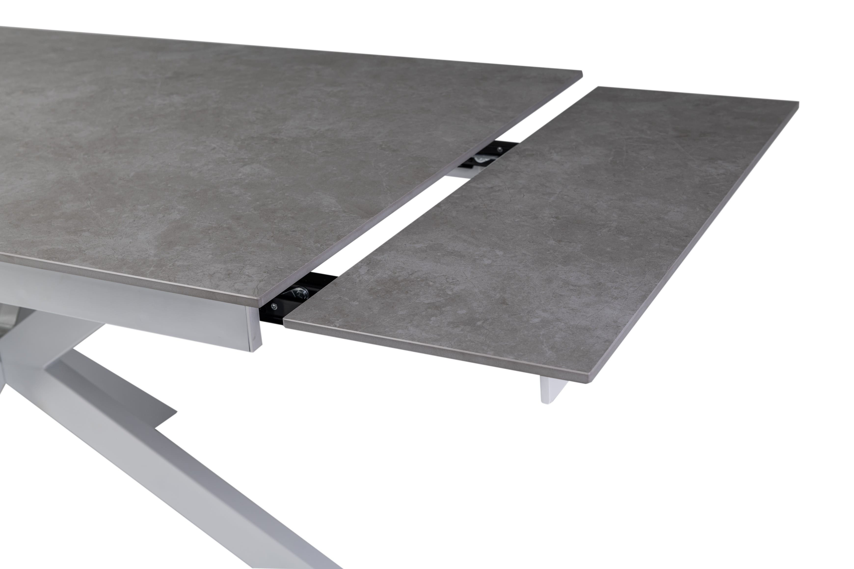 Стільниця виконана з матової кераміки кольору делікато грей, що не лише привабливо виглядає, але й відрізняється високою міцністю, стійкістю до подряпин, температурних впливів та вологи. Білий металевий каркас додає витонченості й надійно підтримує конструкцію.