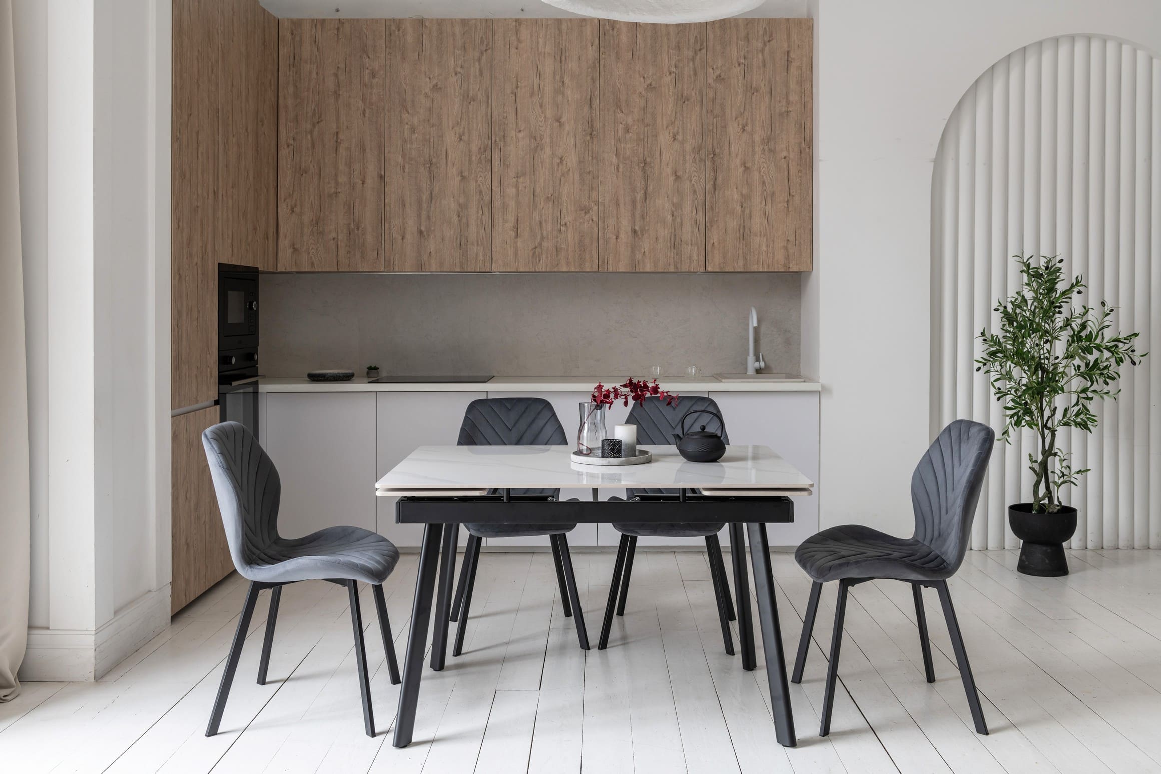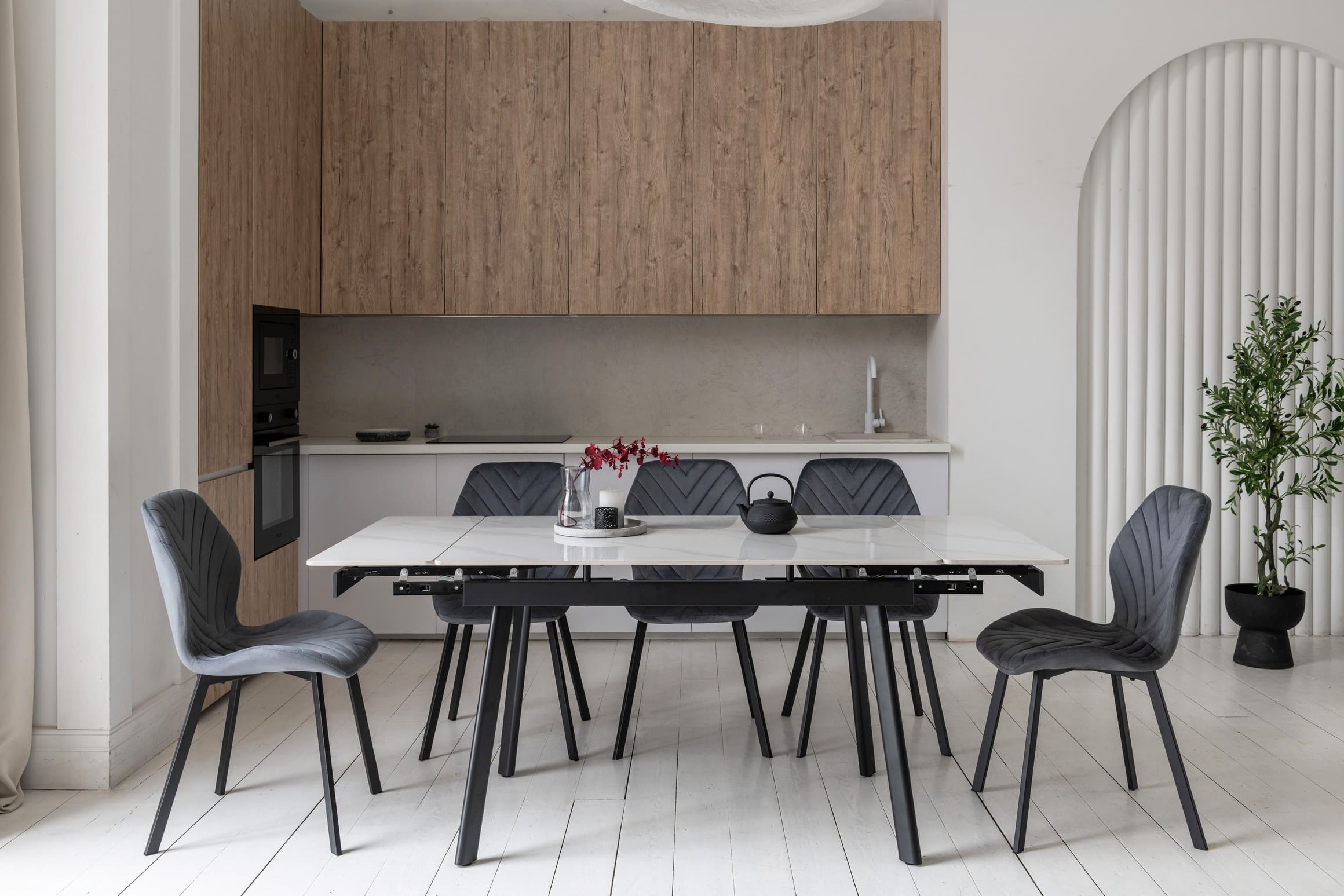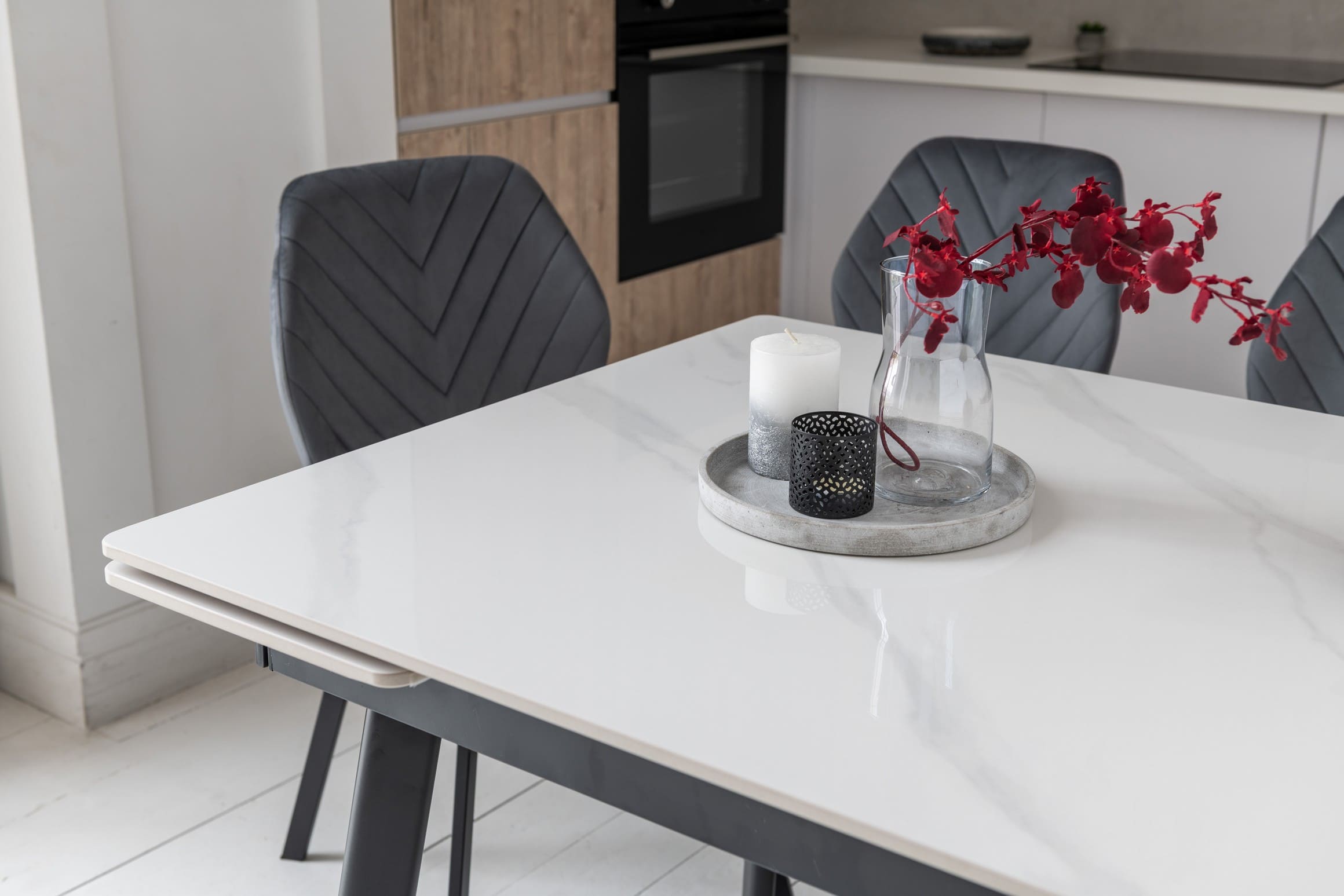 Прямокутна форма та глянцева поверхня стільниці додають простору світла та вишуканості, а контраст білого мармуру з чорною металевою основою створює виразний акцент в інтер’єрі.