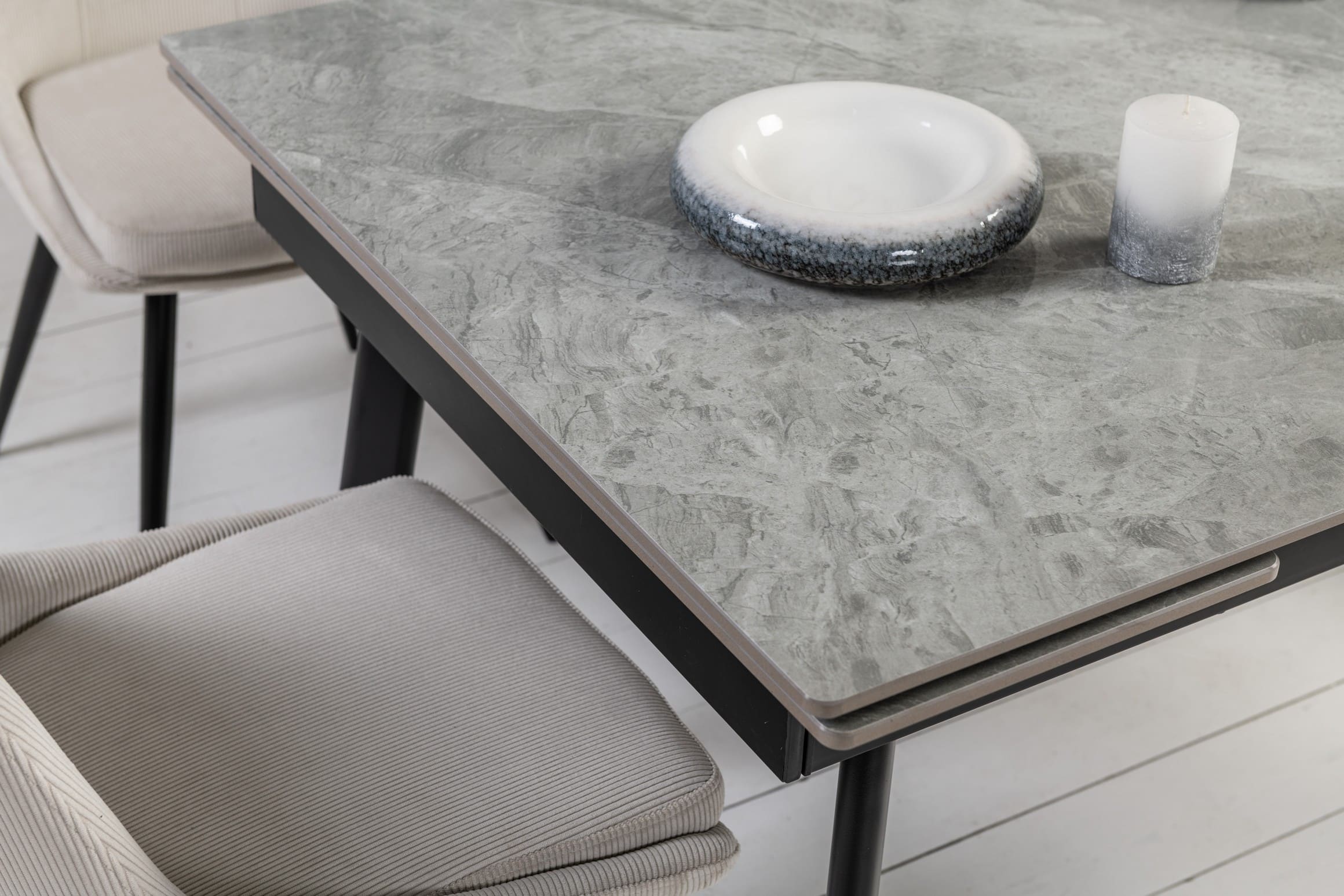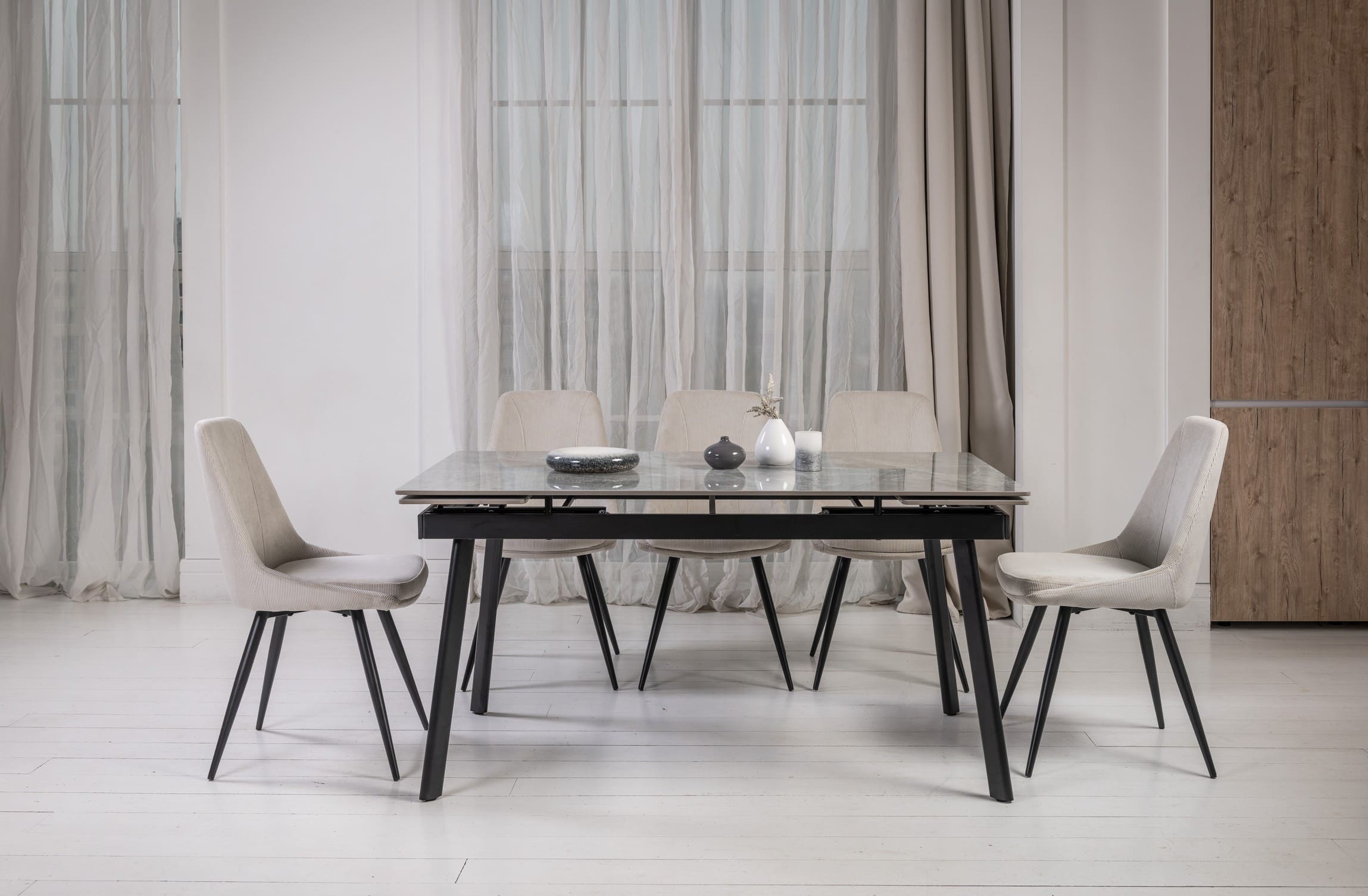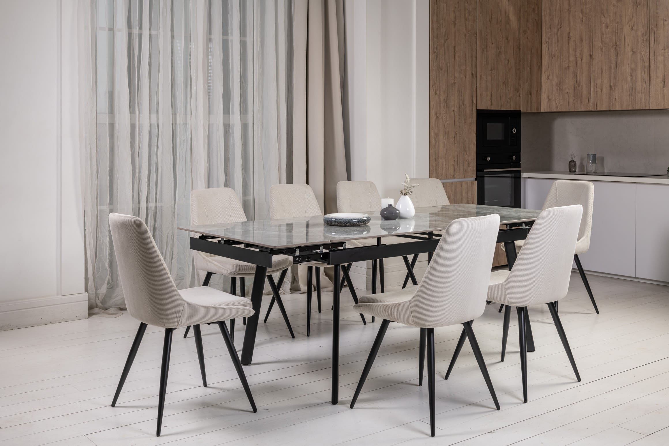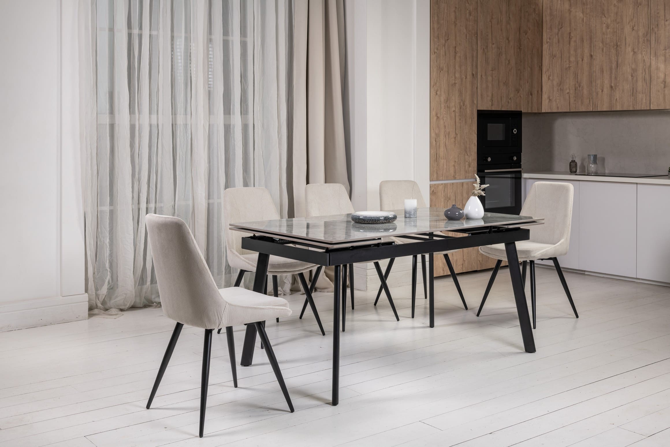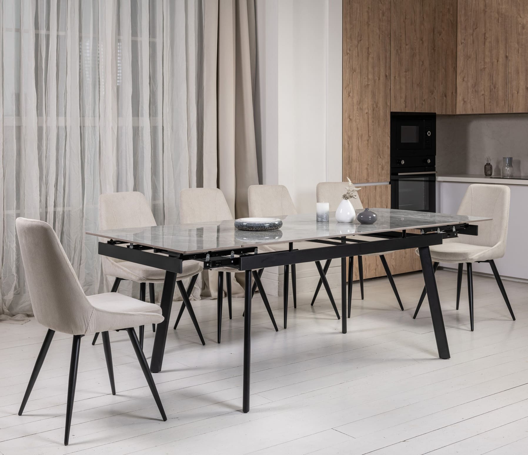 Завдяки боковому механізму розкладання стіл легко трансформується з 150 до 210 см, забезпечуючи комфортне розміщення гостей як у повсякденному житті, так і під час святкових подій. Глянцева керамічна стільниця стійка до високих температур, а міцна металева конструкція гарантує надійність і довговічність.