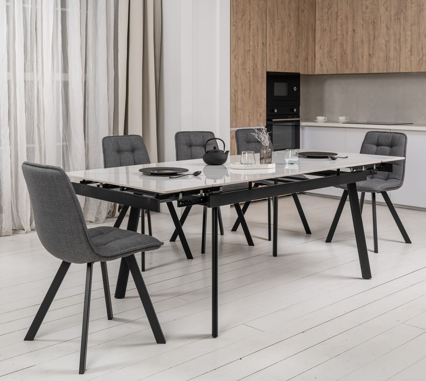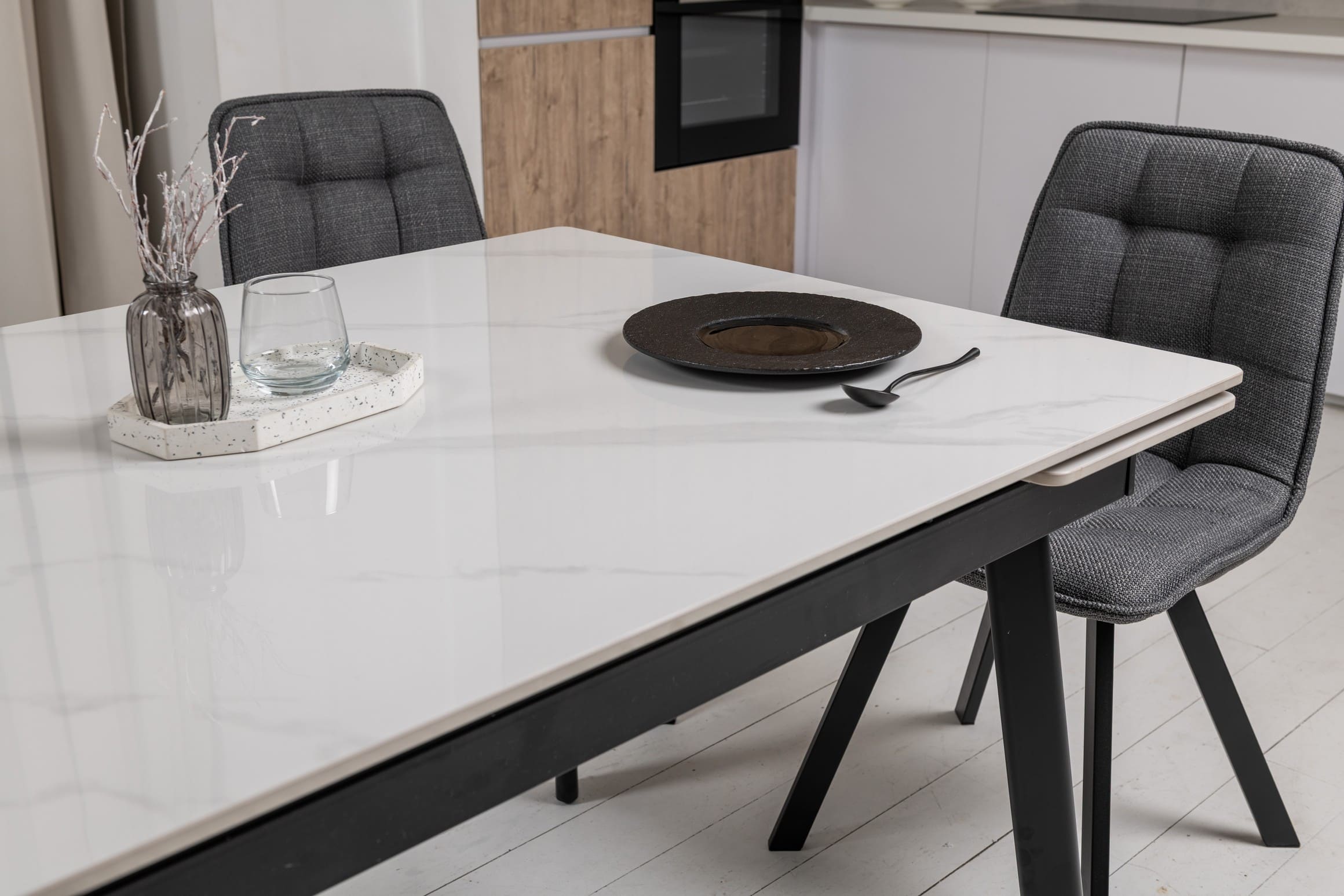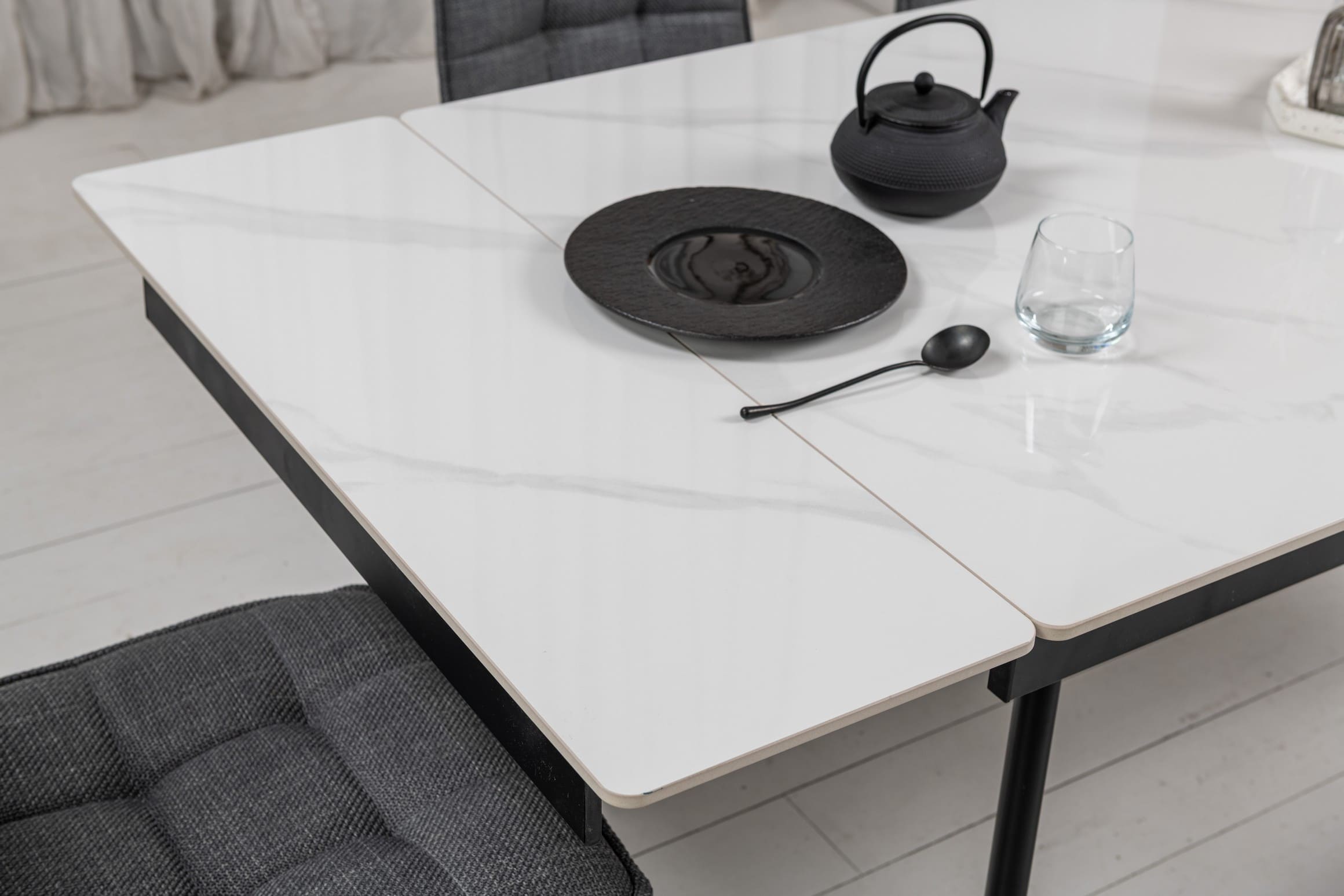 Прямокутна форма та глянцева керамічна стільниця з ефектом білого мармуру додають простору світла й елегантності, а чорна металева основа створює стильний контраст і підкреслює сучасний характер моделі.