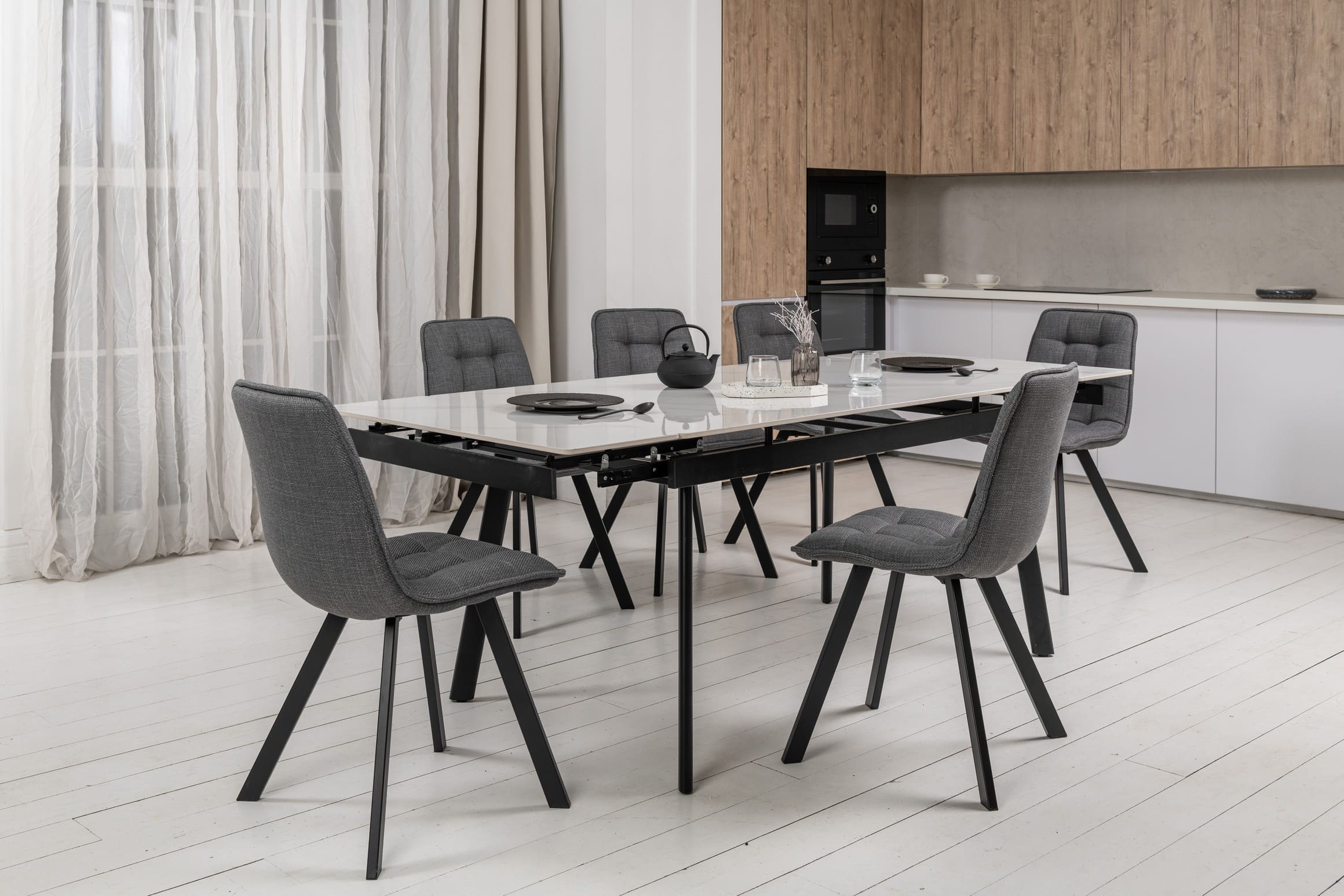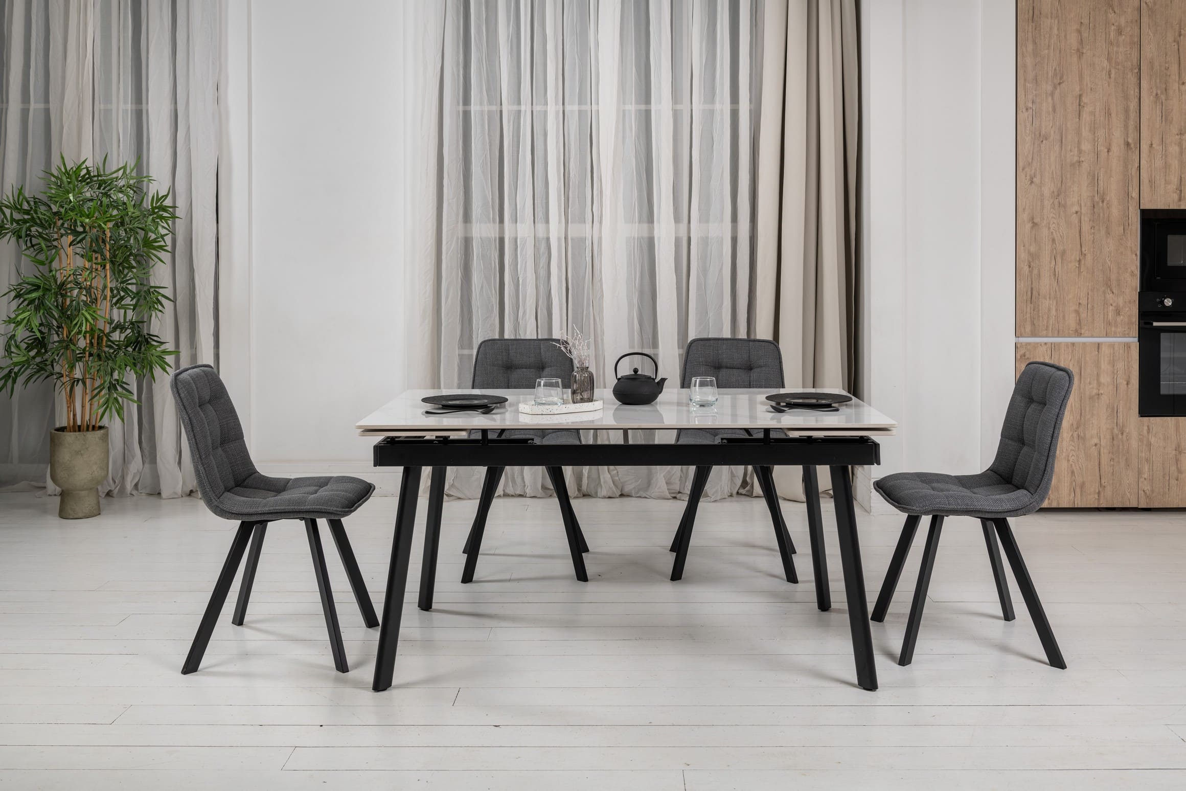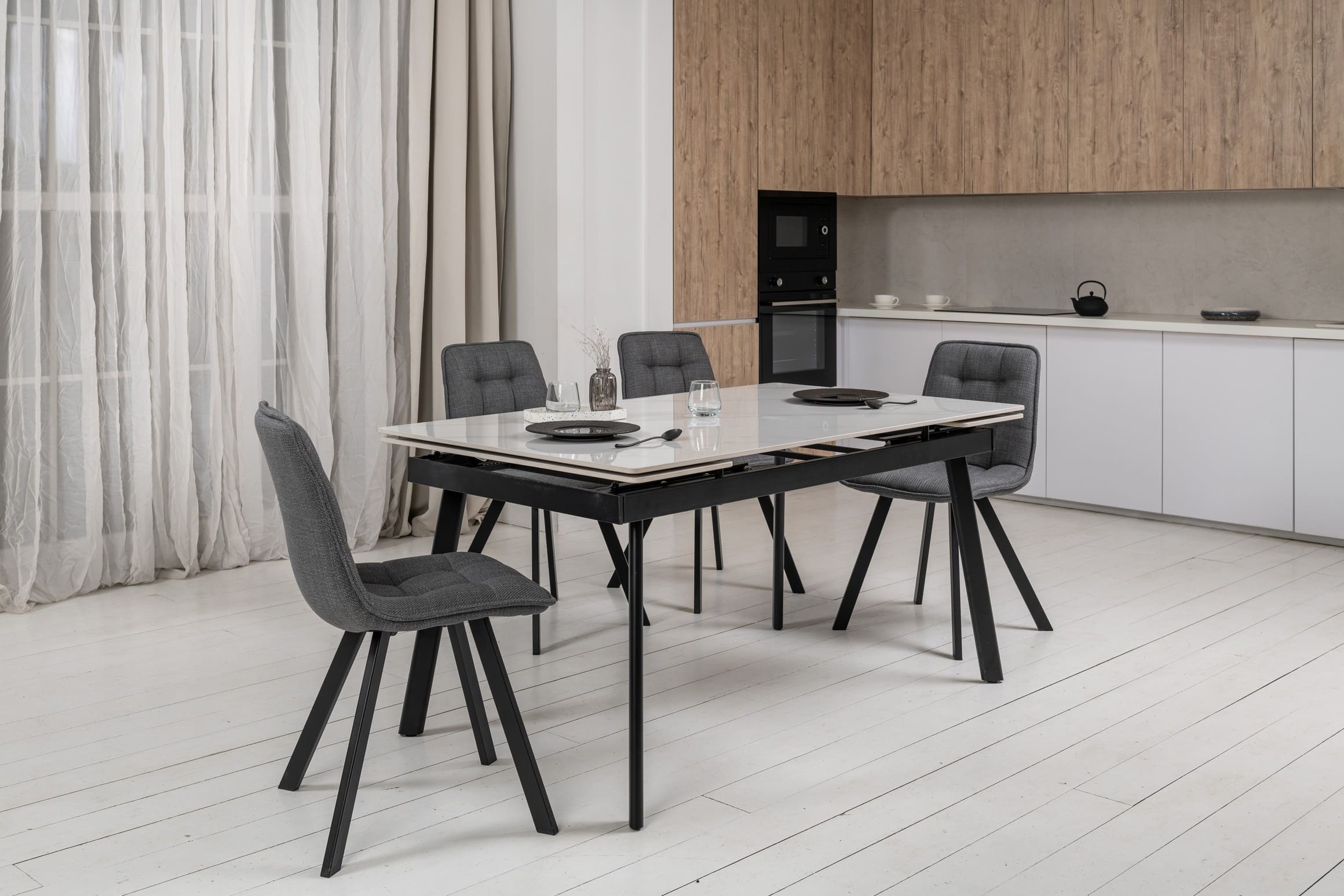 Прямокутна форма та глянцева керамічна стільниця з ефектом білого мармуру додають простору світла й елегантності, а чорна металева основа створює стильний контраст і підкреслює сучасний характер моделі.