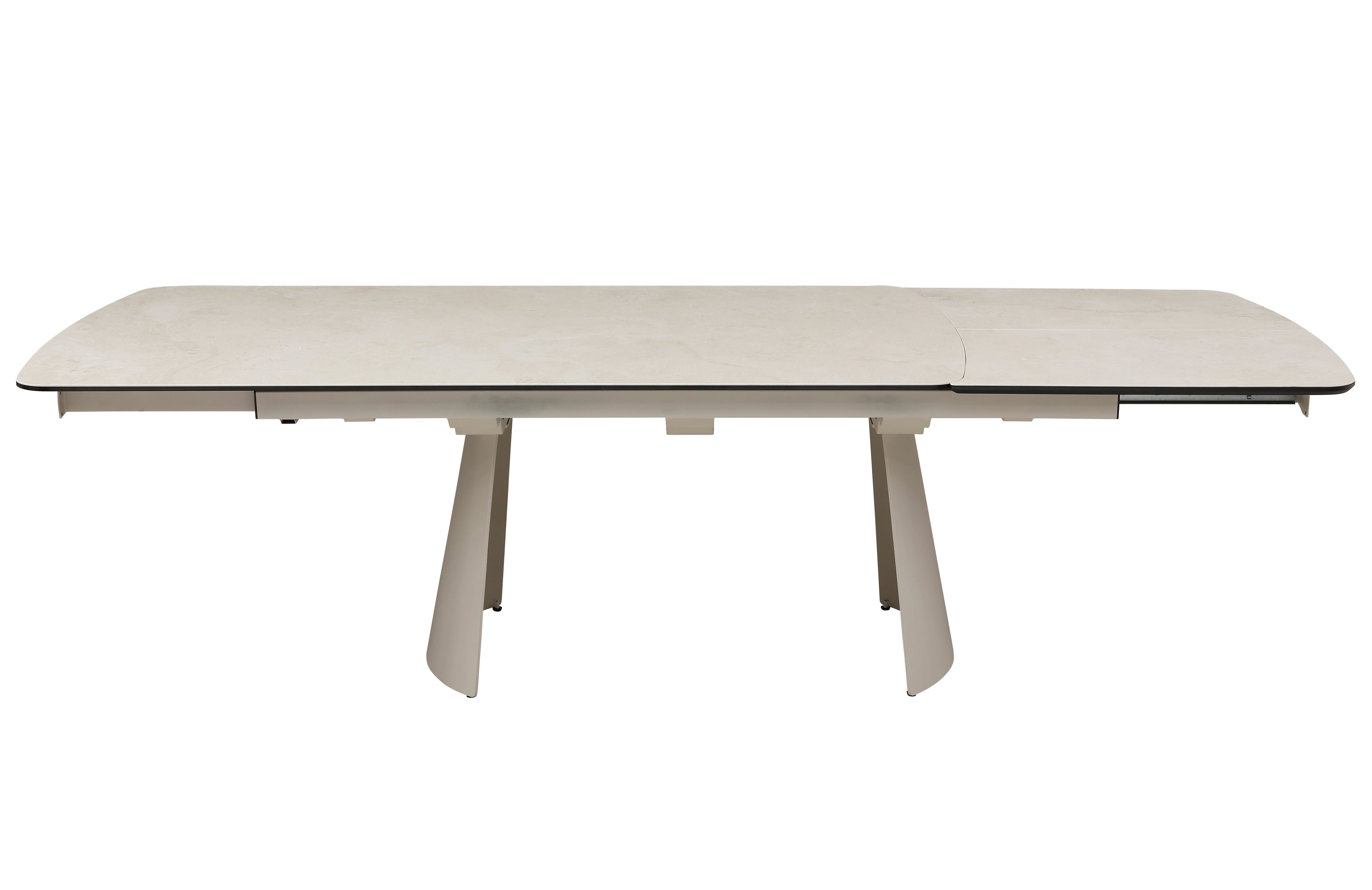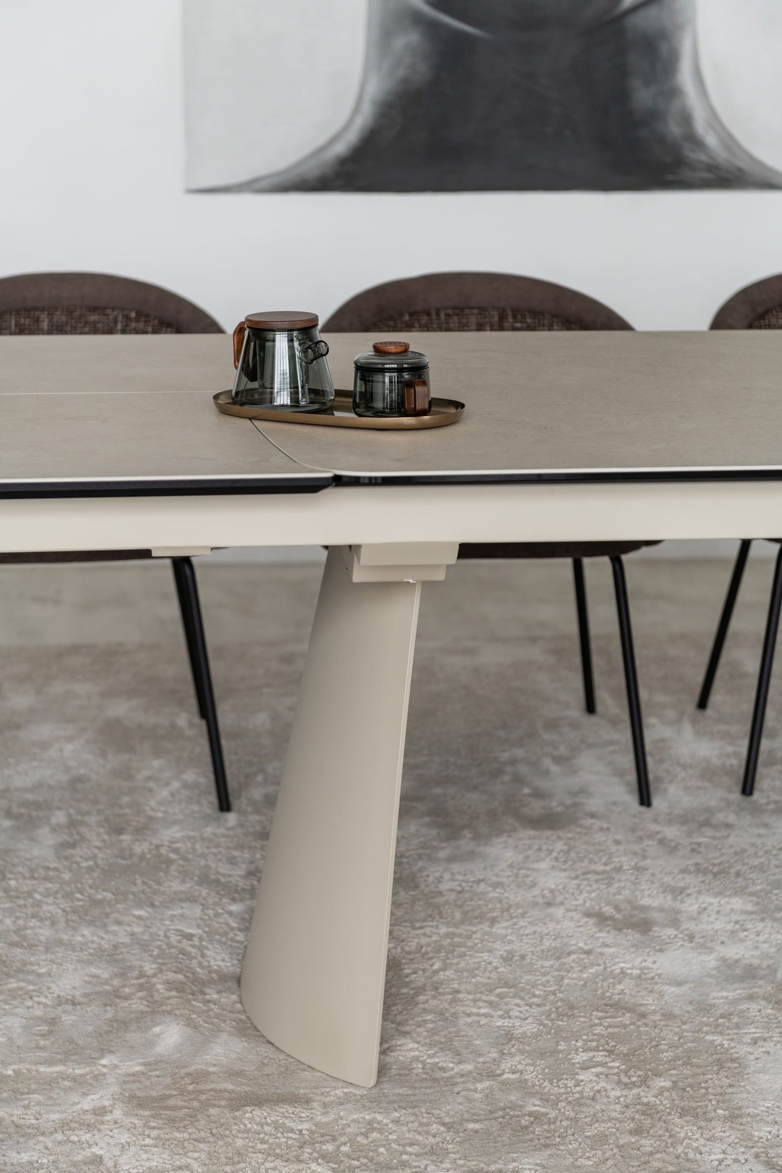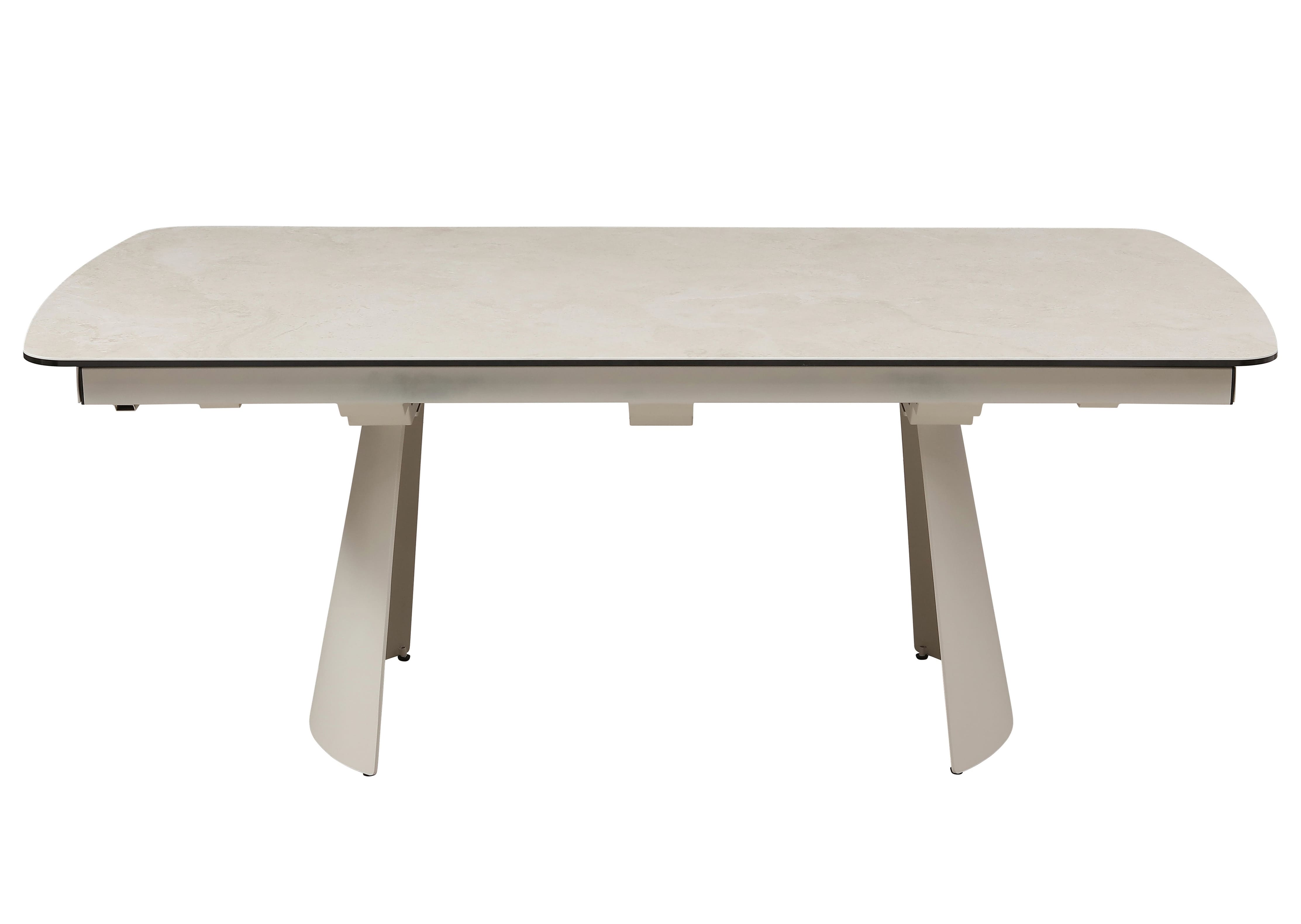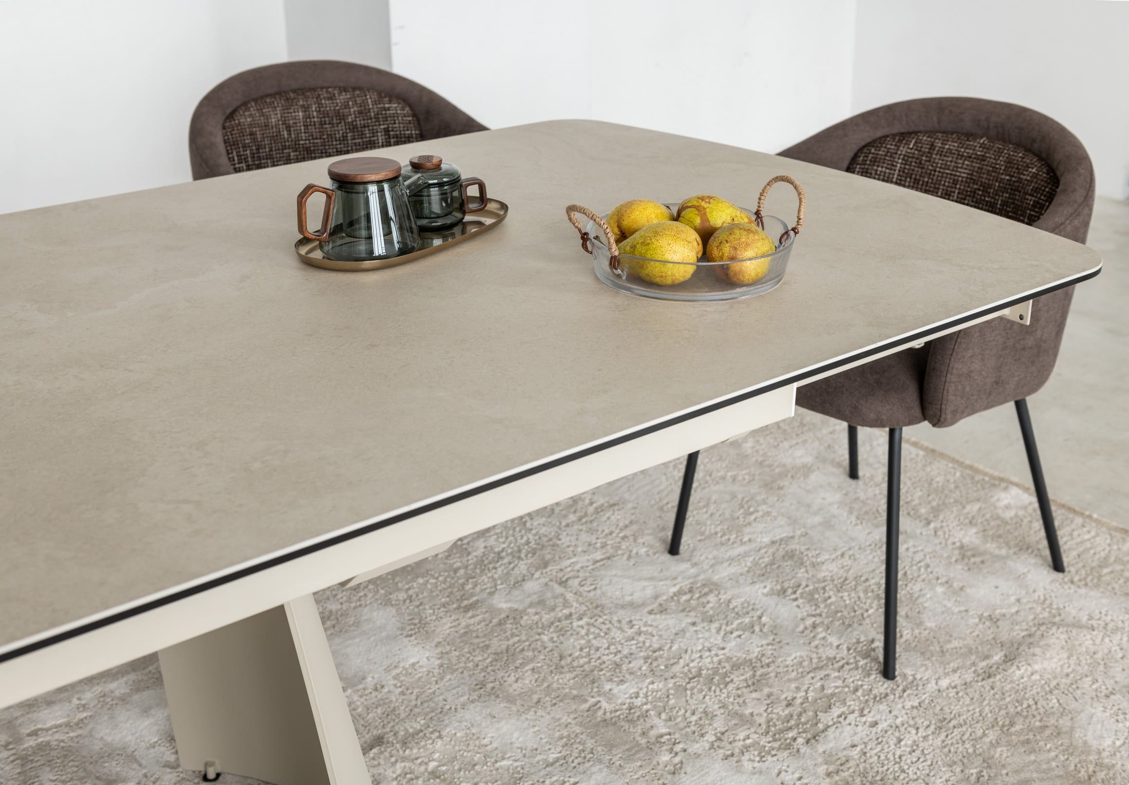 Його стільниця з матової кераміки в поєднанні з гартованим склом в благородному відтінку делікато беж виглядає вишукано й водночас стримано, даруючи простору світло, гармонію та відчуття затишку. Міцна металева основа, пофарбована в тон, створює цілісний образ та підкреслює сучасний характер моделі.