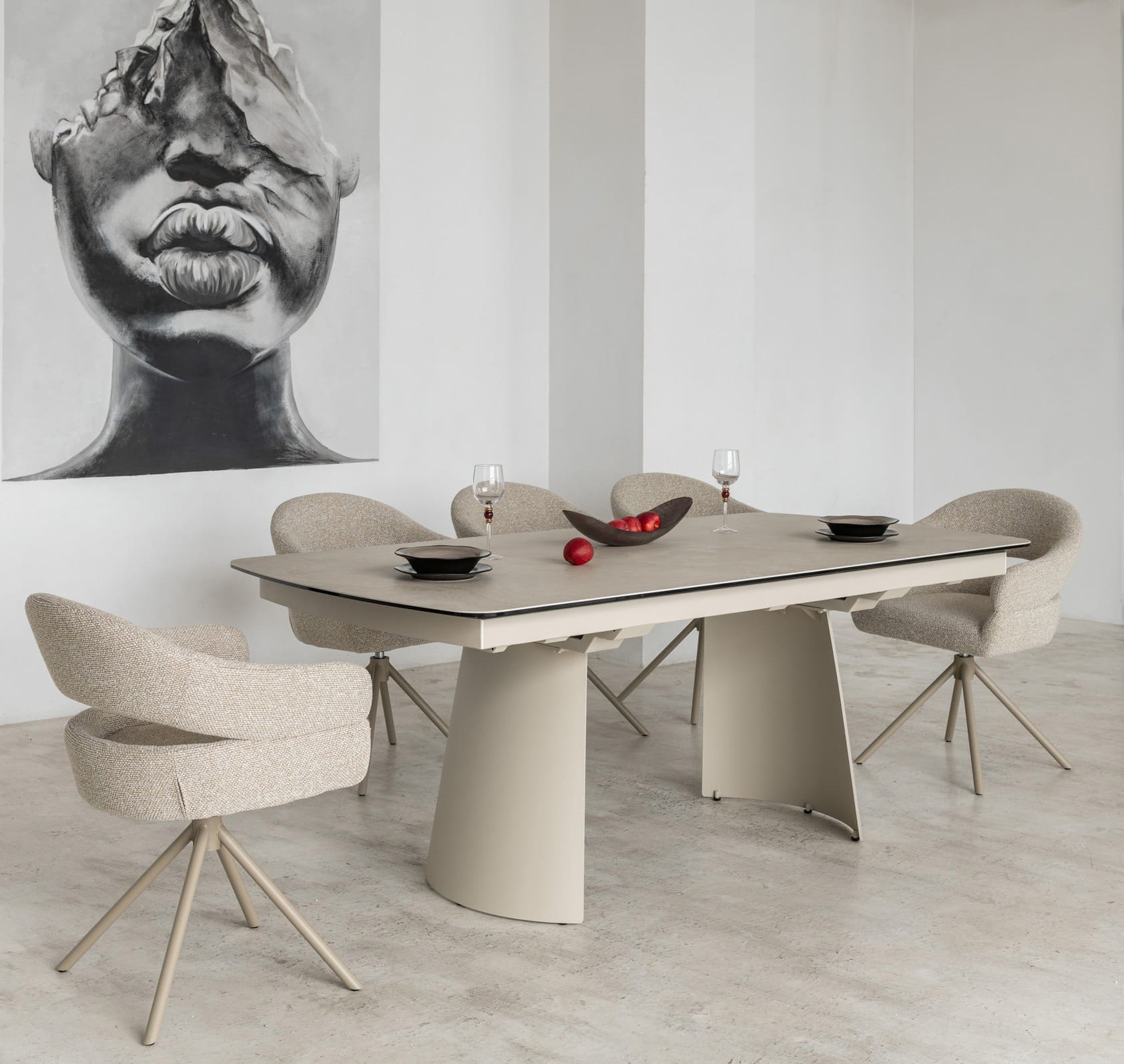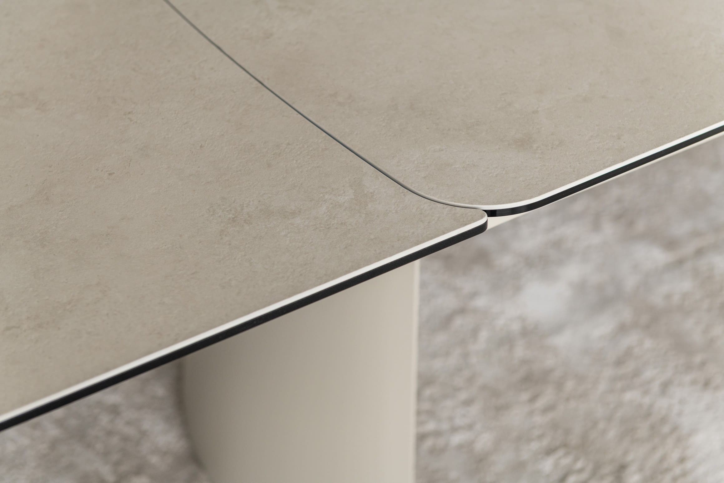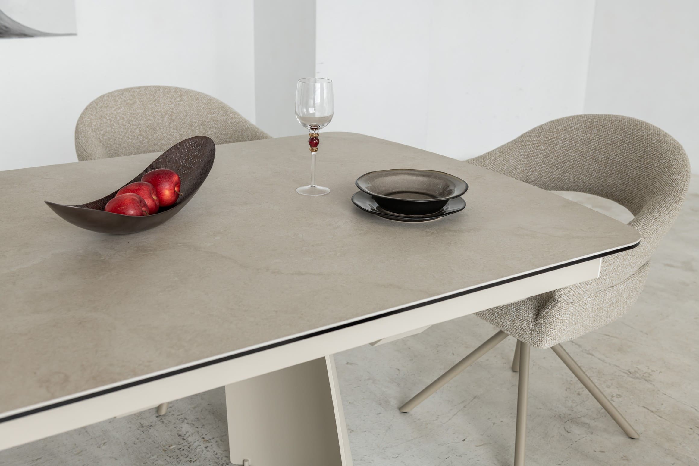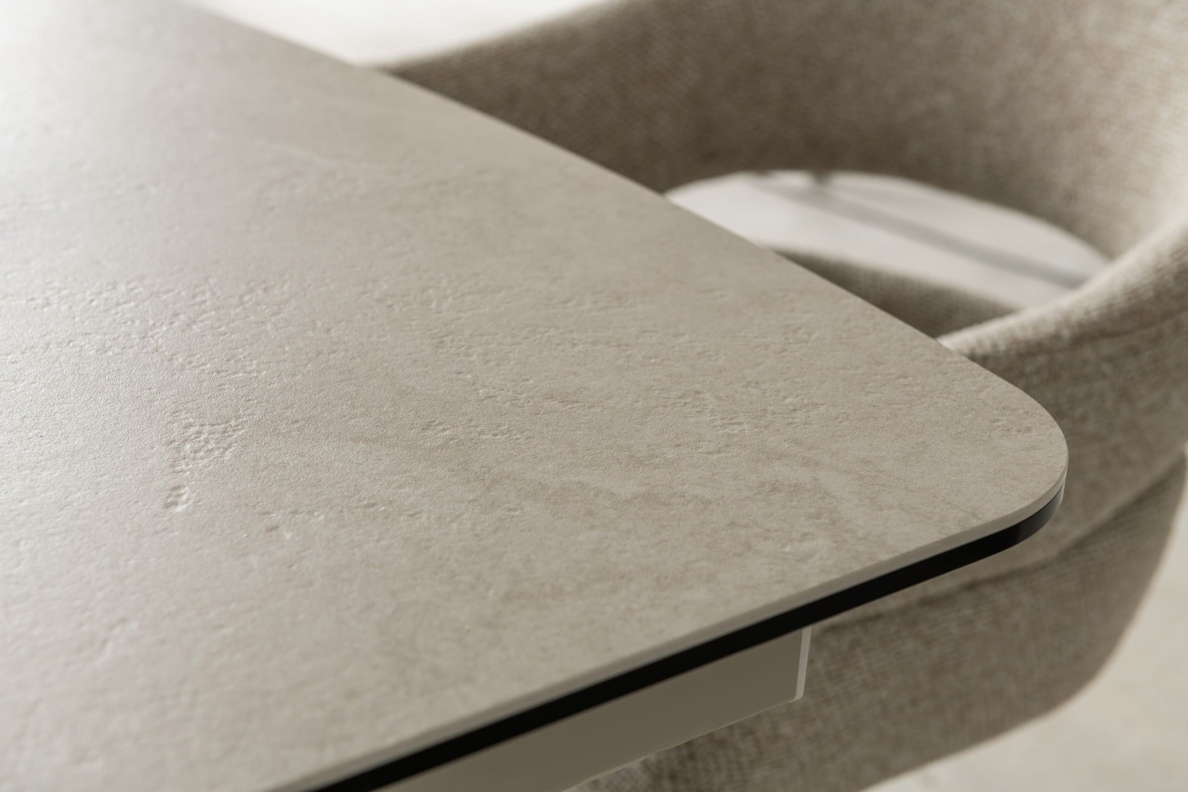 Його стільниця з матової кераміки в поєднанні з гартованим склом в благородному відтінку делікато беж виглядає вишукано й водночас стримано, даруючи простору світло, гармонію та відчуття затишку. Міцна металева основа, пофарбована в тон, створює цілісний образ та підкреслює сучасний характер моделі.